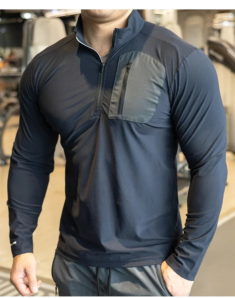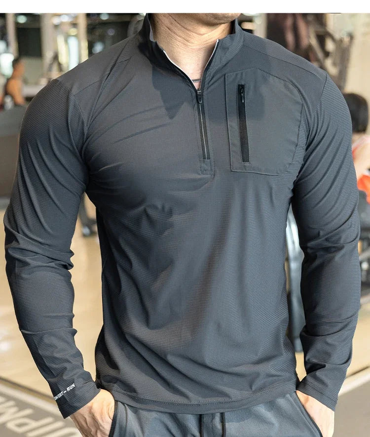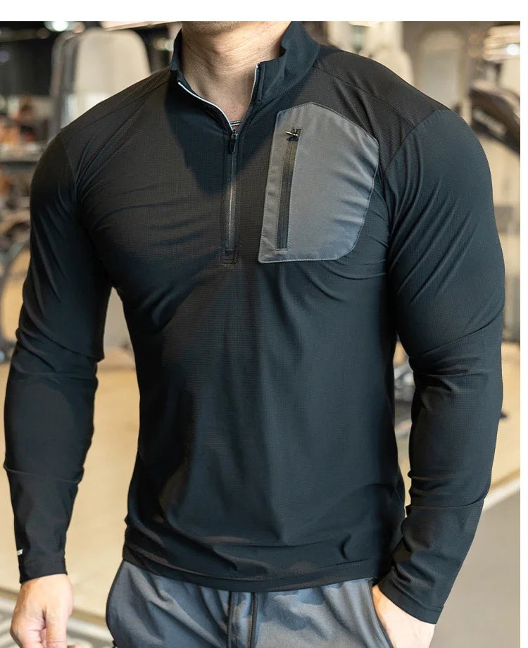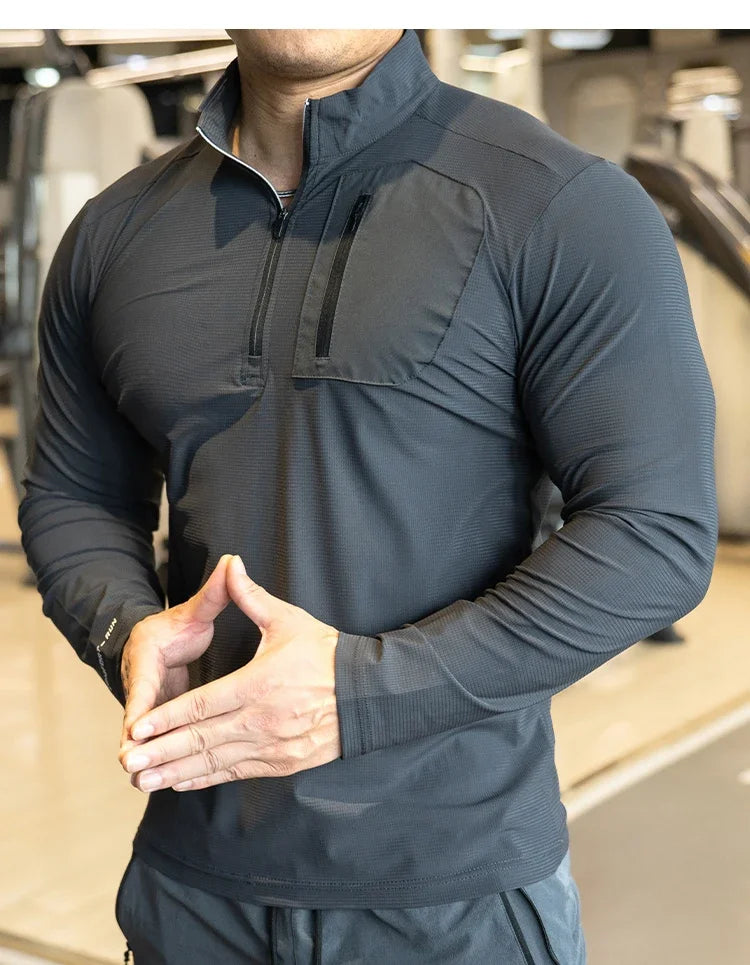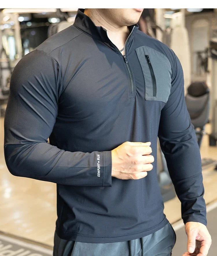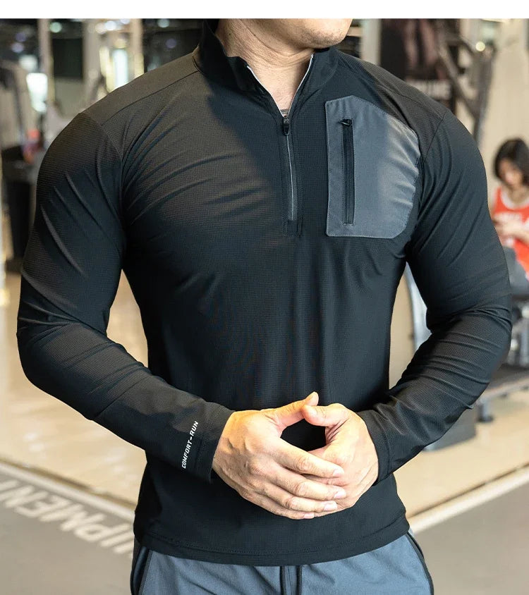 Men's Muscle Workout Sportswear Long Sleeve Running Clothing with Half Zip with Pockets Sports Gym Fitness Compression Shirt