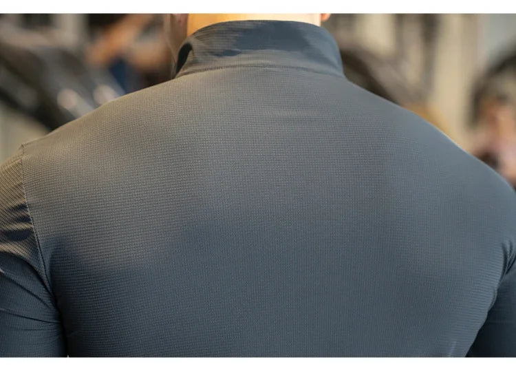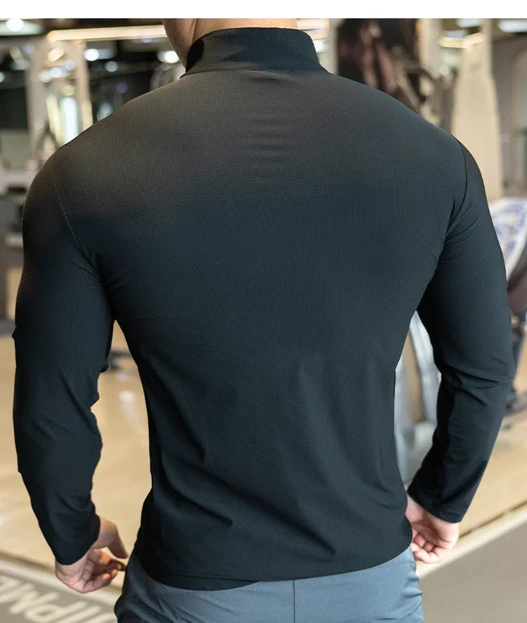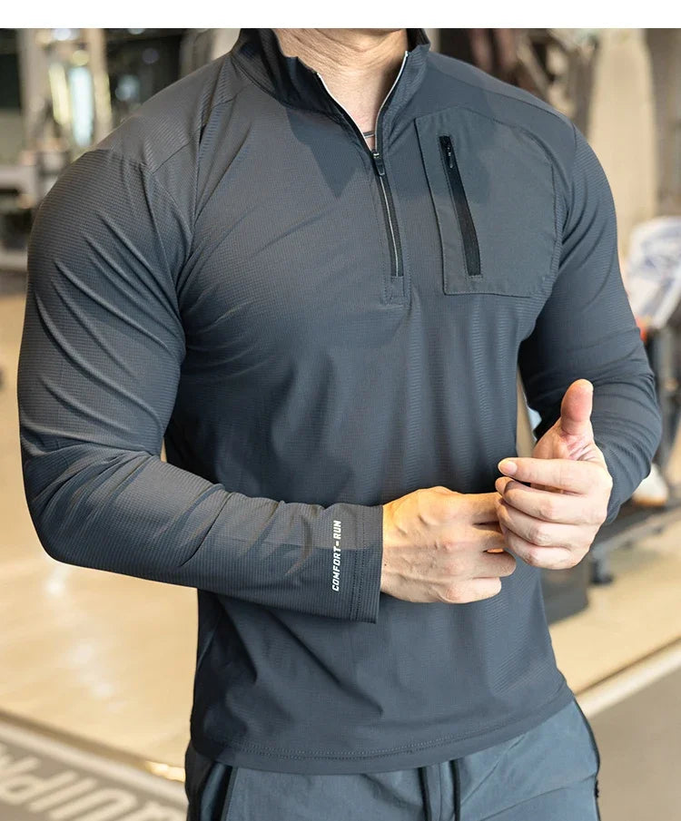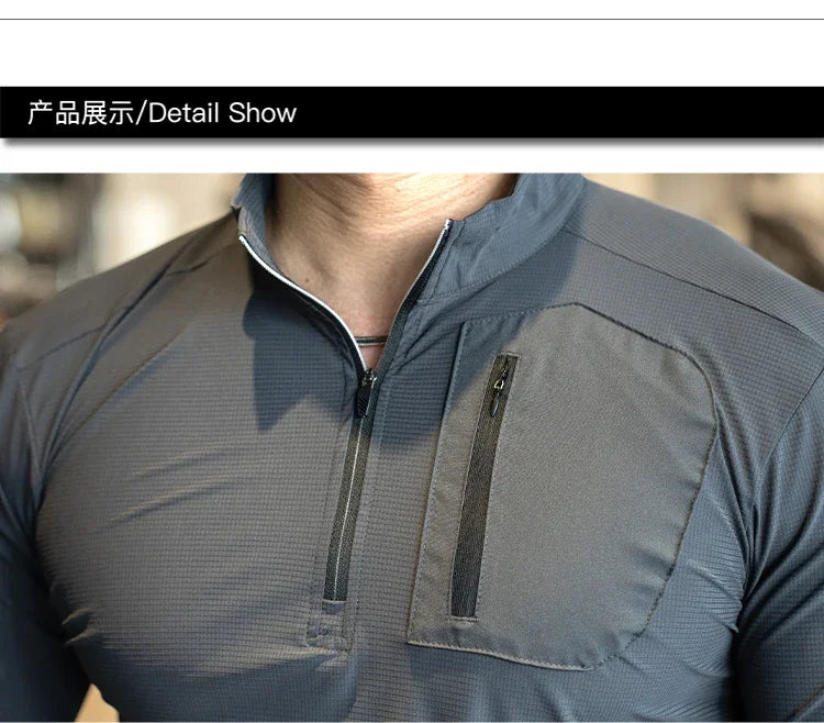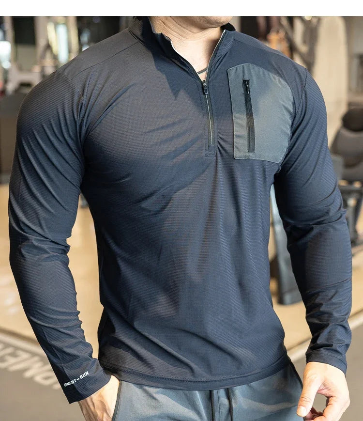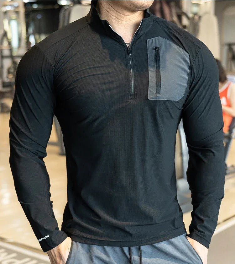Men's Muscle Workout Sportswear Long Sleeve Running Clothing with Half Zip with Pockets Sports Gym Fitness Compression Shirt