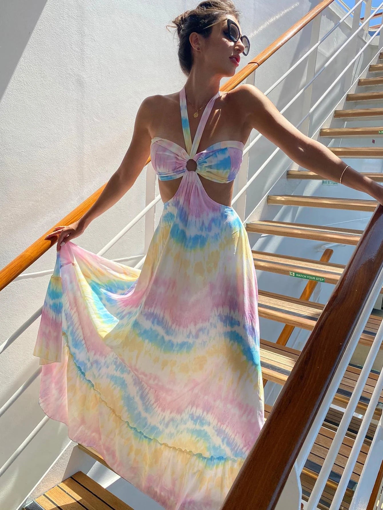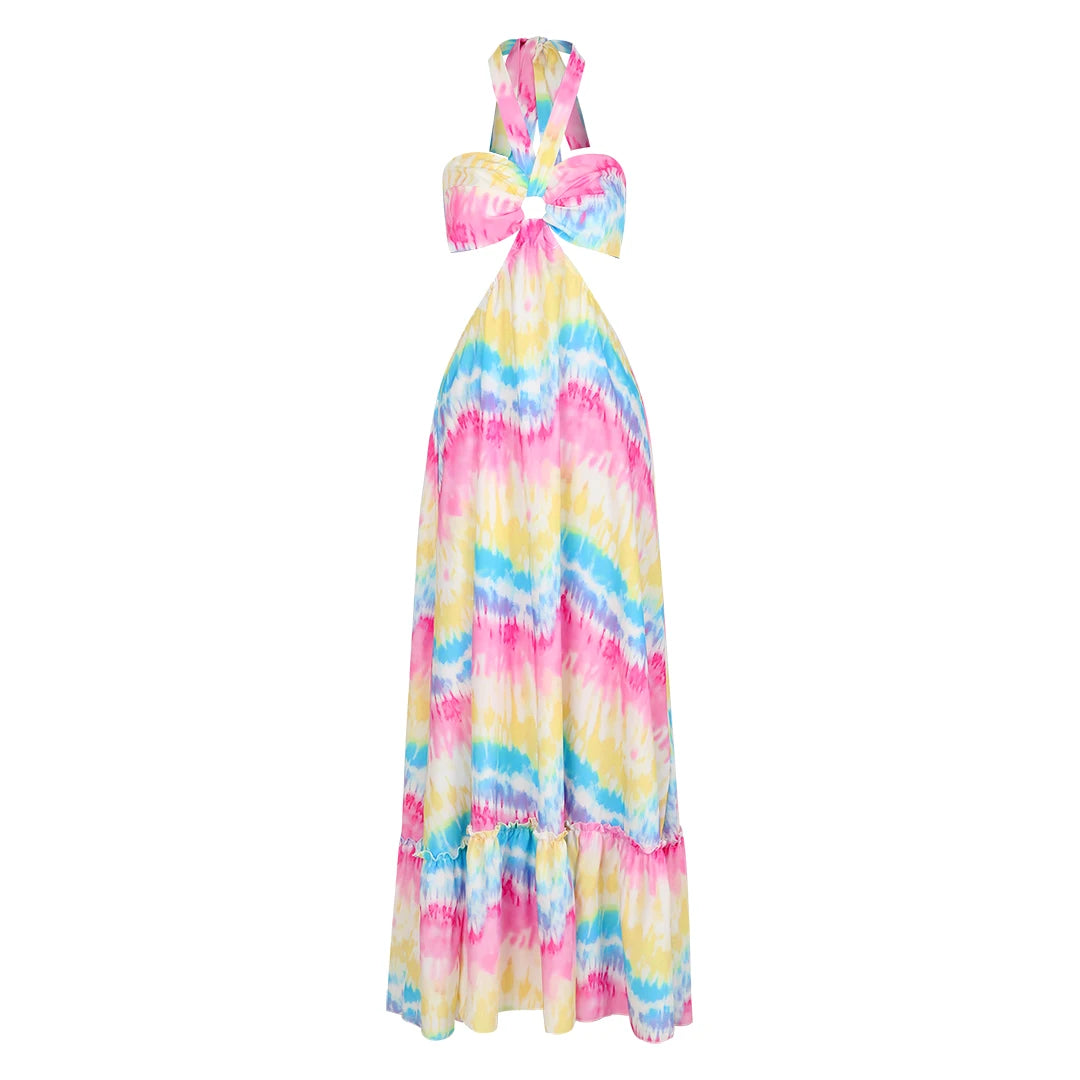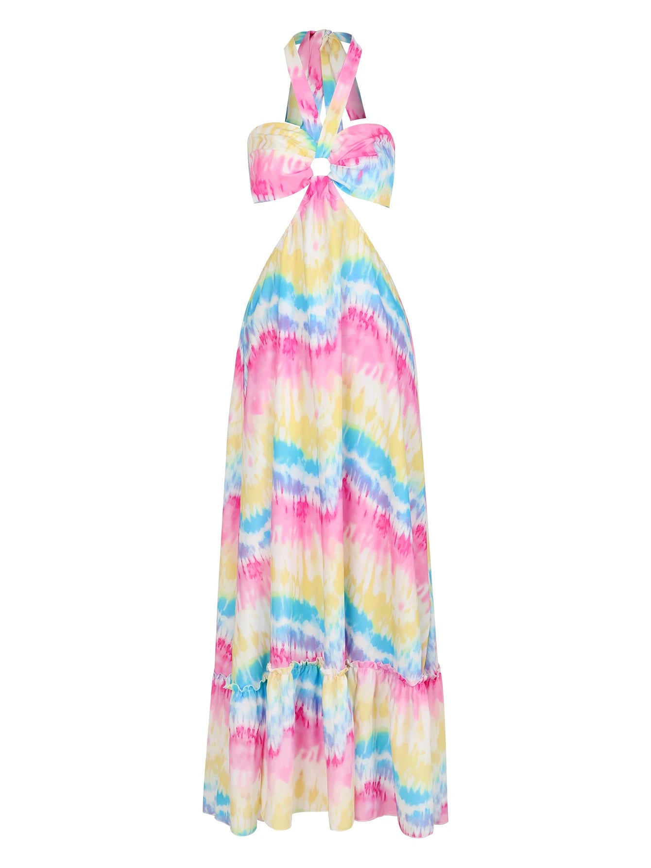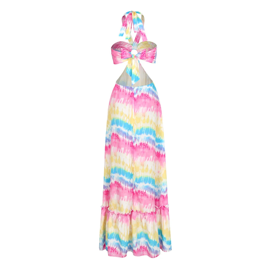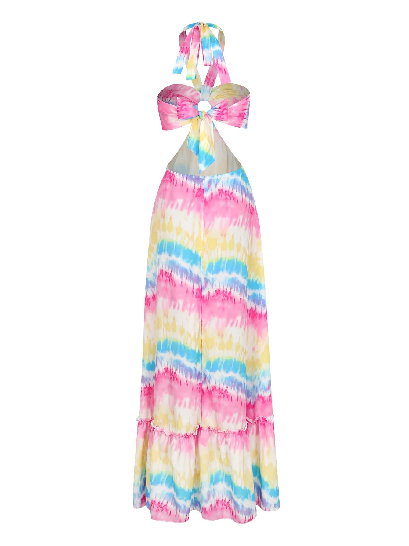 Women's Colourful Print Halter Tie Up Strapless Naked Waist A-line Maxi Summer Dress