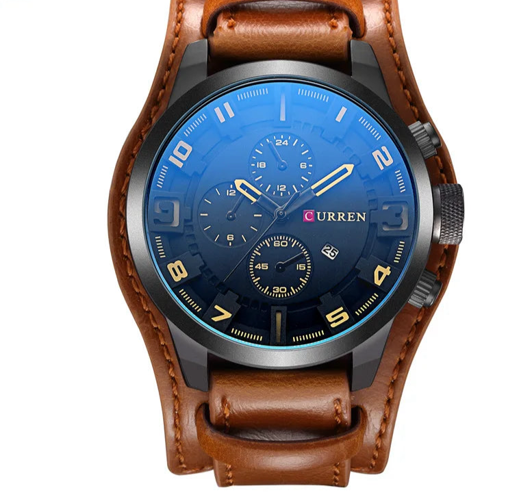 Men's Leather Strap Quartz Watch - Casual Sports Wristwatch with Date Display