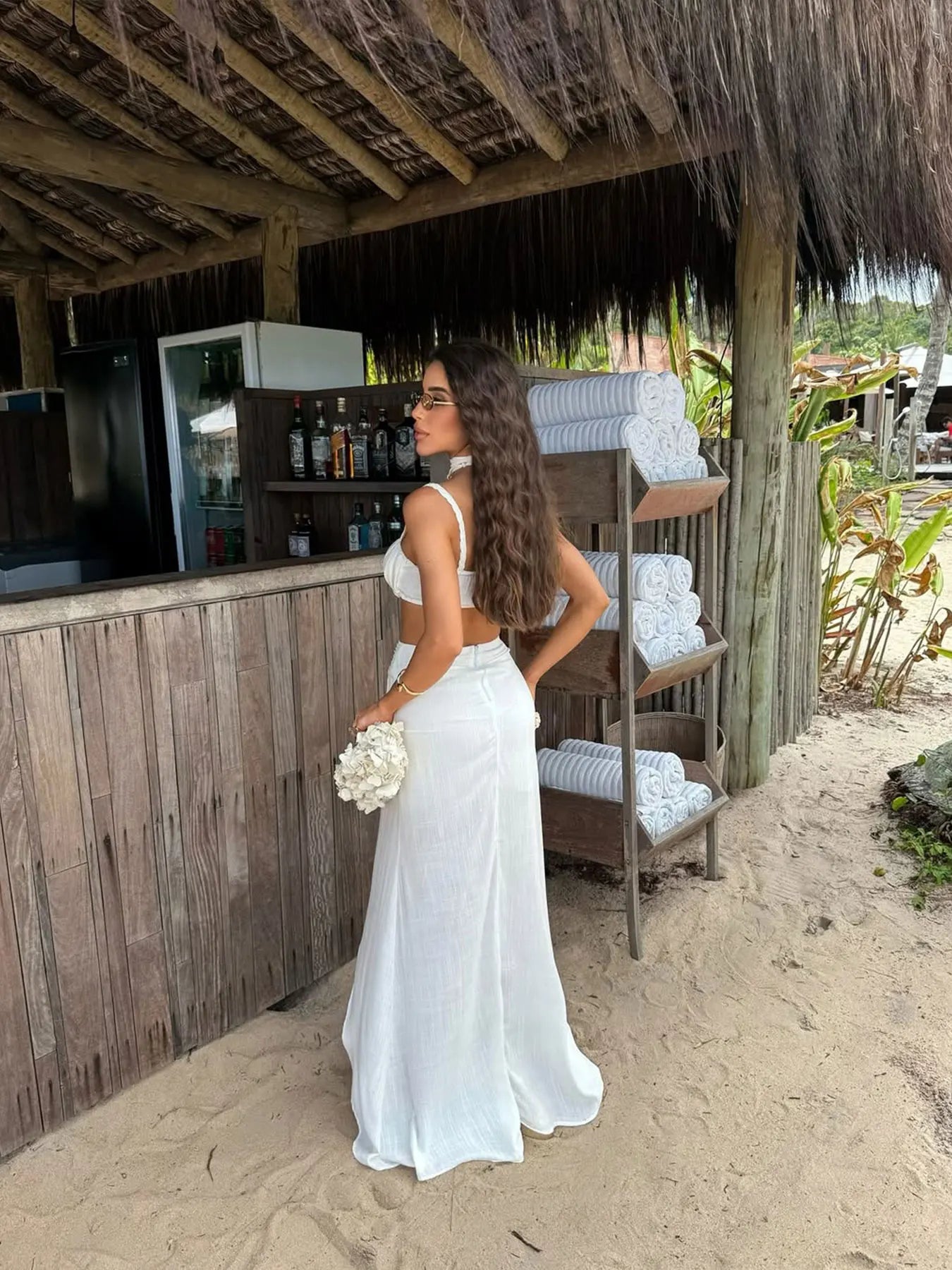 Embrace feminine elegance with this stunning 3-piece crochet knit set featuring a bandage-style sleeveless top and flowing maxi skirt. Perfect for summer occasions, this chic ensemble combines comfort with sophisticated style for a truly captivating look.