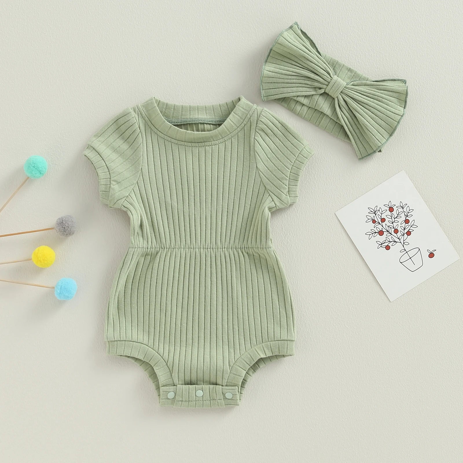 Newborn Baby Girl Romper Set - Short Sleeve Jumpsuit with Bow Headband (3 Colours)