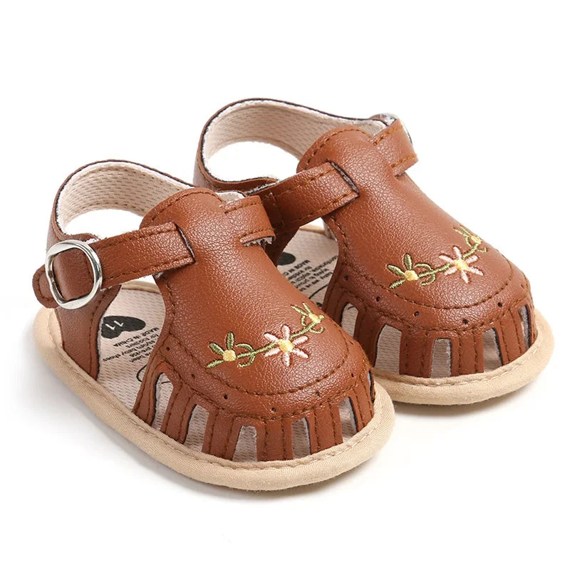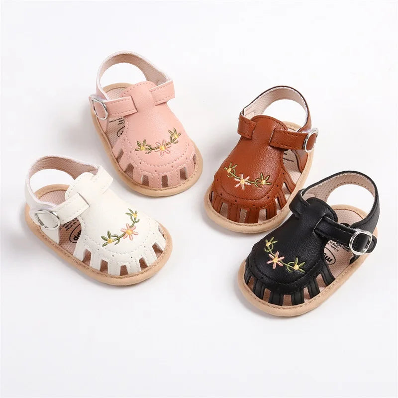 Newborn Baby Sandals PU Leather Non-slip Flower Embroidery Summer Flats Shoes