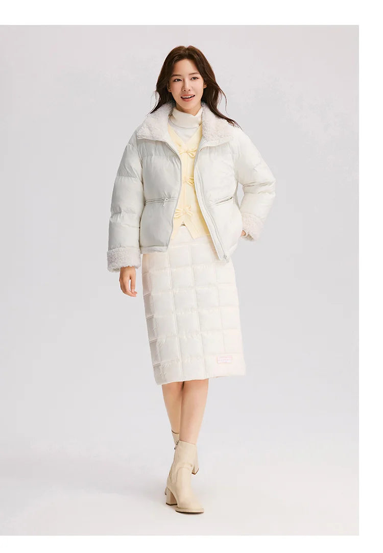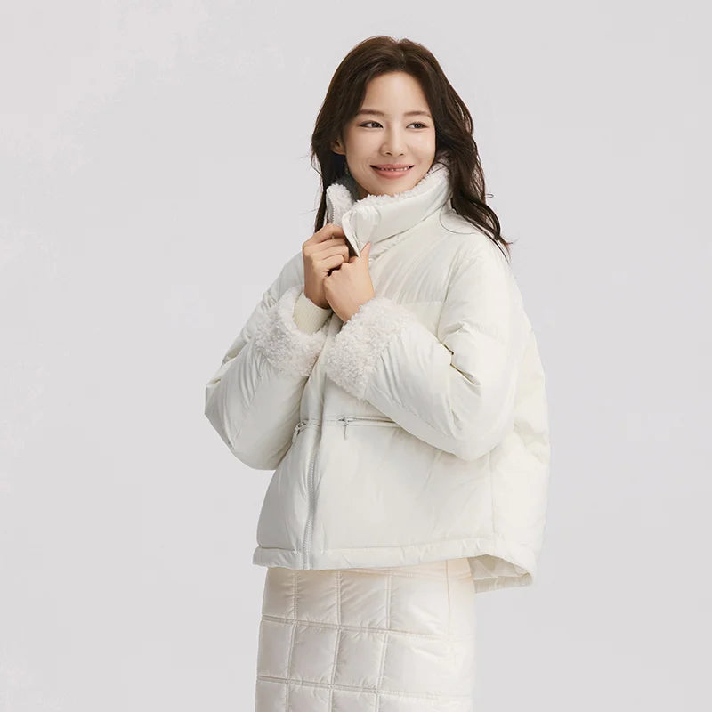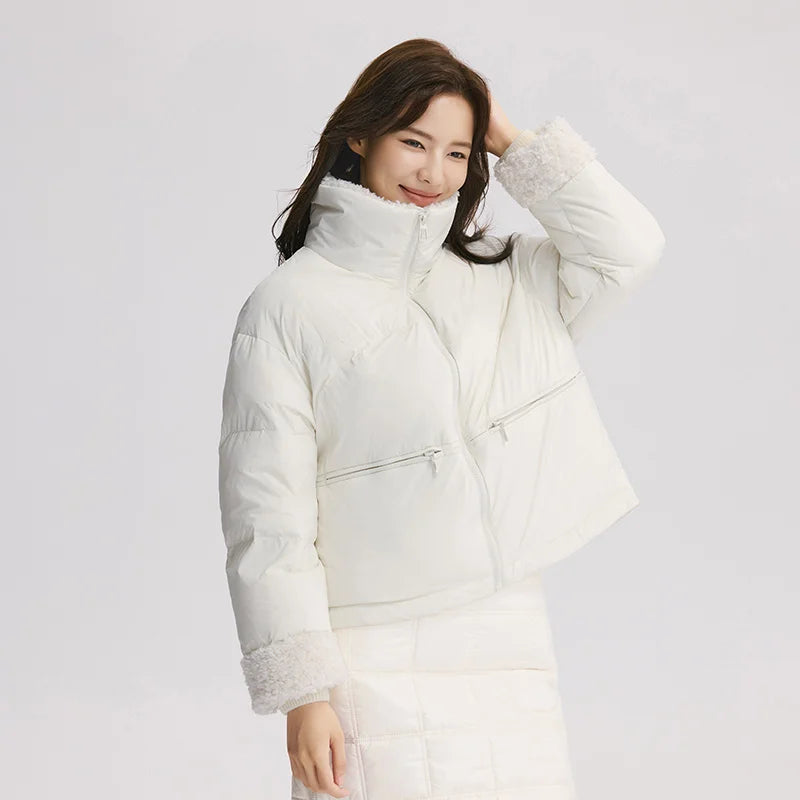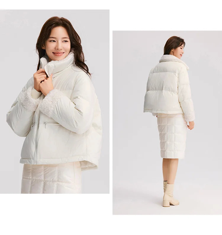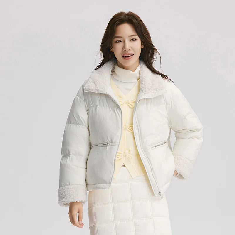 Experience luxury and warmth with this exquisite down jacket featuring soft imitation lamb wool details and sophisticated patchwork design. Perfect for the discerning woman who values both comfort and refined style.
