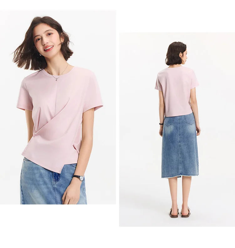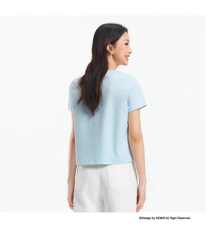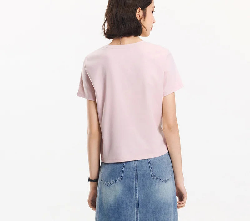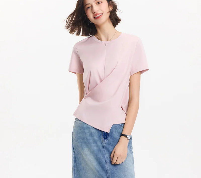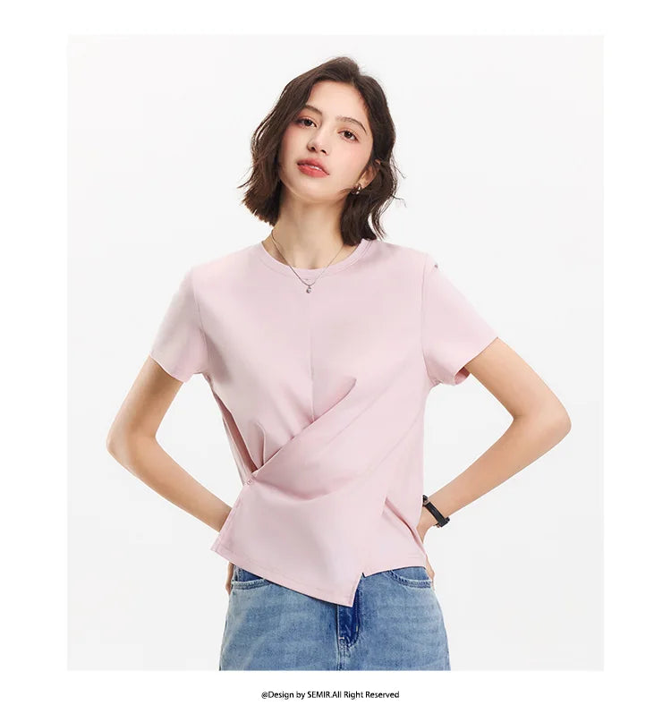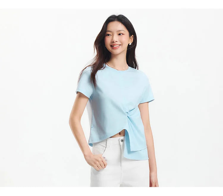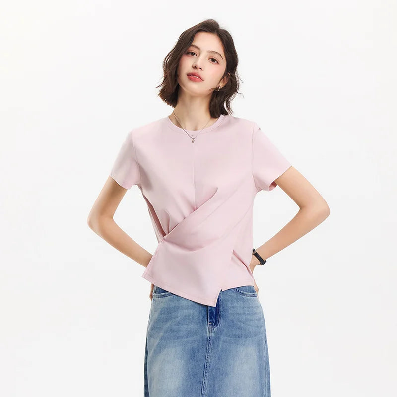 Discover the perfect balance of casual comfort and chic style with this cropped cotton t-shirt. Featuring a unique split hem design and relaxed fit, this versatile summer top effortlessly transitions from laid-back days to stylish evenings.