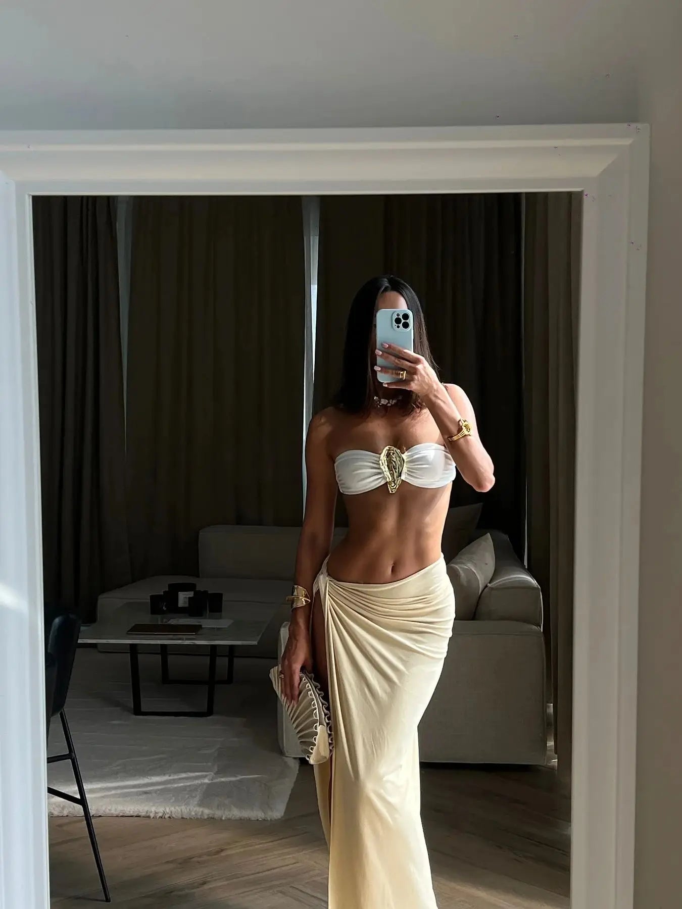 - Three-piece set: top, high-waist bottoms, and skirt