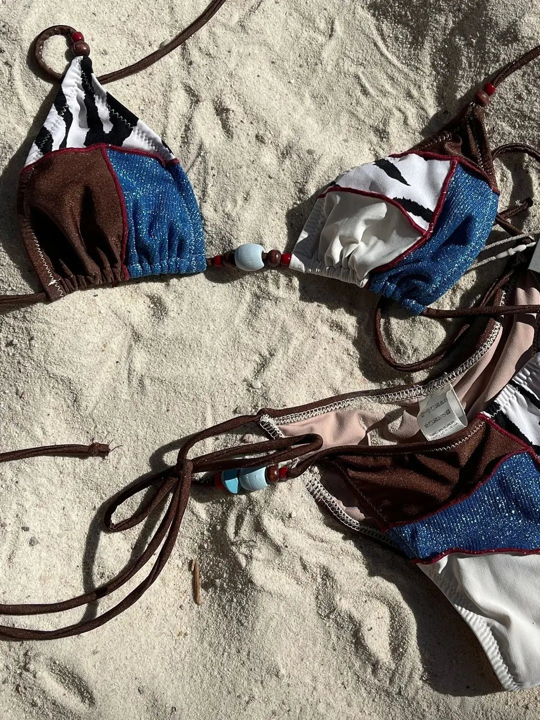 Experience the perfect blend of elegance and comfort with this beautifully crafted bikini set. The delicate bead embellishments add a luxurious touch whilst the V-neck halter design creates a flattering silhouette. Perfect for making a sophisticated statement at beach resorts, pool parties, or romantic getaways.