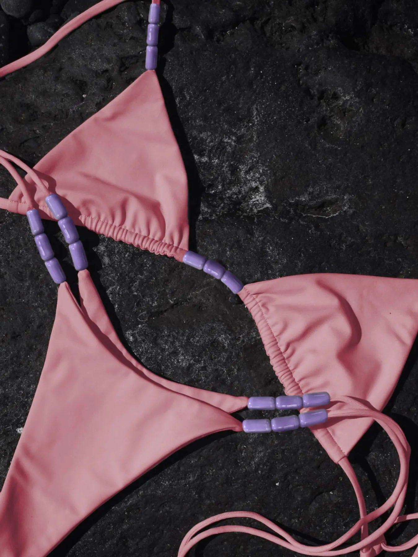 Make a stunning impression poolside or at the beach with this elegant deep V-cut halter bikini featuring delicate beaded details and flattering thin straps. The sophisticated design combines comfort with allure, perfect for confident women who appreciate refined swimwear styling.