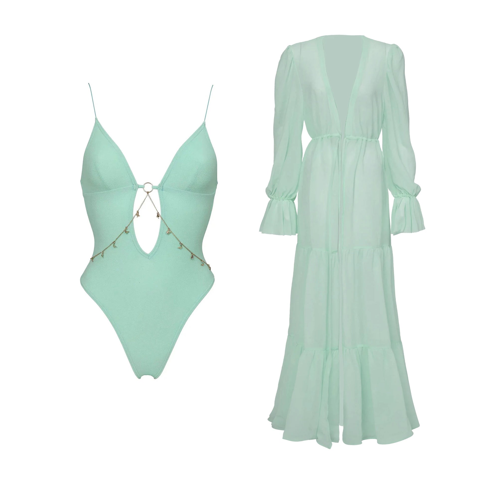 Women's Chain Detail One Piece Swimsuit with Cover Up Set