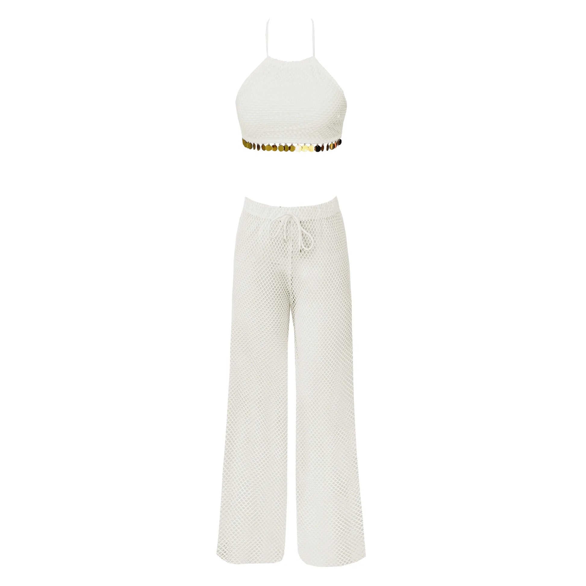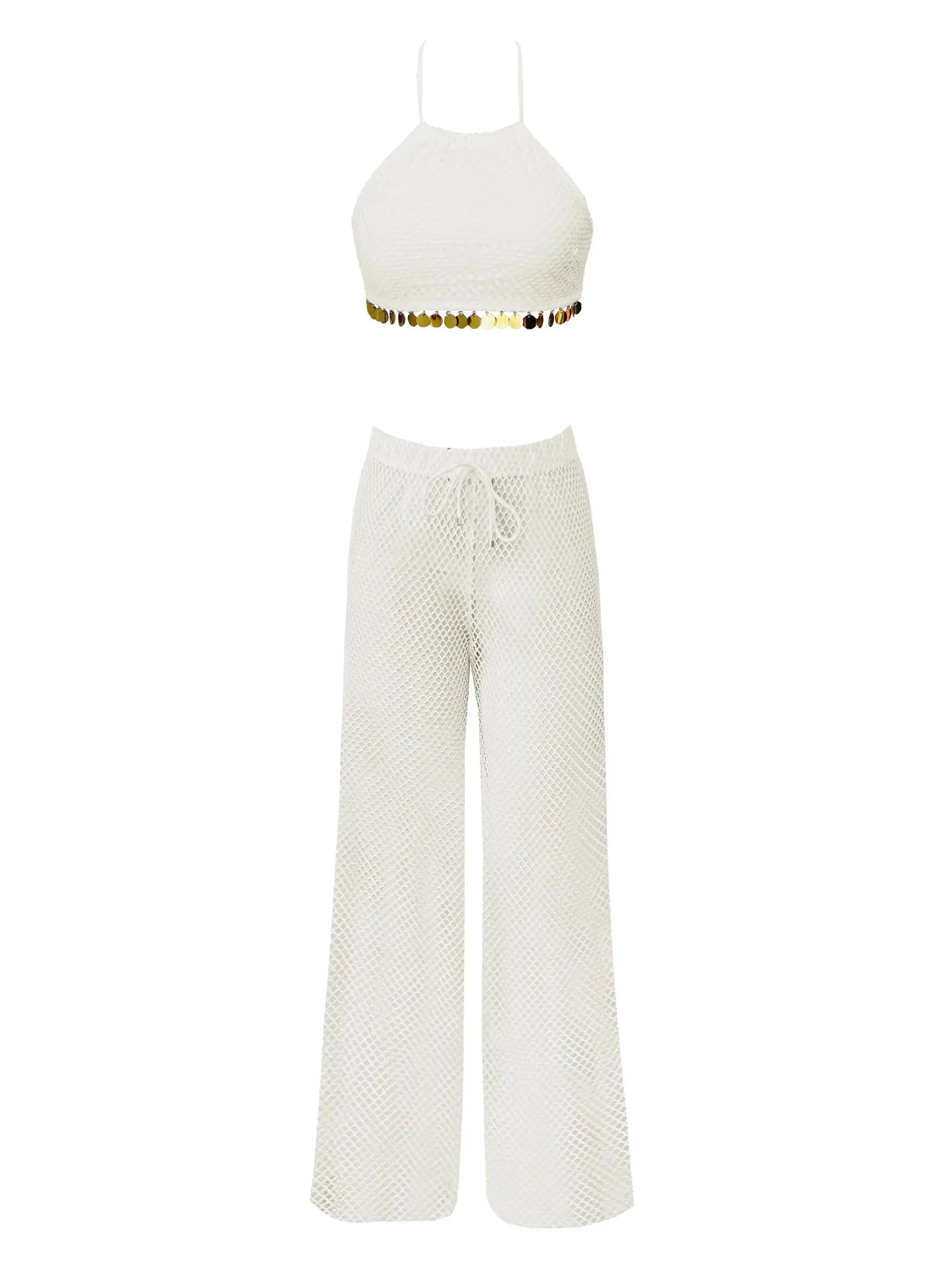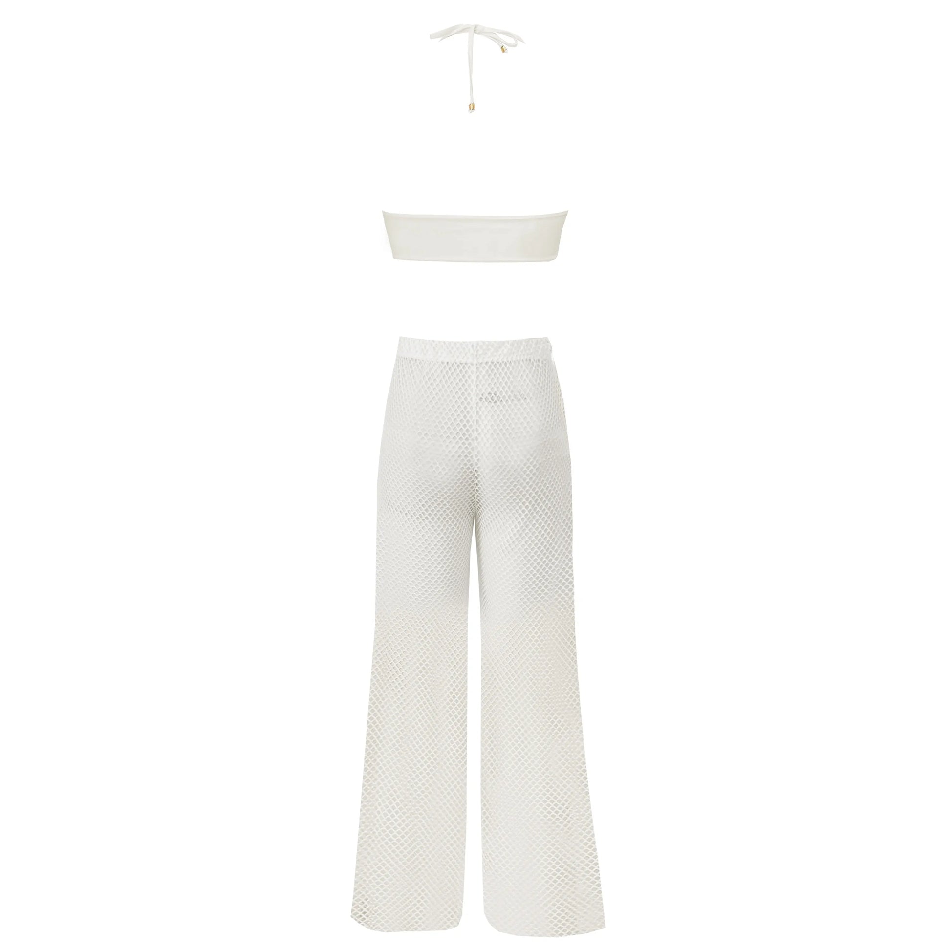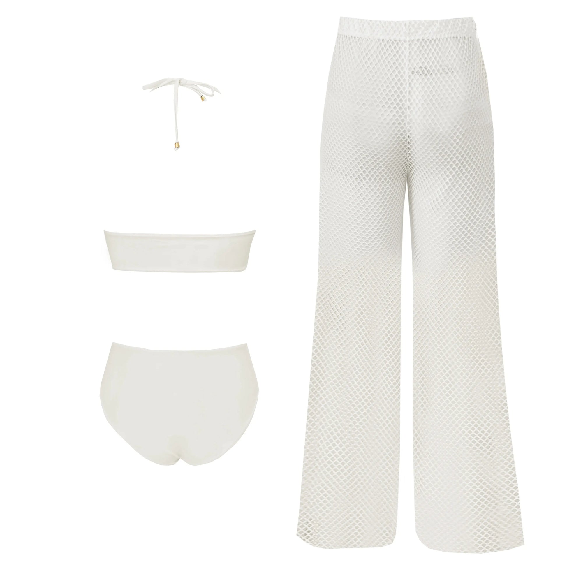 White Lace Three-Piece Bikini Set with Wide Leg Cover-Up Pants