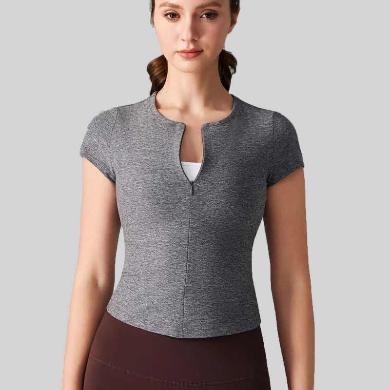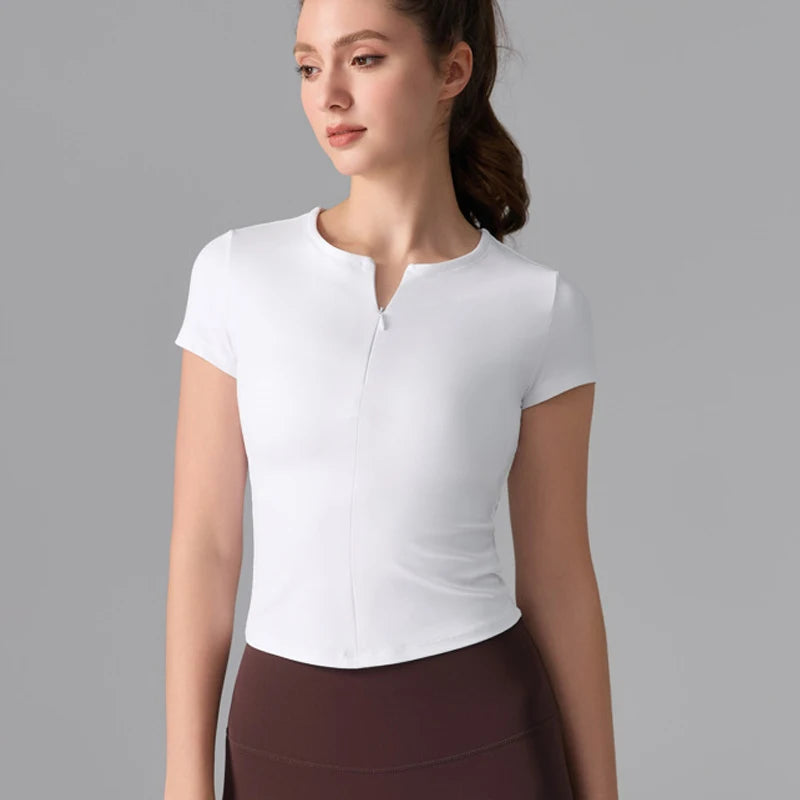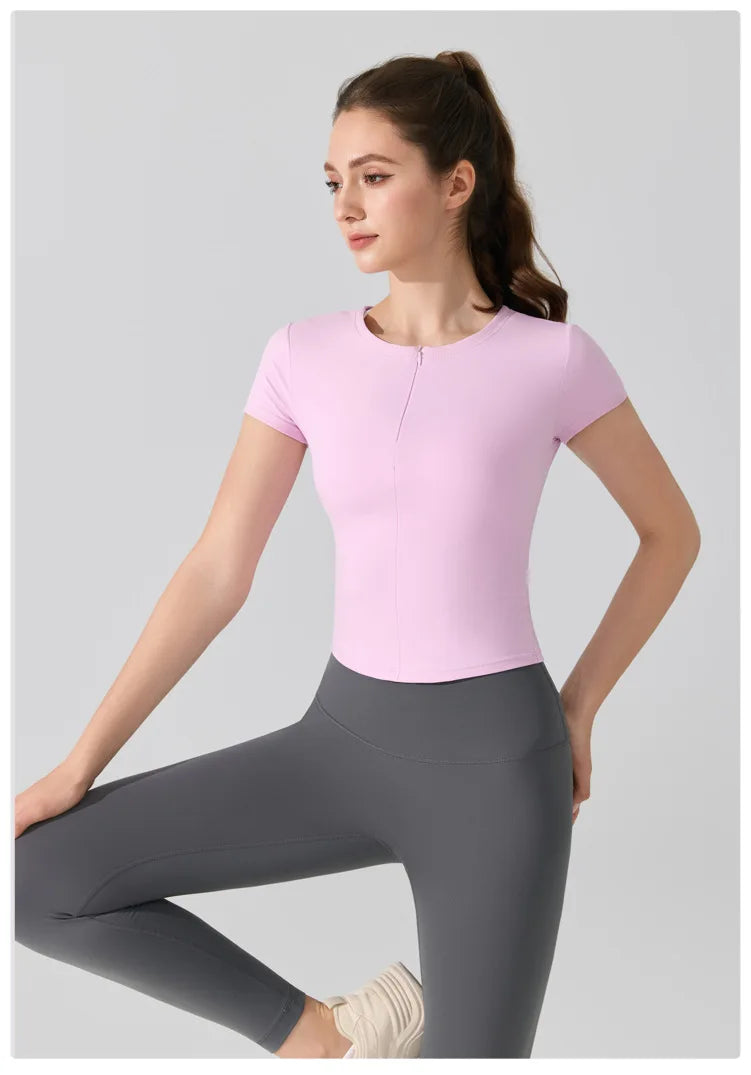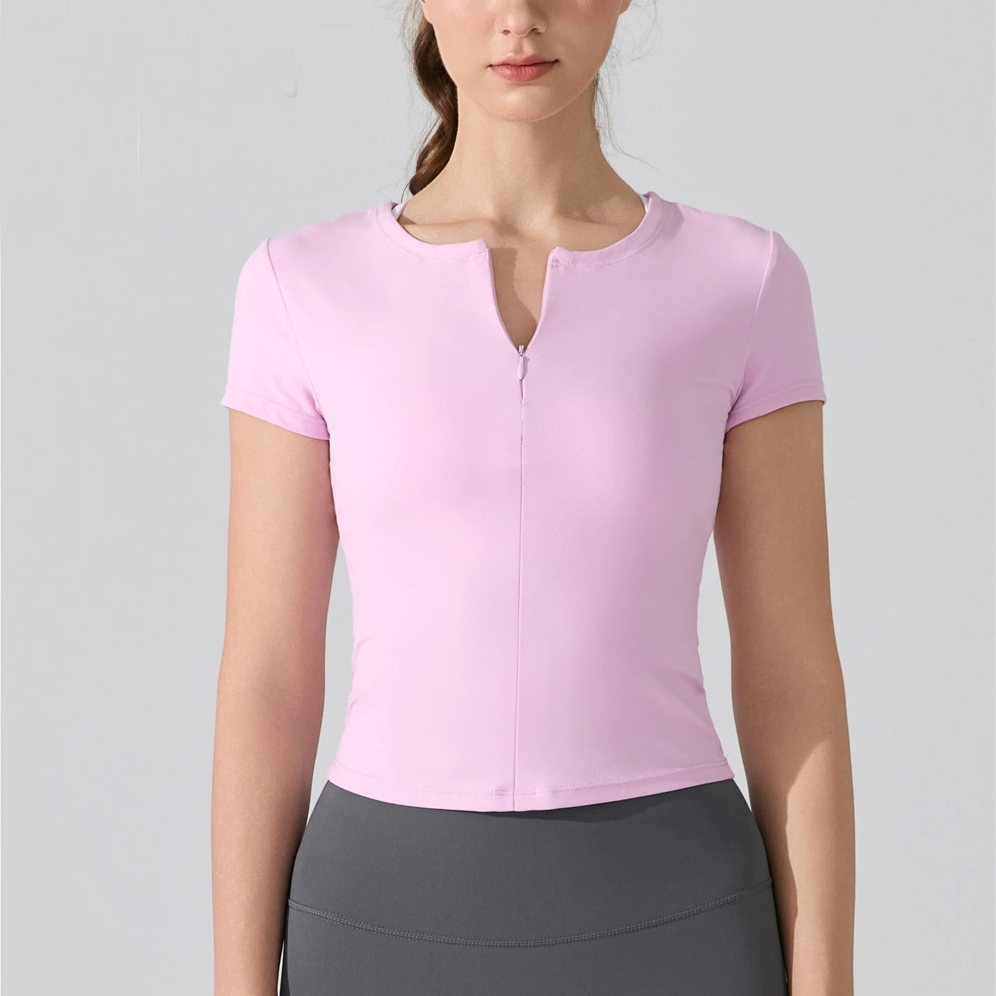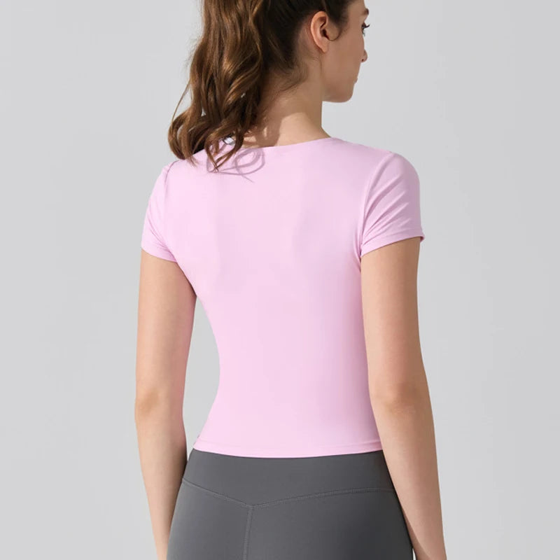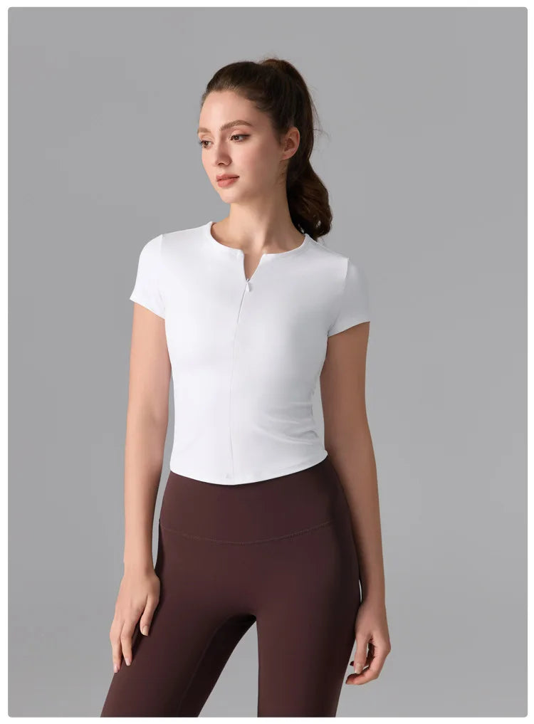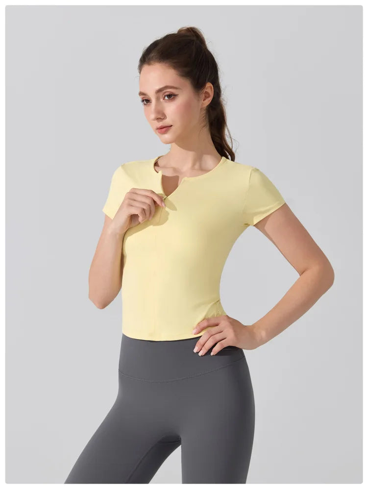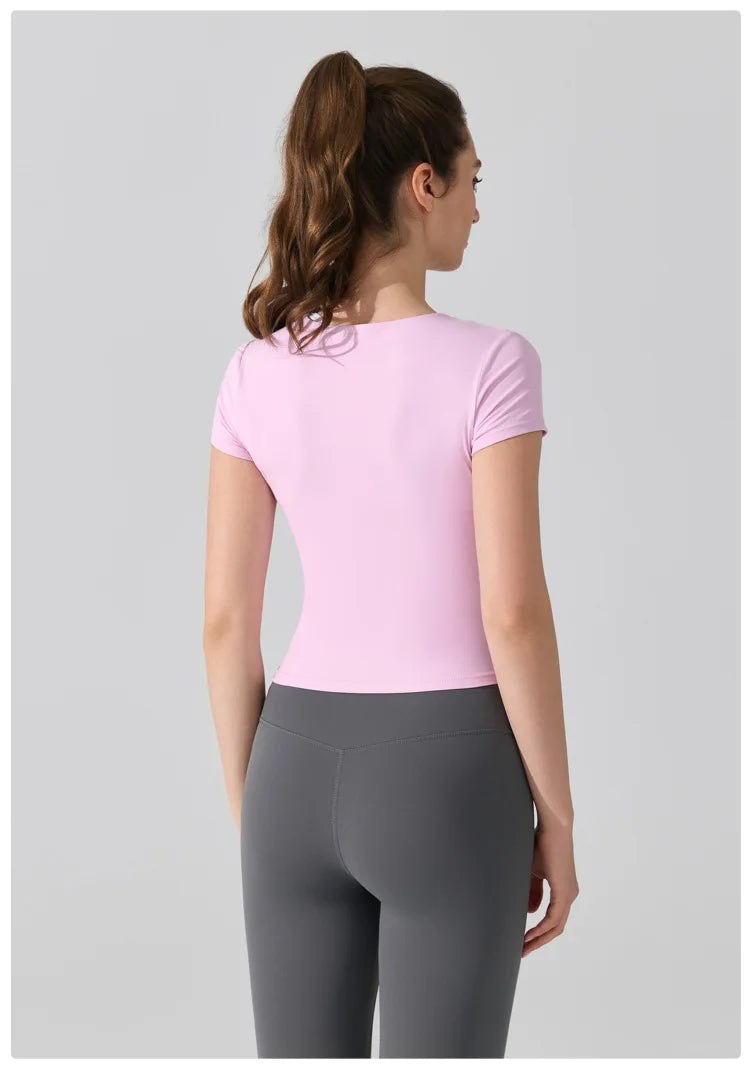 Elevate your workout experience with this premium quick-dry yoga t-shirt designed for the active woman. The breathable fabric and slim fit silhouette provide the perfect balance of comfort and performance for any fitness activity.