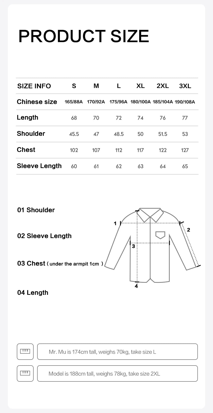 | Size | UK/US | EU | Chest (cm) | Shoulder (cm) | Length (cm) | Sleeve (cm) |