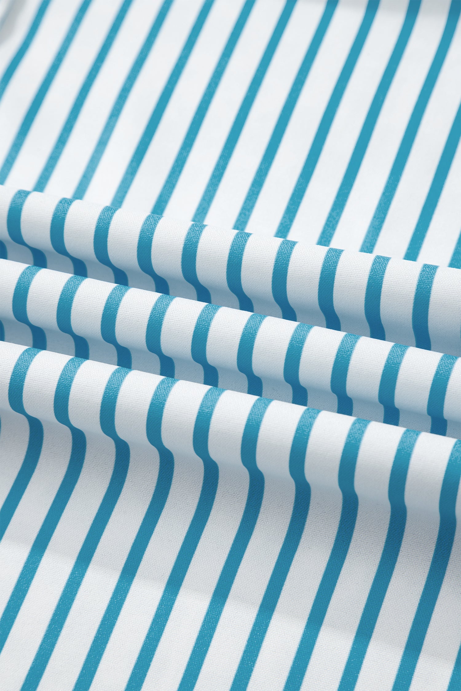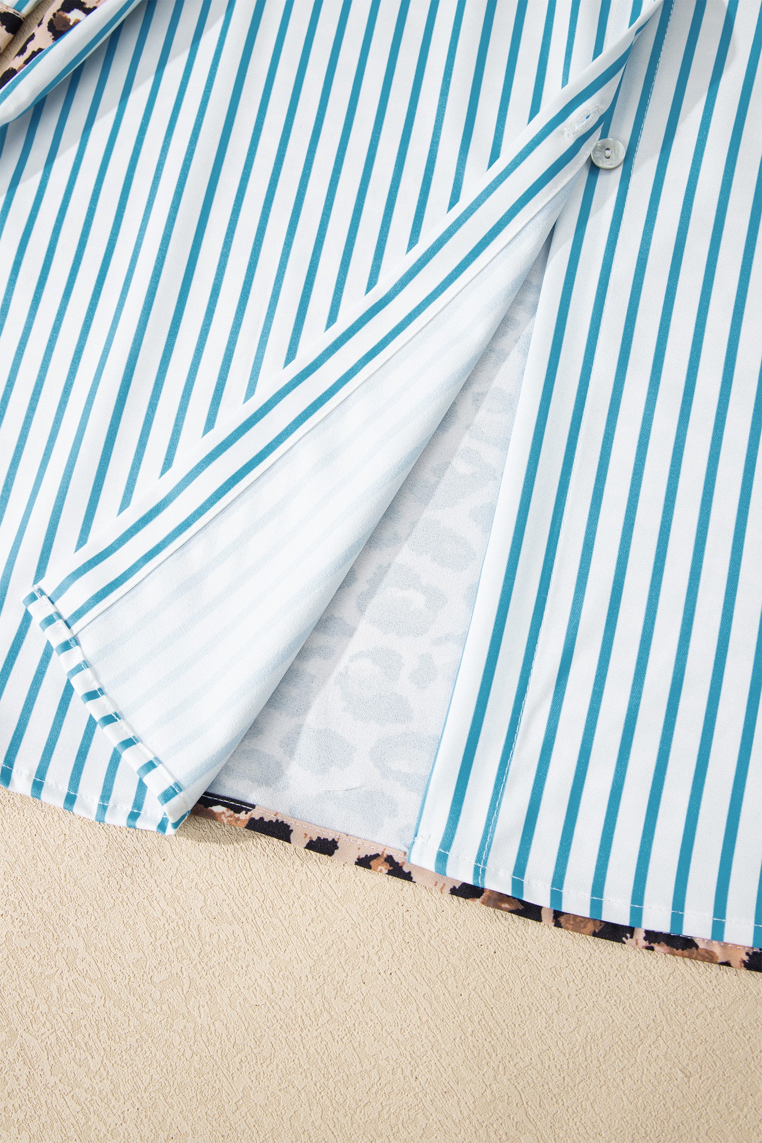 Make a bold statement with this striking long shirt dress that artfully combines classic stripes with eye-catching leopard print patchwork. The sky blue base creates a fresh, modern canvas while the side slits add movement and sophistication, making this versatile piece perfect for everything from weekend brunches to evening occasions.