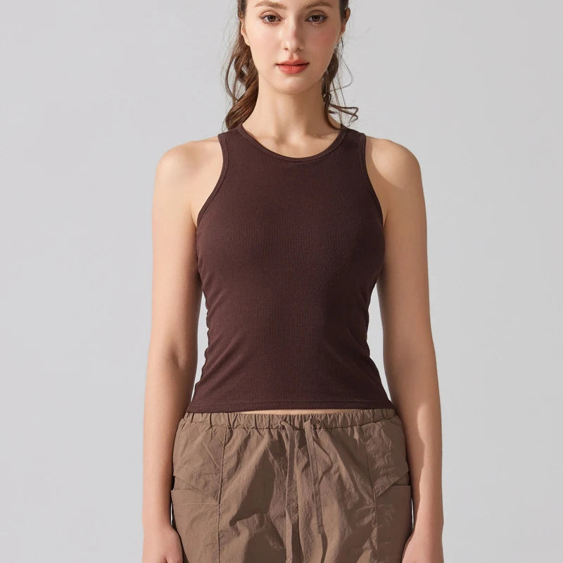 Experience ultimate comfort and confidence with this sleeveless yoga top featuring integrated chest pads. Designed for the active woman who values both support and style during her fitness journey.