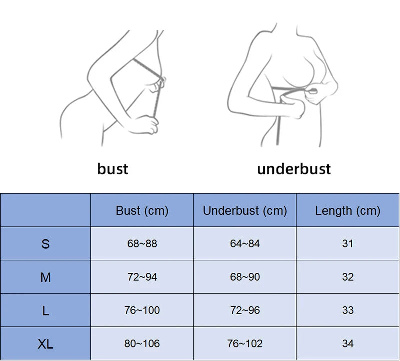 | Size | UK | US | Euro | Bust (cm) | Under Bust (cm) | Length (cm) |