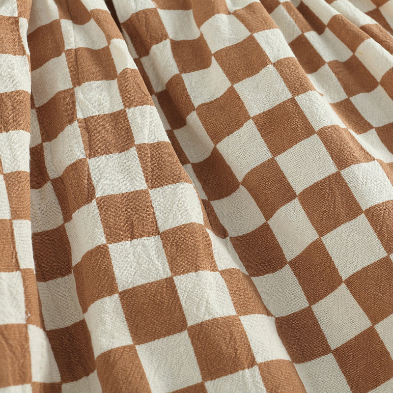 Brown checkerboard plaid pattern off-the-shoulder sleeveless jumpsuit, cute and beautiful.