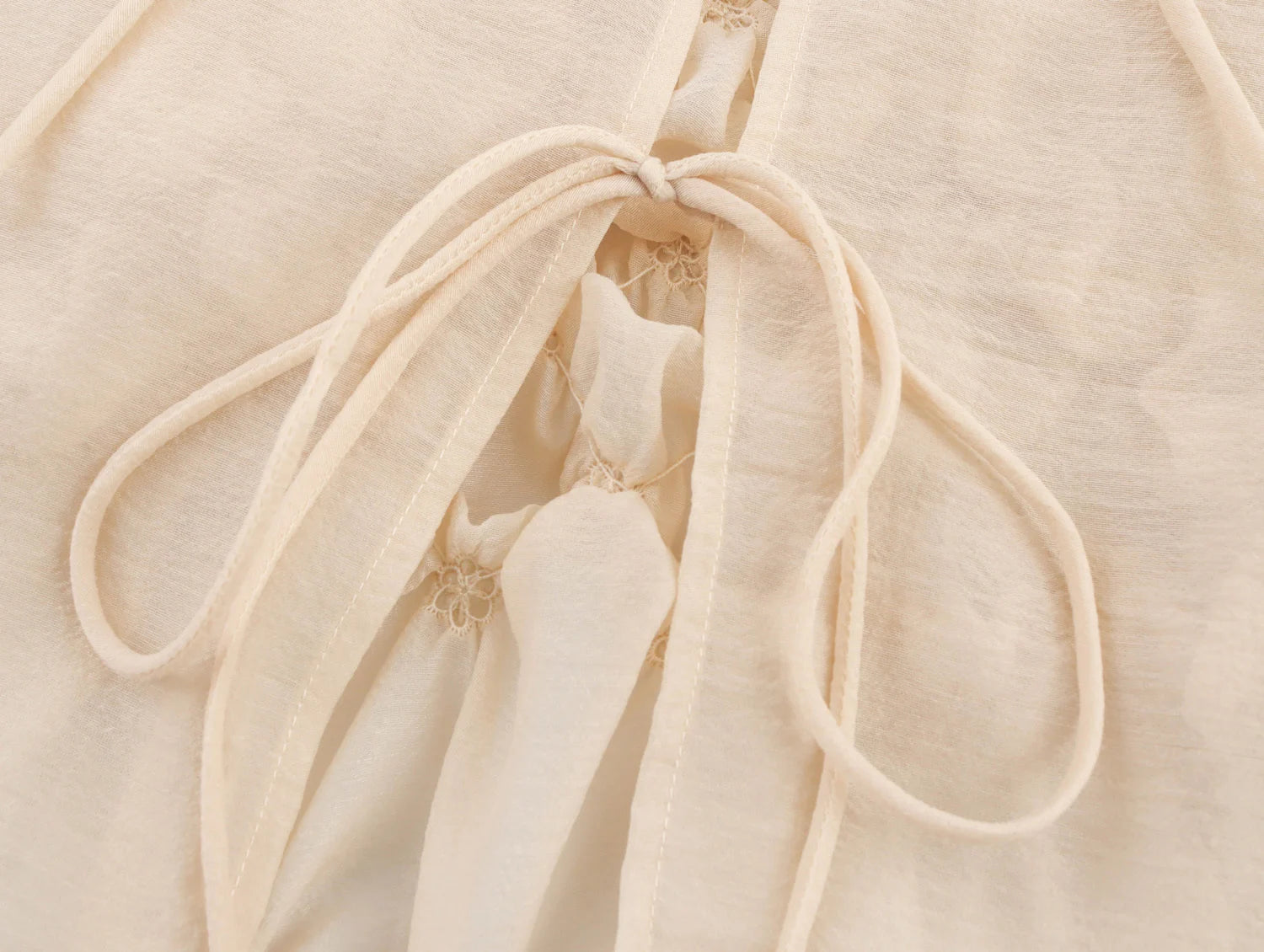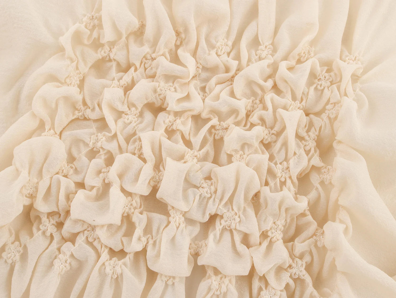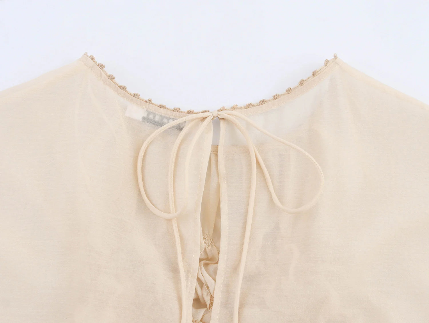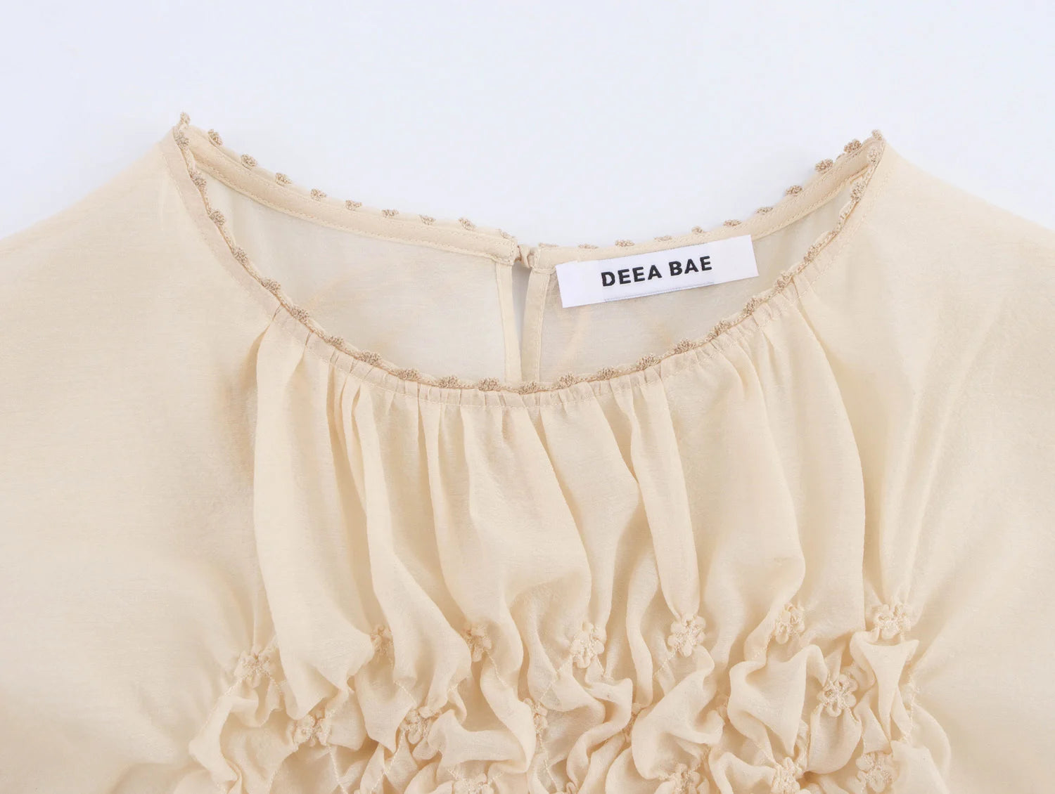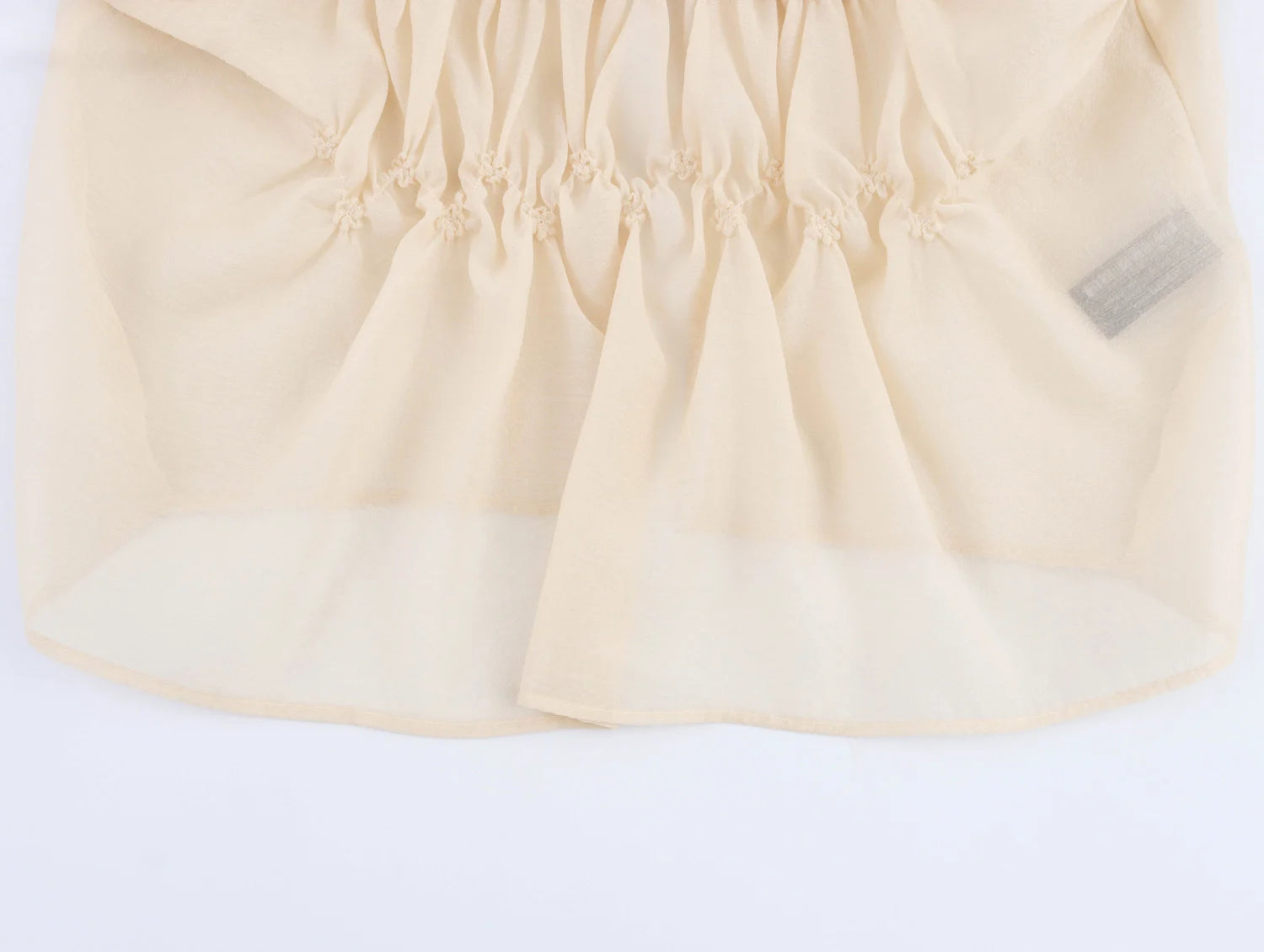 This charming short-sleeved shirt features a unique semi-transparent hard yarn fabric with sweet pleated three-dimensional design. Perfect for creating a delicate and feminine summer look.
