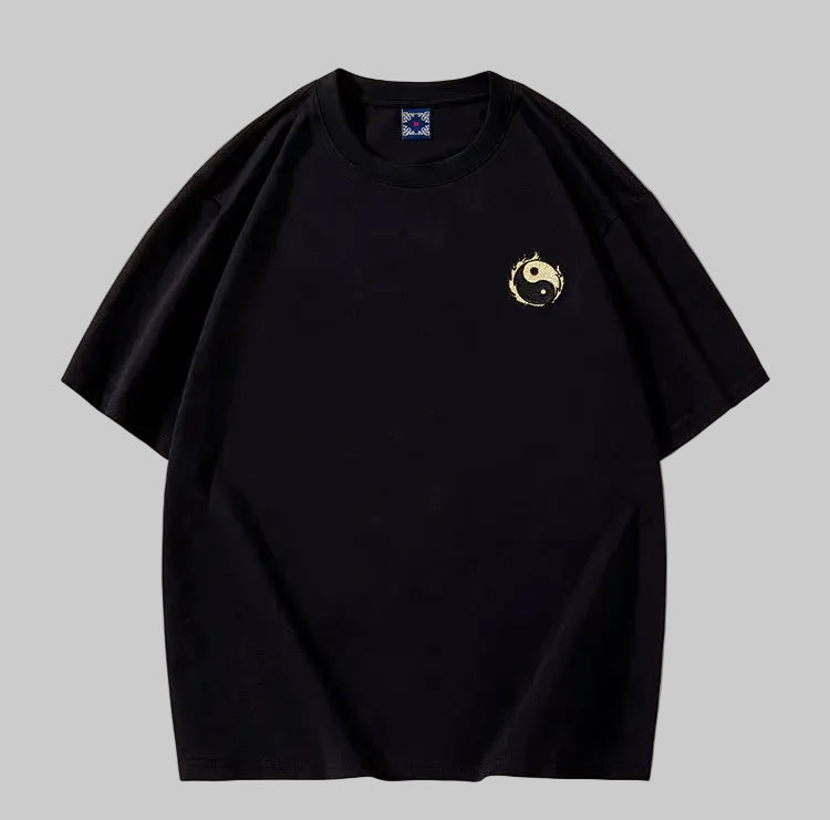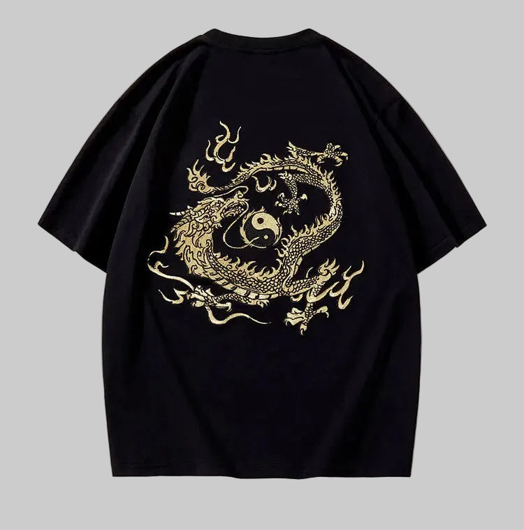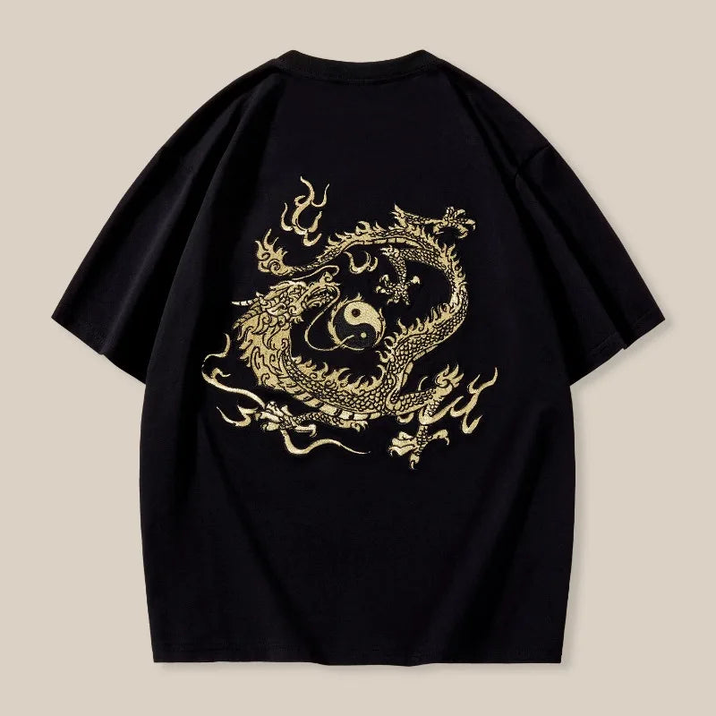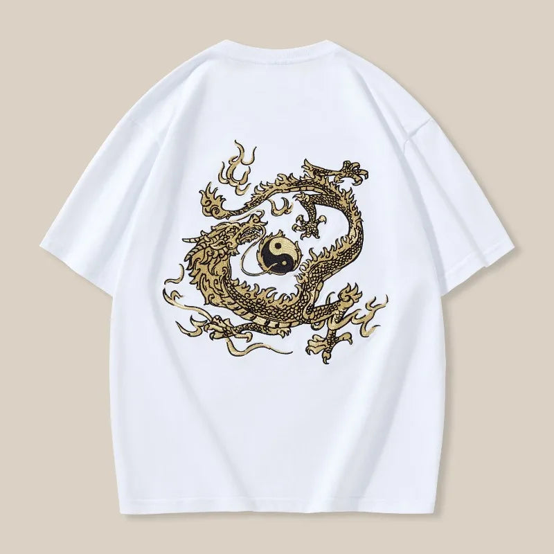 Command attention with this dragon embroidered t-shirt. Featuring intricate dragon embroidery and a comfortable loose fit, this premium combed cotton tee brings bold style to your casual wardrobe.