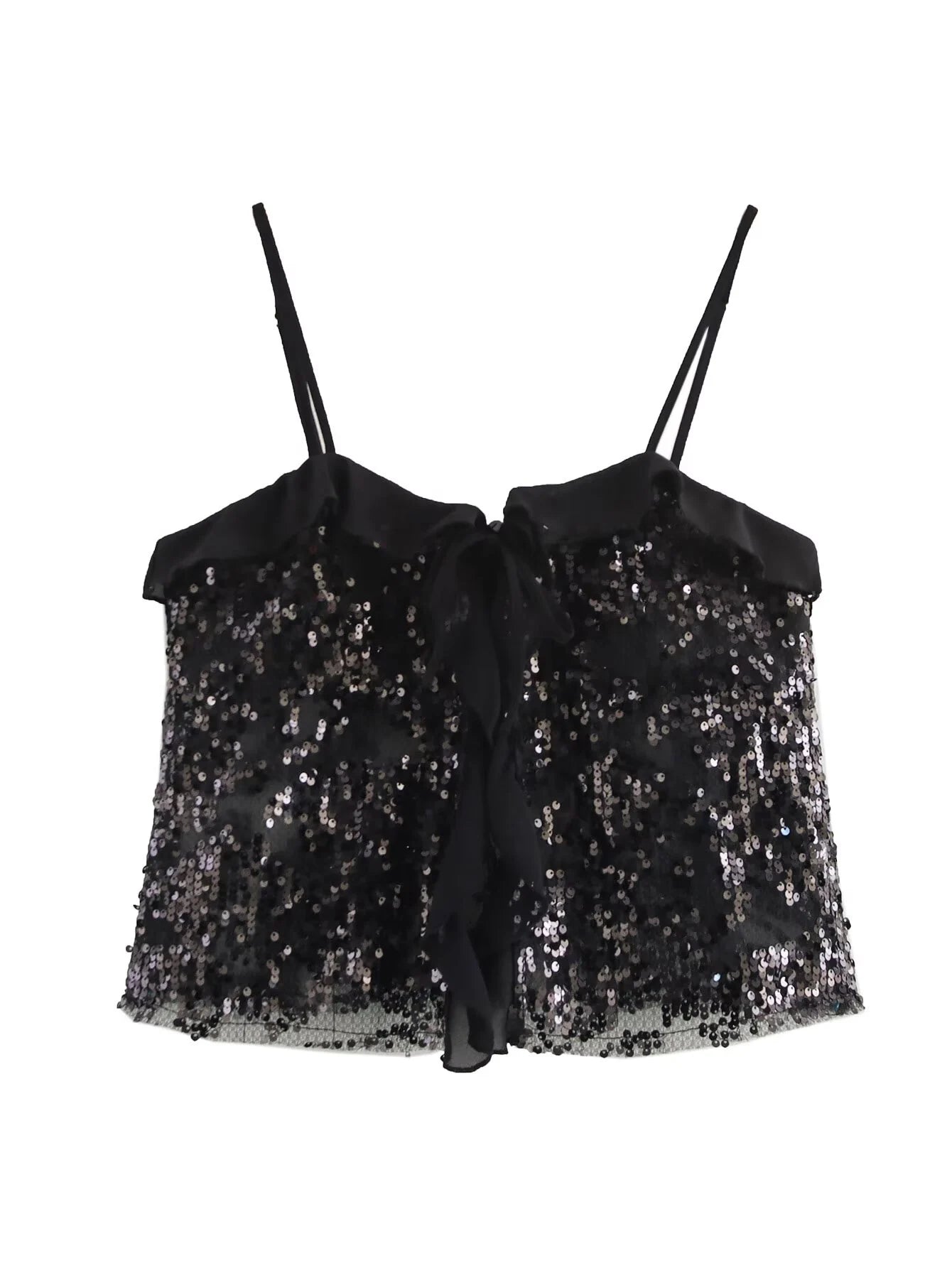 This eye-catching short suspender vest features sparkling sequin details and a charming bow tie accent. Perfect for creating a retro-inspired look with modern appeal for summer occasions.