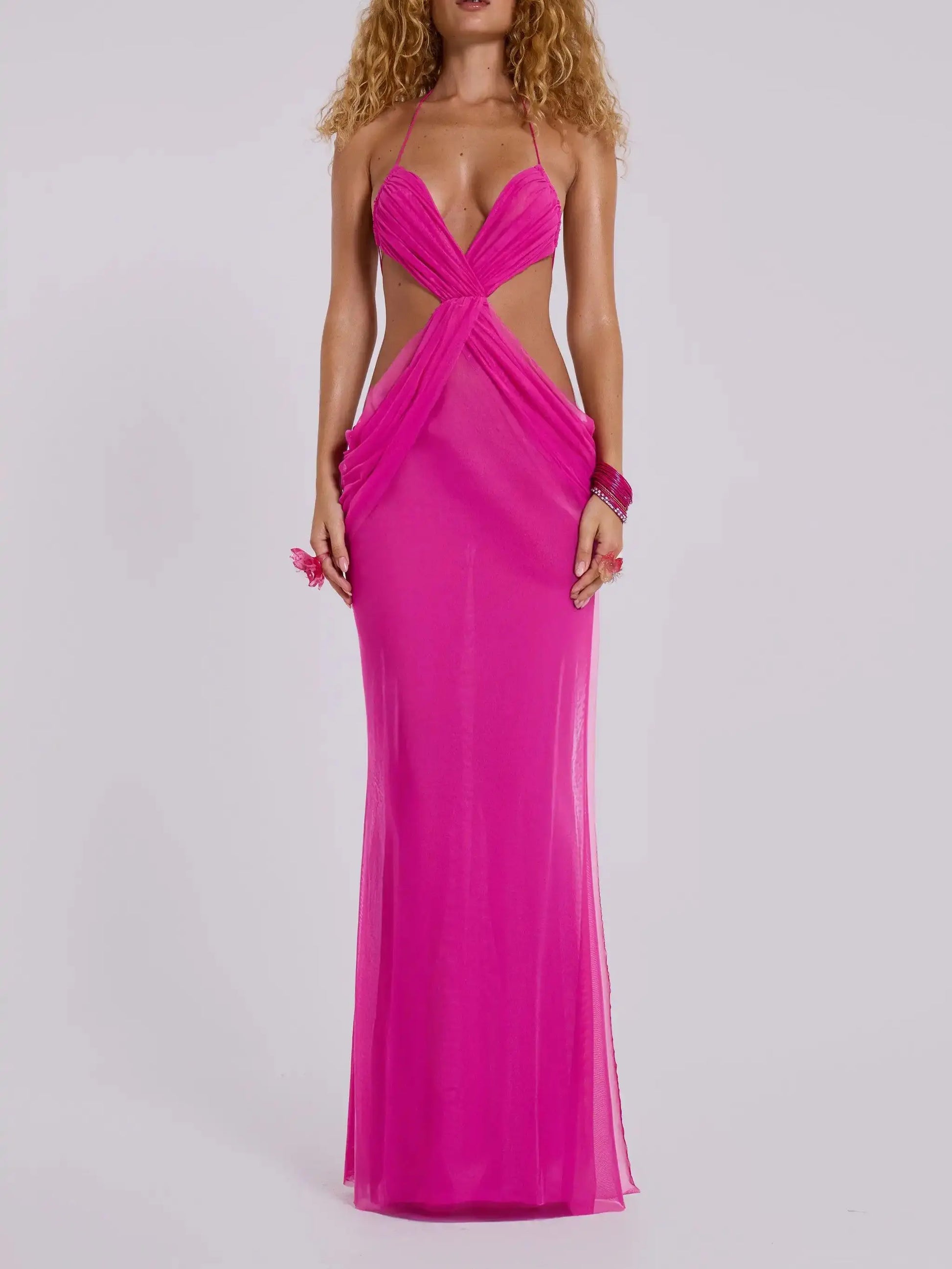 Women's Summer V Neck Ruffle Hollow Out Mesh Bodycon Sleeveless A-line Pink Maxi Dress