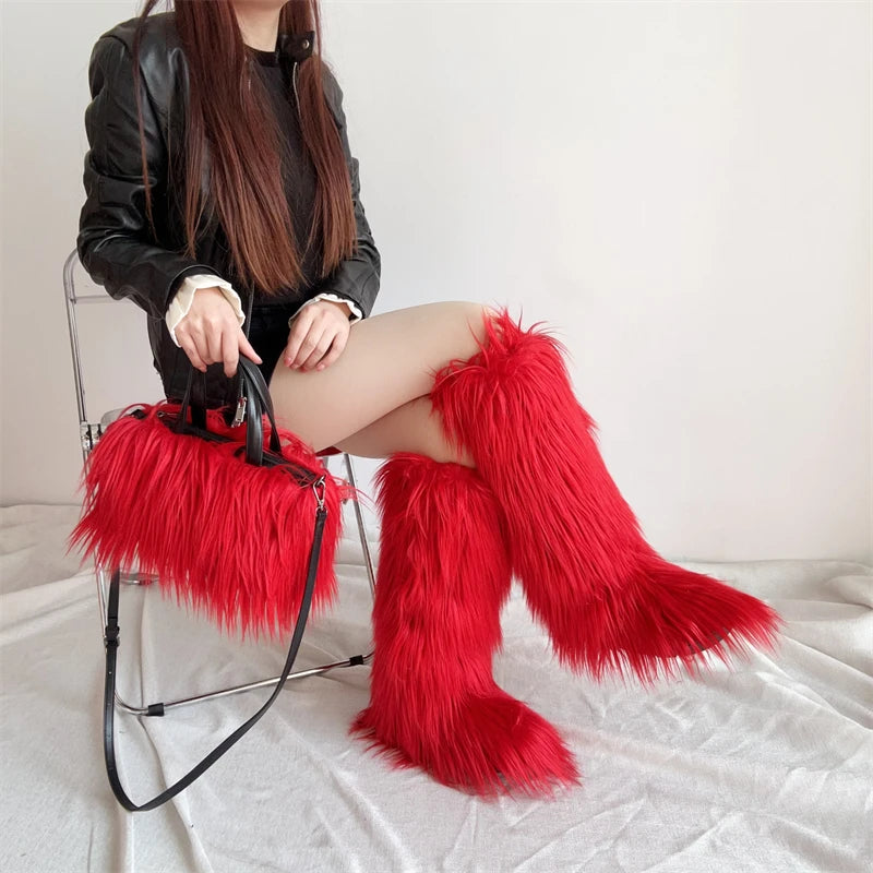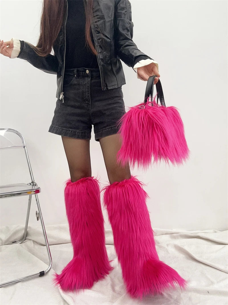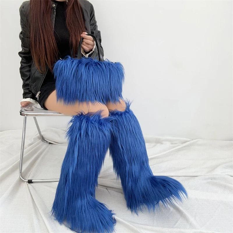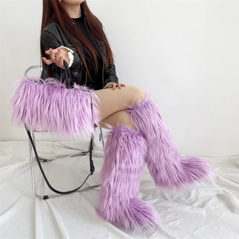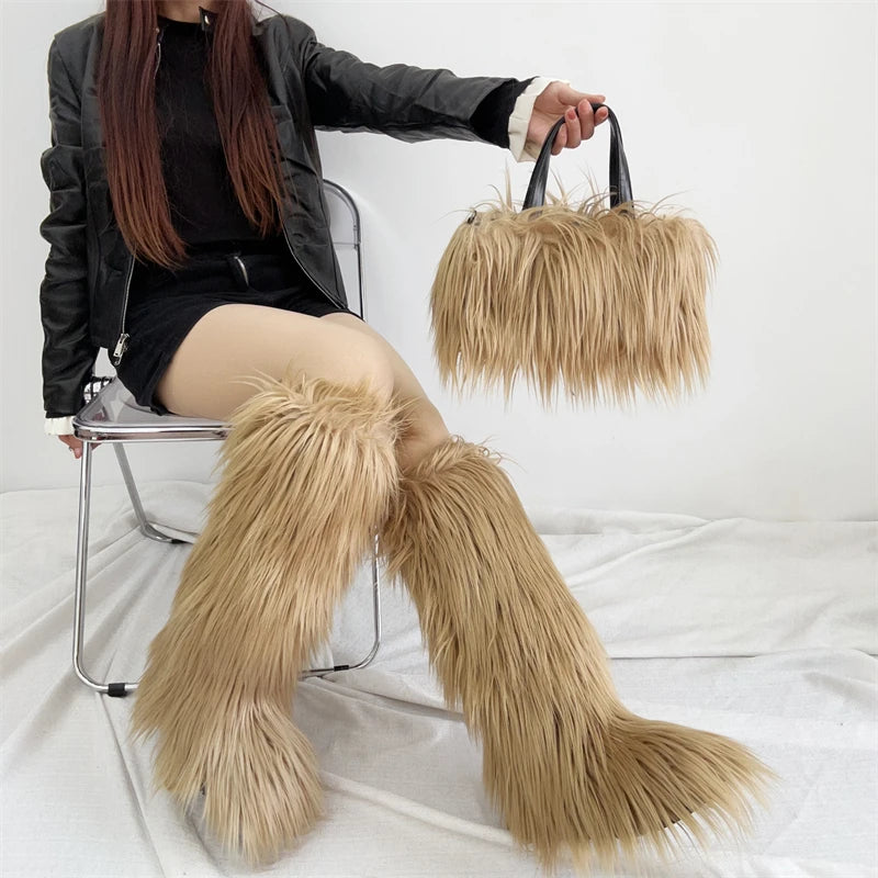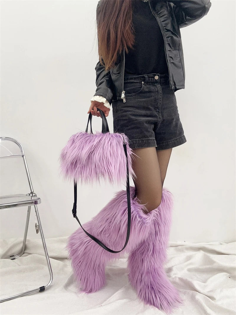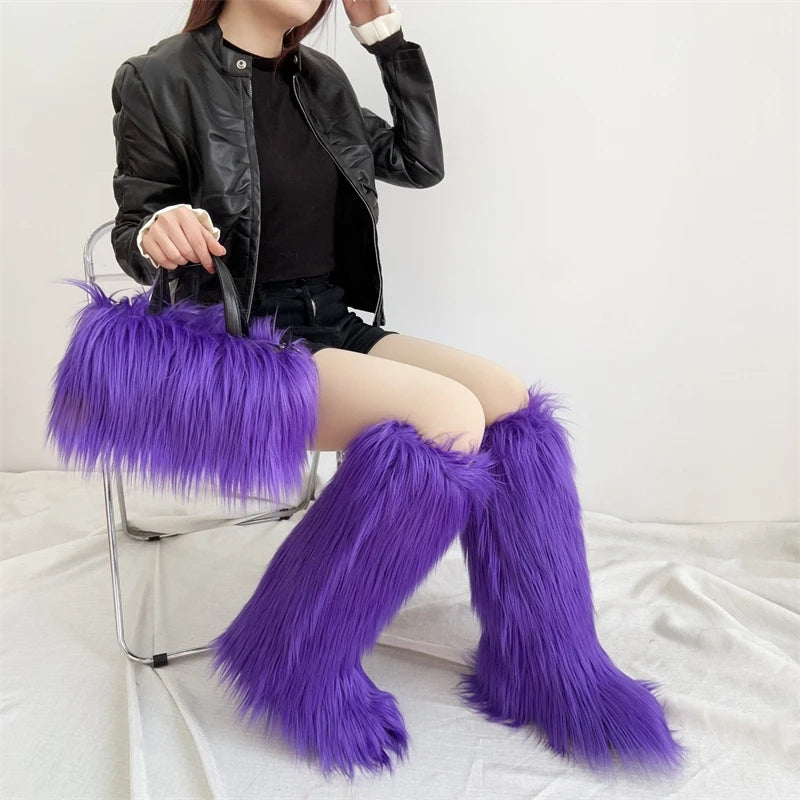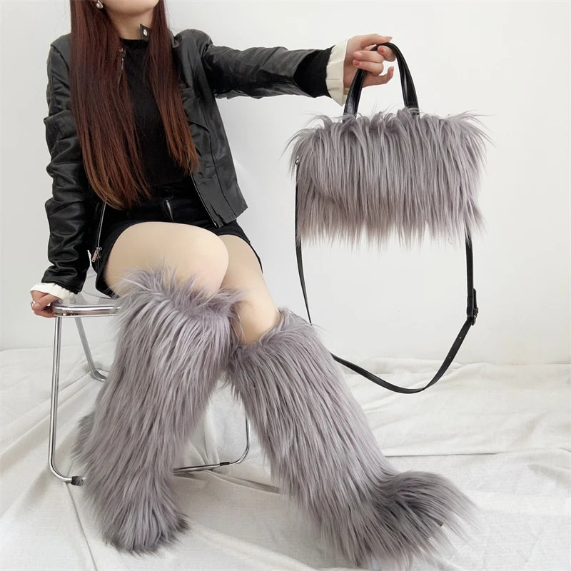 Winter Women Faux Fur Boots And Bag Set - Fluffy Warm Snow Boots Cute Tote Fur Handbag and Platform Plush Boots