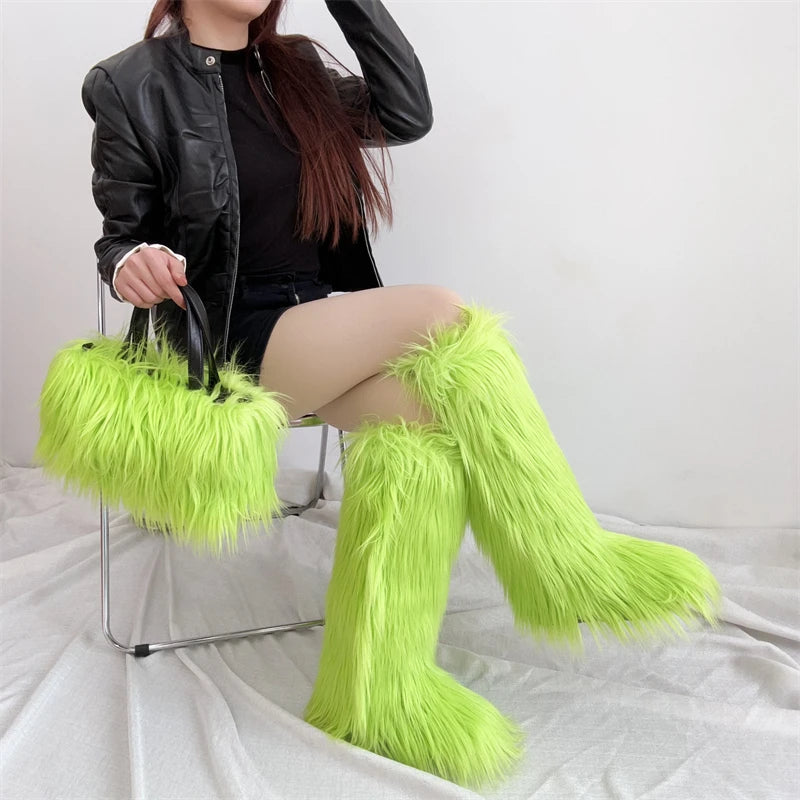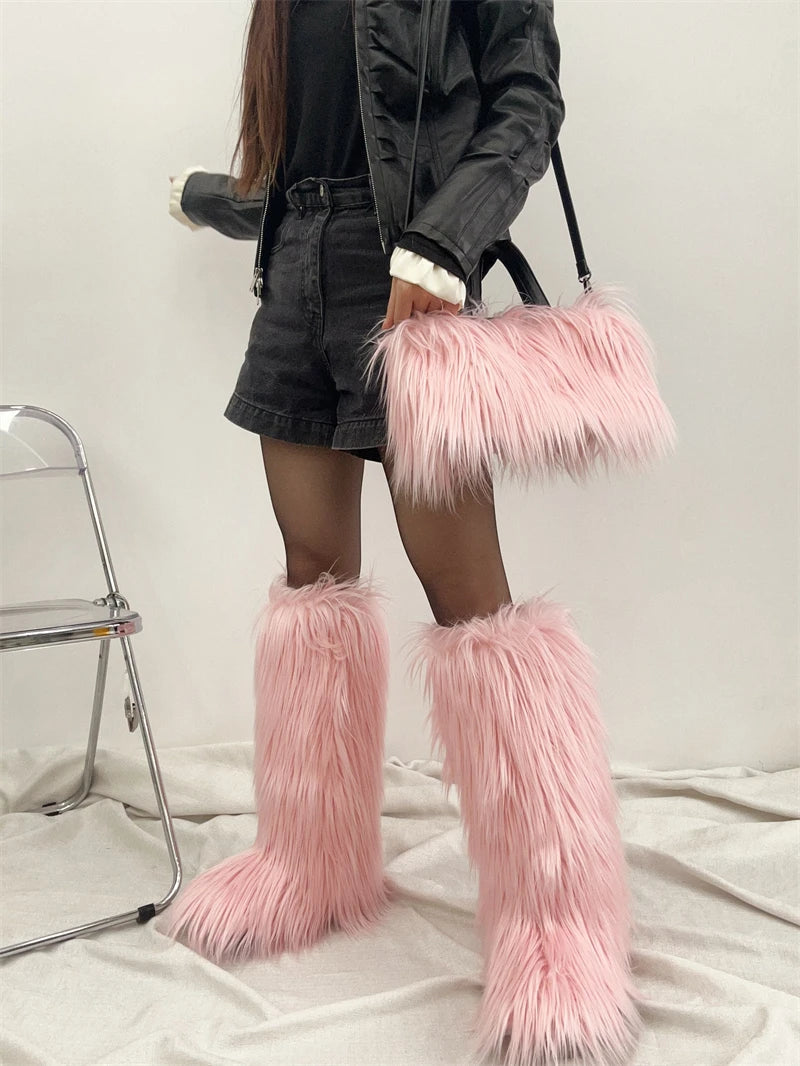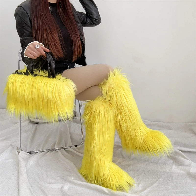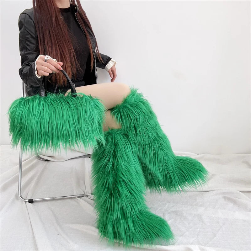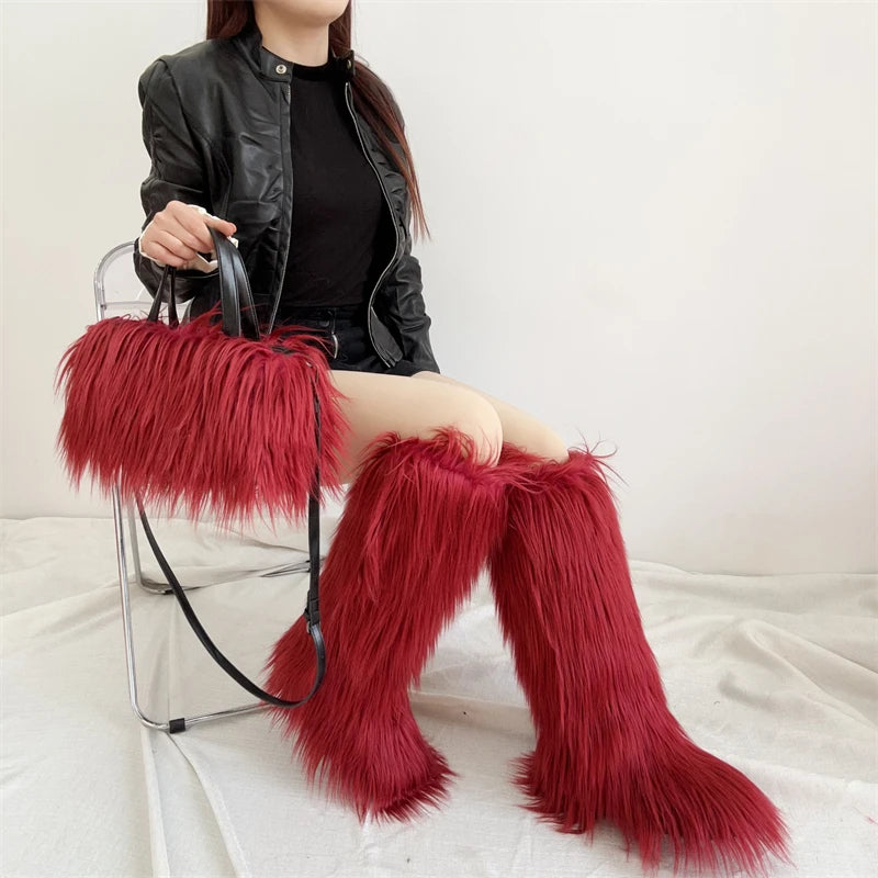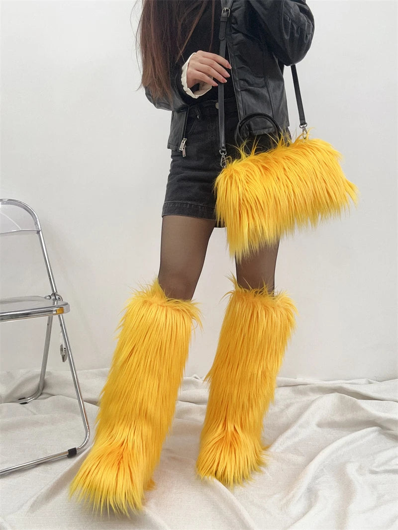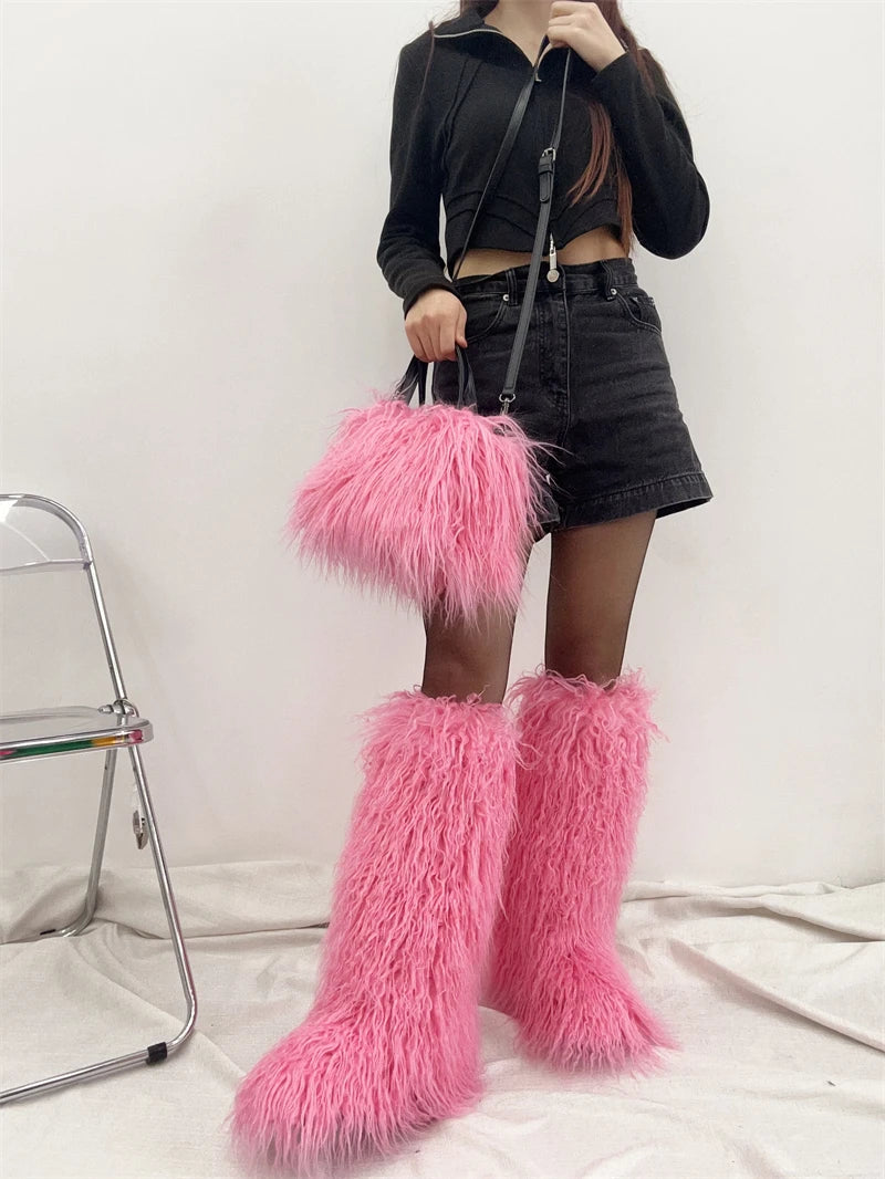 Winter Women Faux Fur Boots And Bag Set - Fluffy Warm Snow Boots Cute Tote Fur Handbag and Platform Plush Boots
