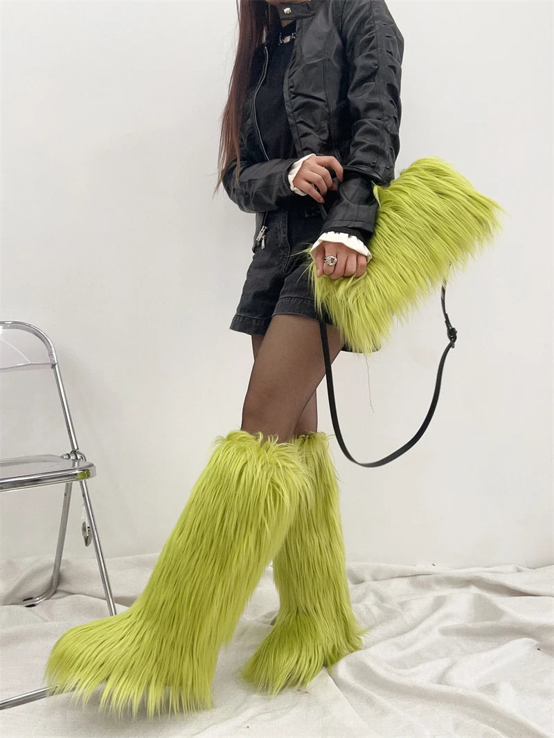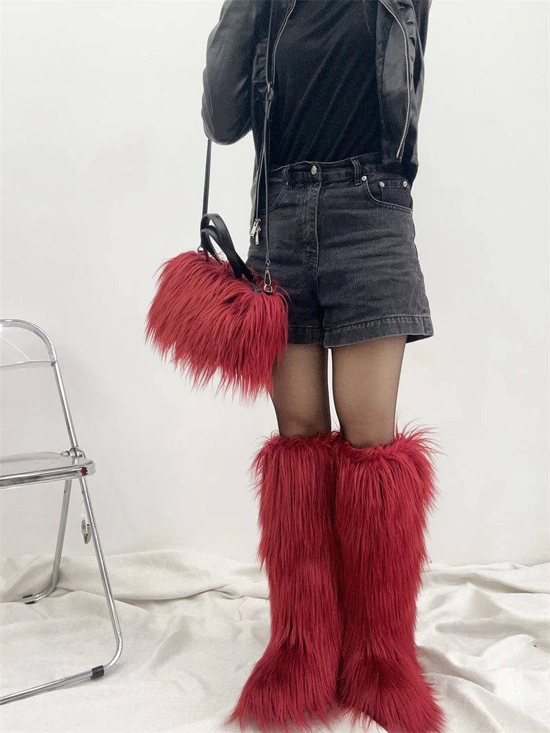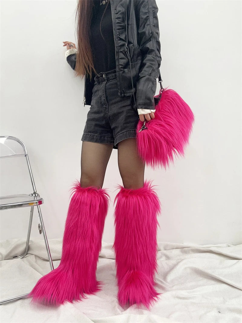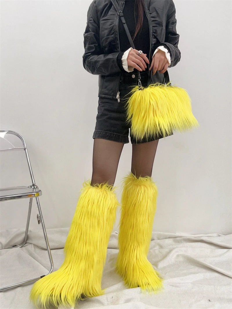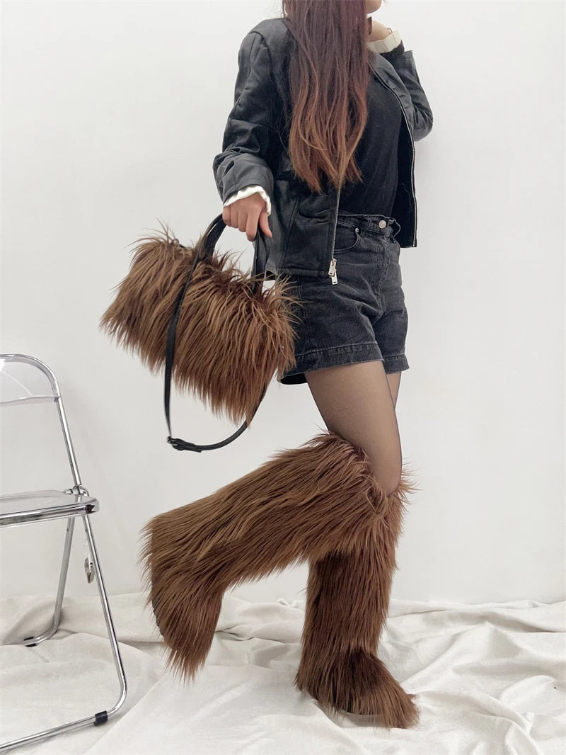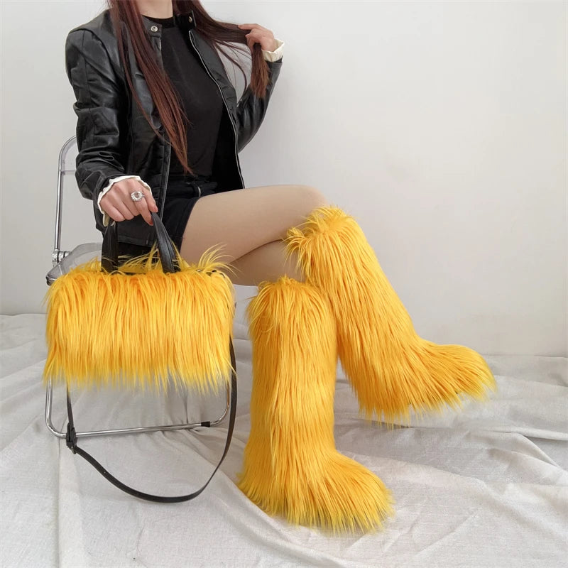 Winter Women Faux Fur Boots And Bag Set - Fluffy Warm Snow Boots Cute Tote Fur Handbag and Platform Plush Boots