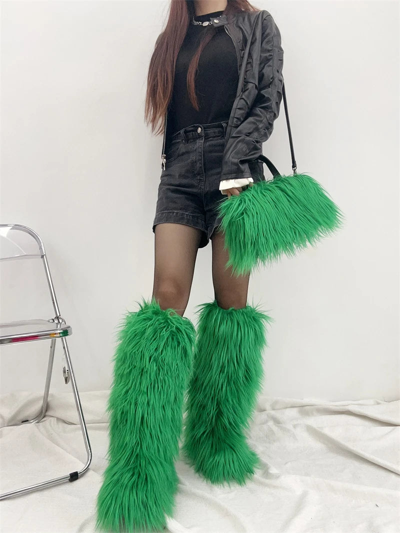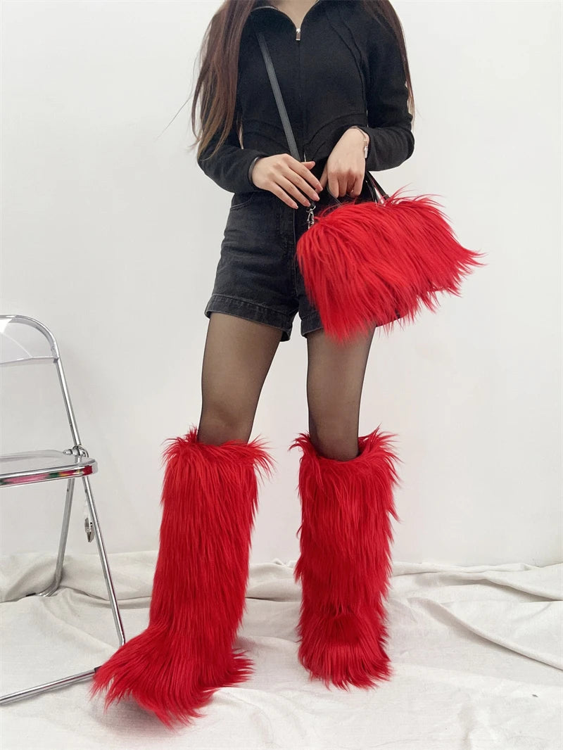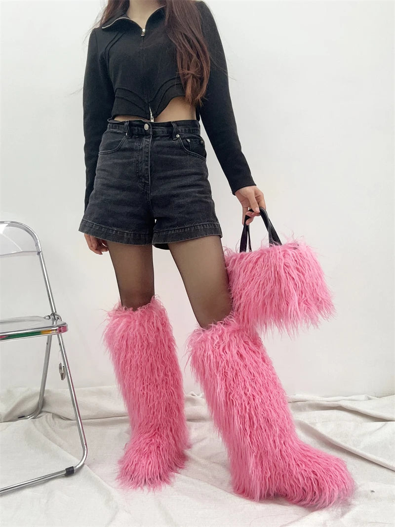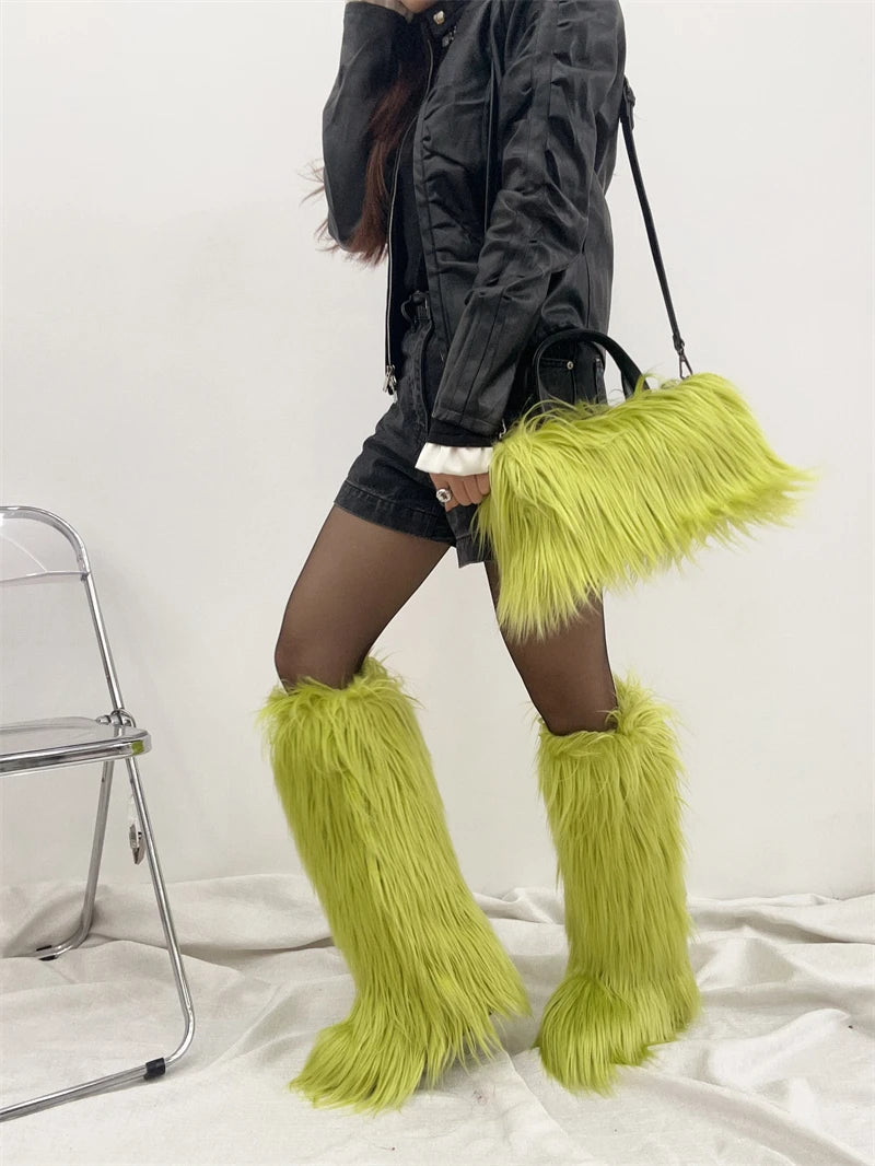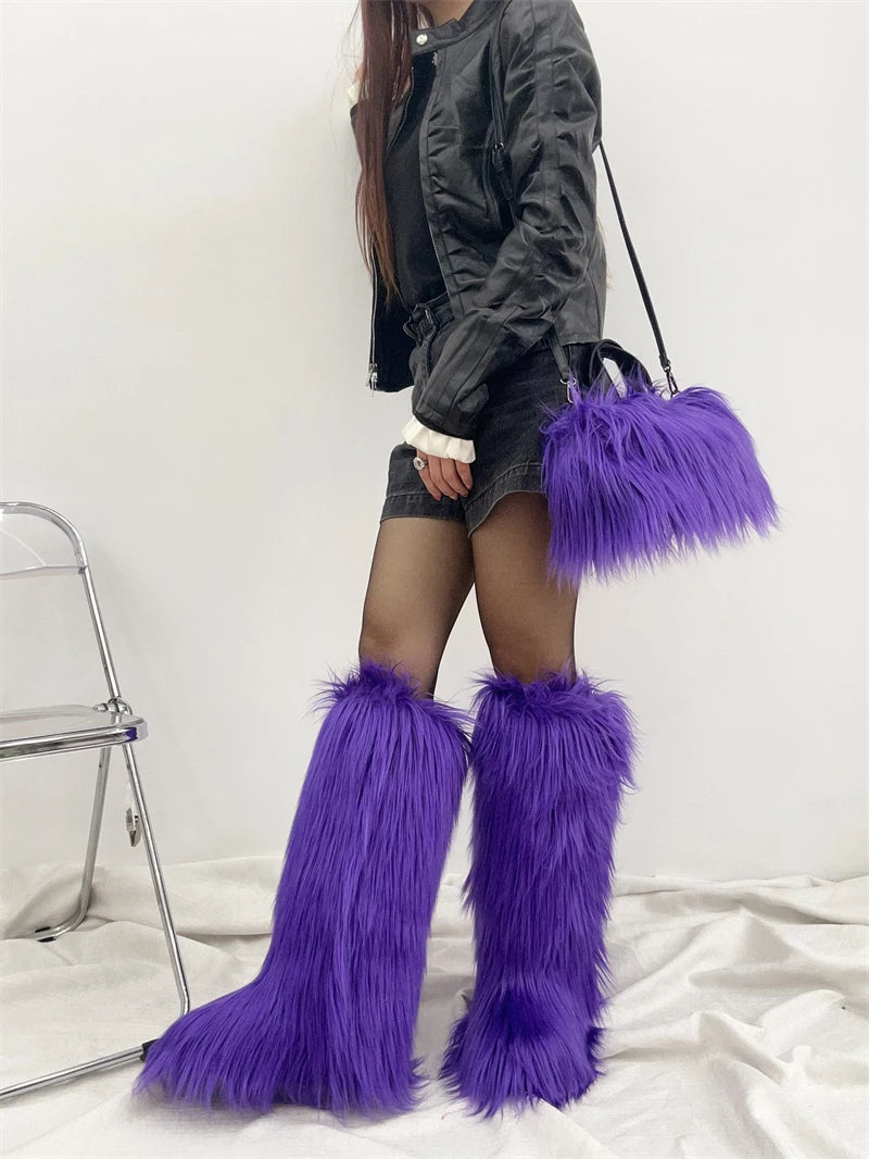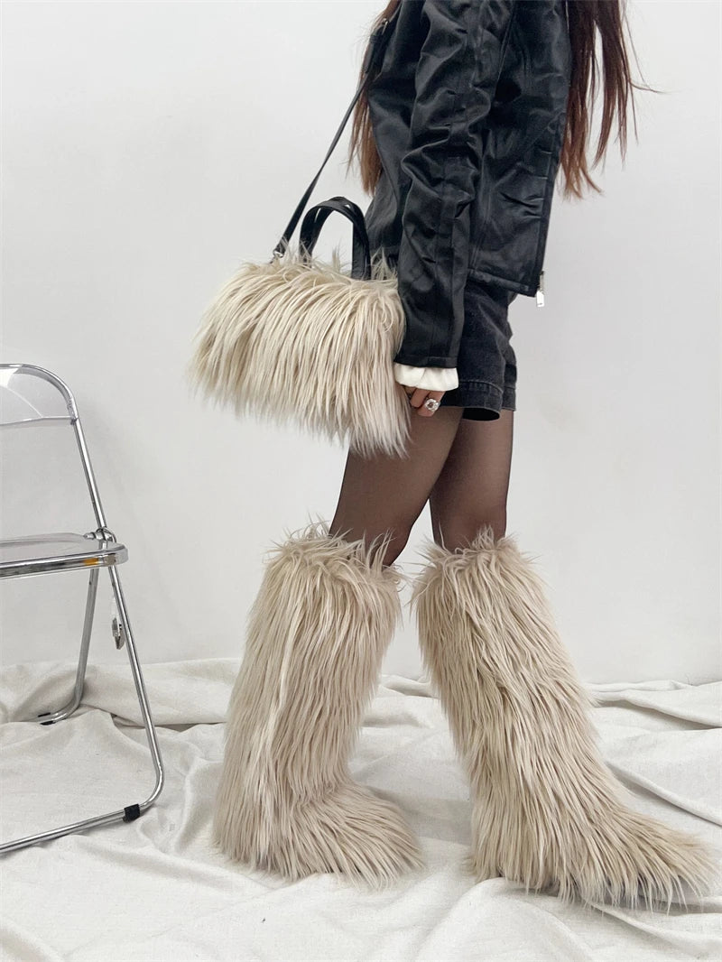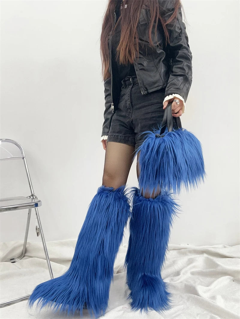 Winter Women Faux Fur Boots And Bag Set - Fluffy Warm Snow Boots Cute Tote Fur Handbag and Platform Plush Boots