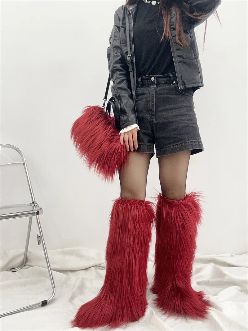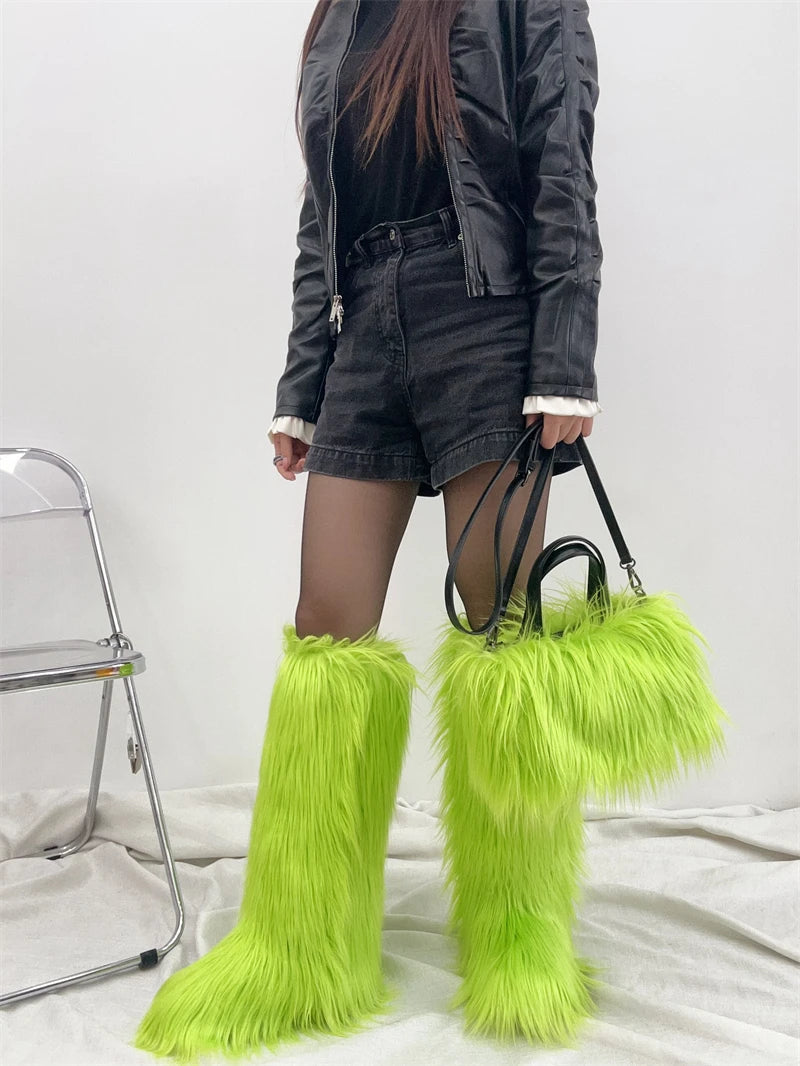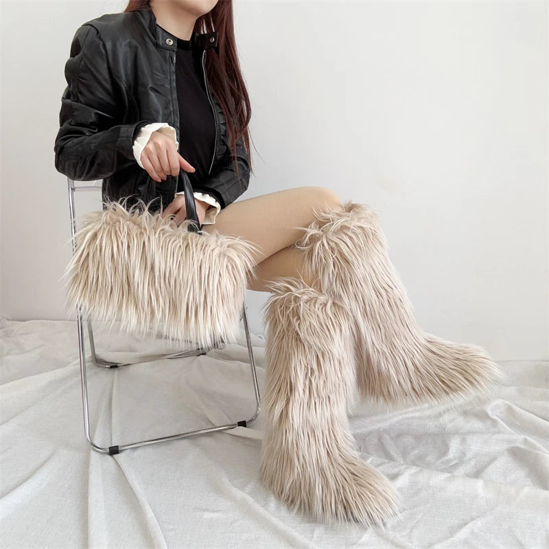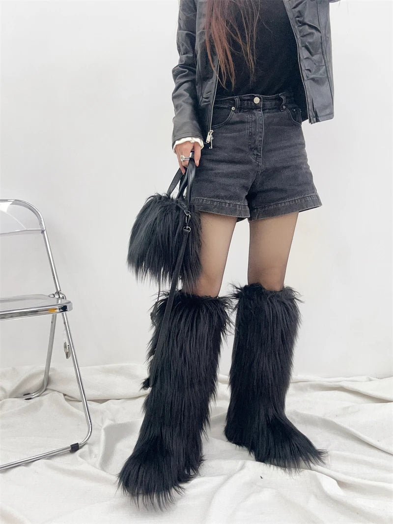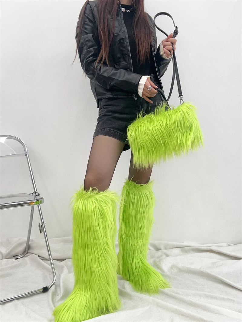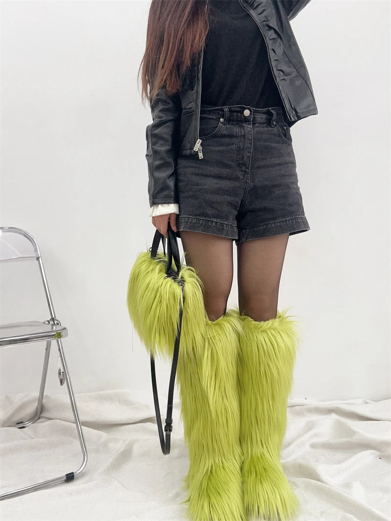 Winter Women Faux Fur Boots And Bag Set - Fluffy Warm Snow Boots Cute Tote Fur Handbag and Platform Plush Boots