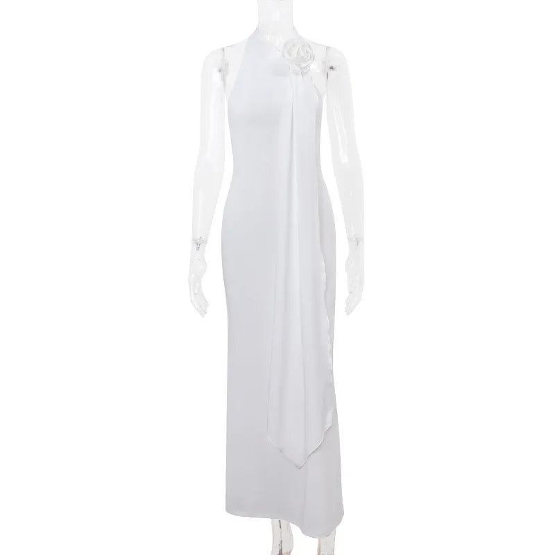 Women Floral Applique Halter White Maxi Dress - Backless Ruched Summer Dress