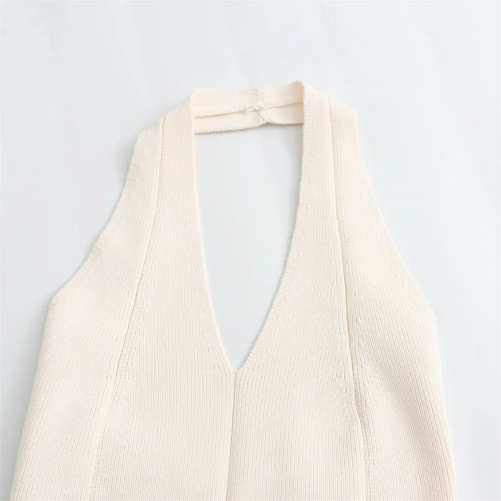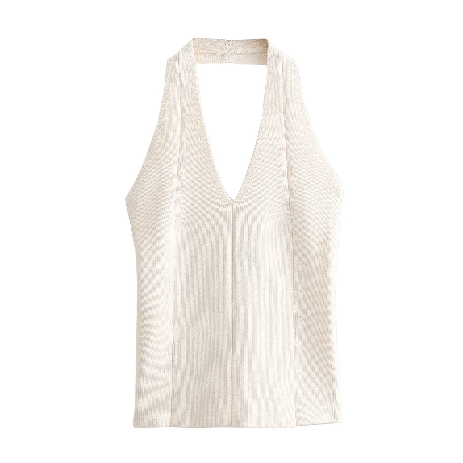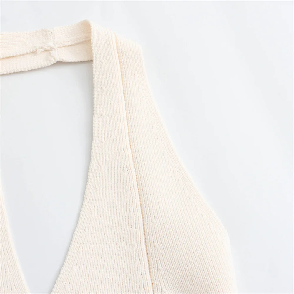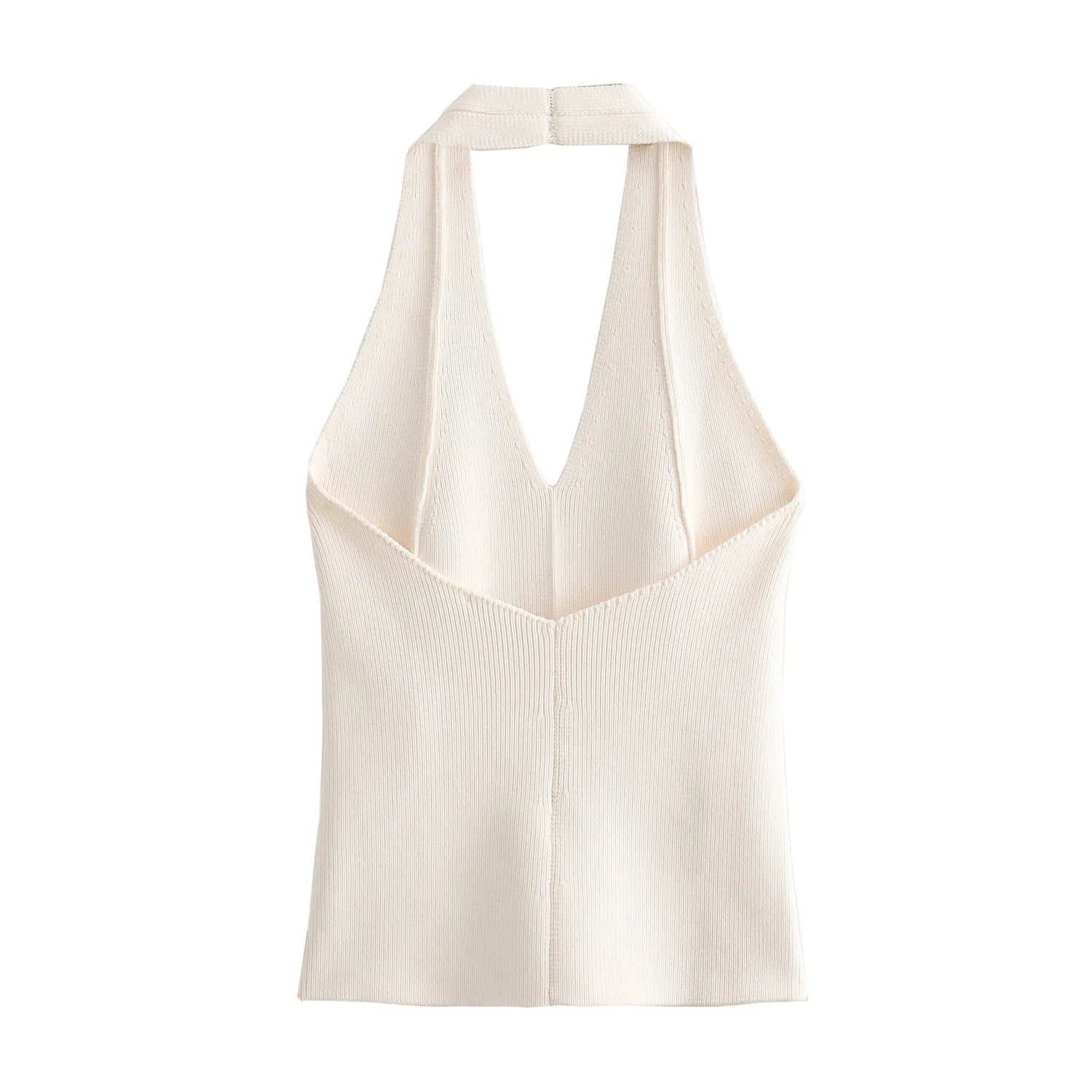 Women French Versatile Hanging Neck Knitted Short Top Backless Vest