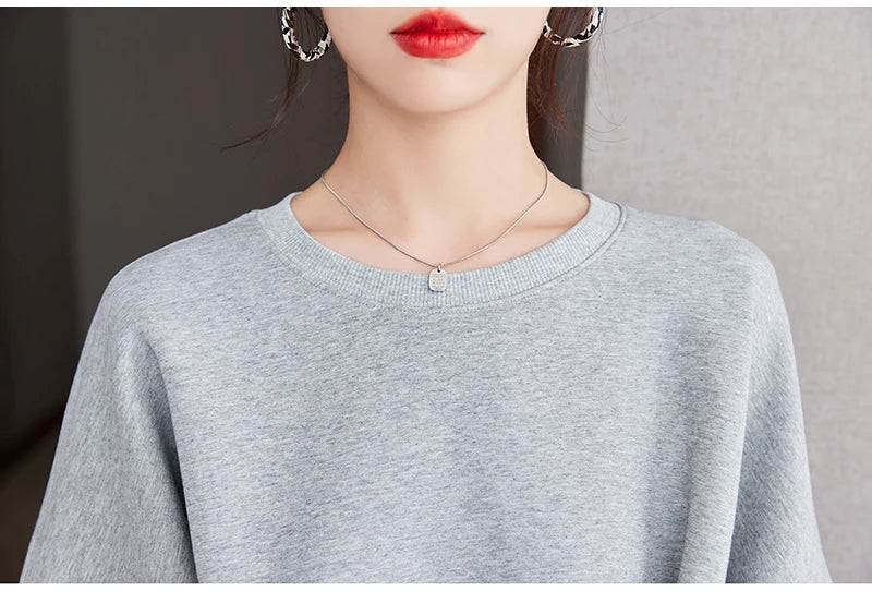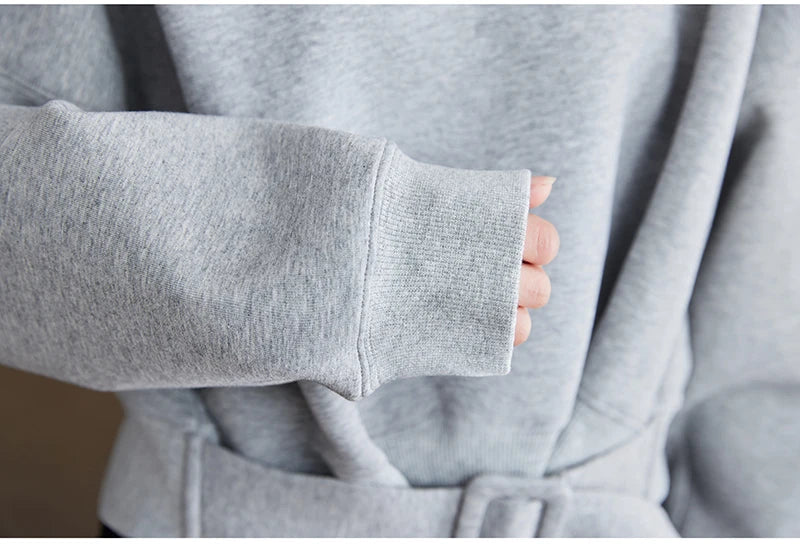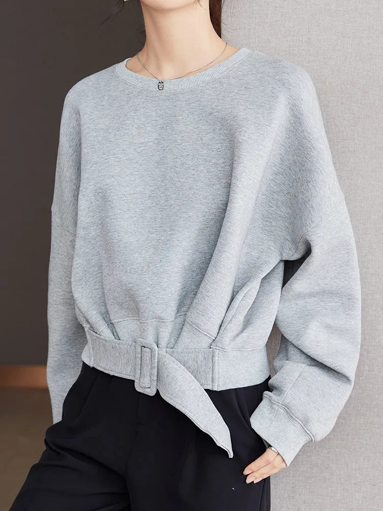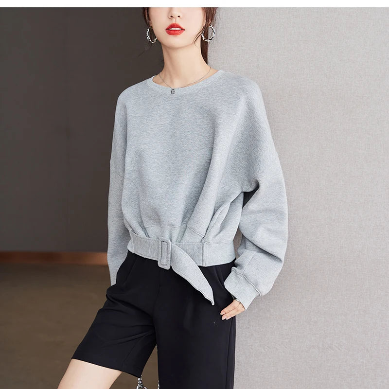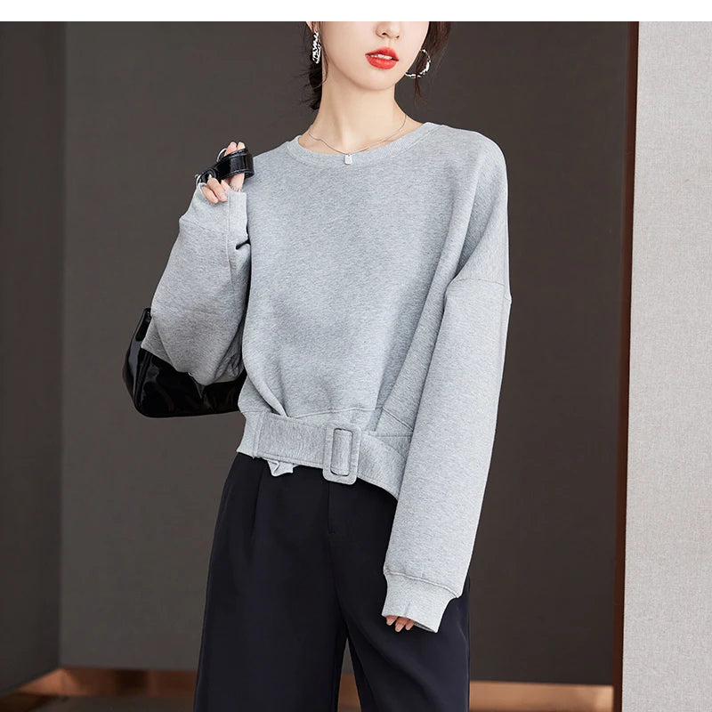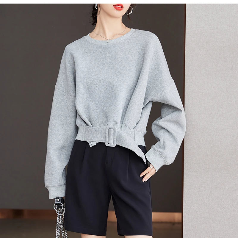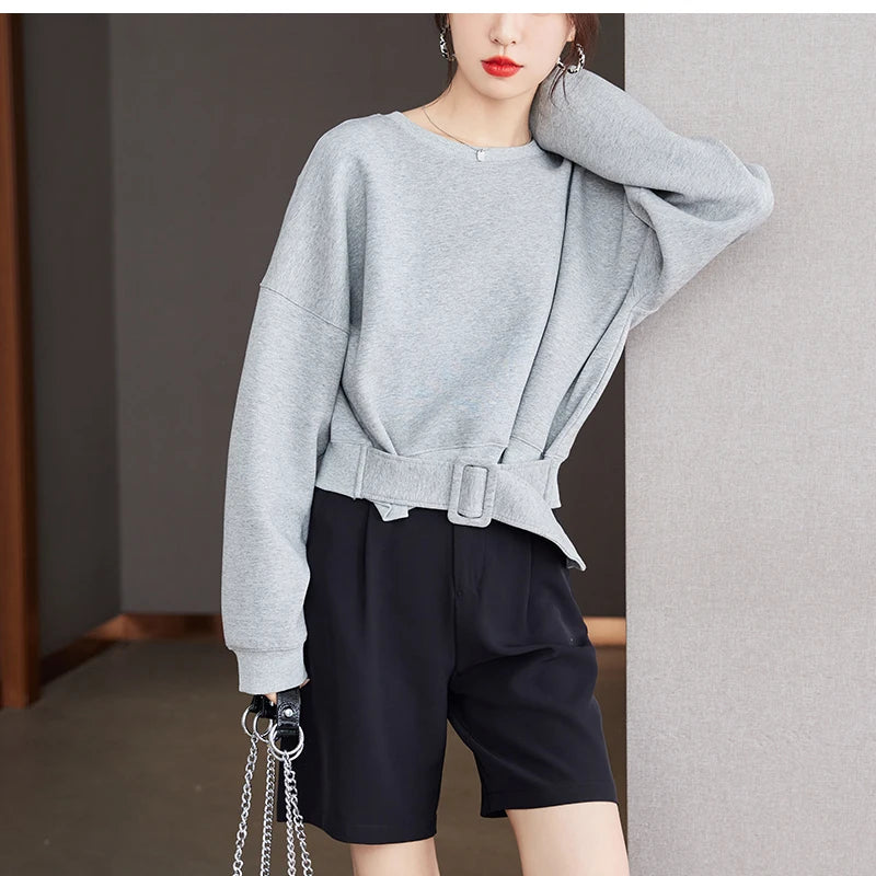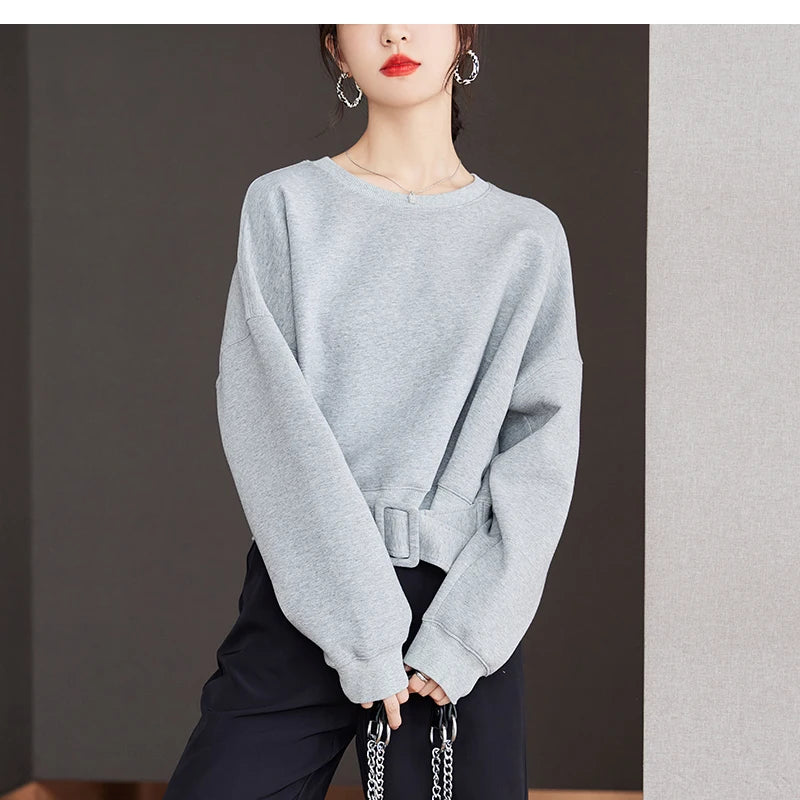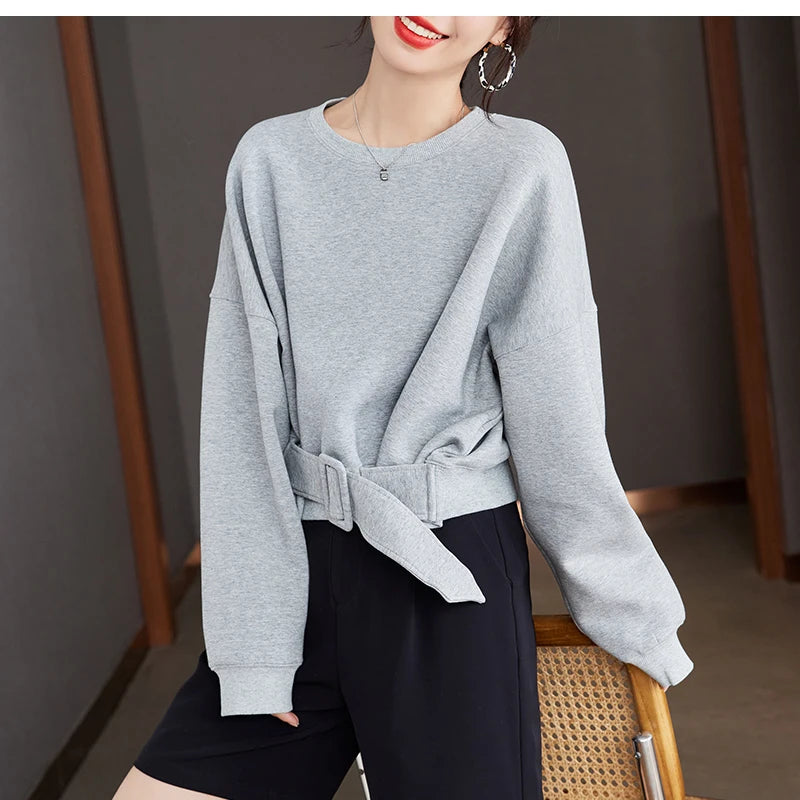 Women Plain Long Sleeve Belt Waist Loose Casual Oversize Pullover Jumper Sweatshirt