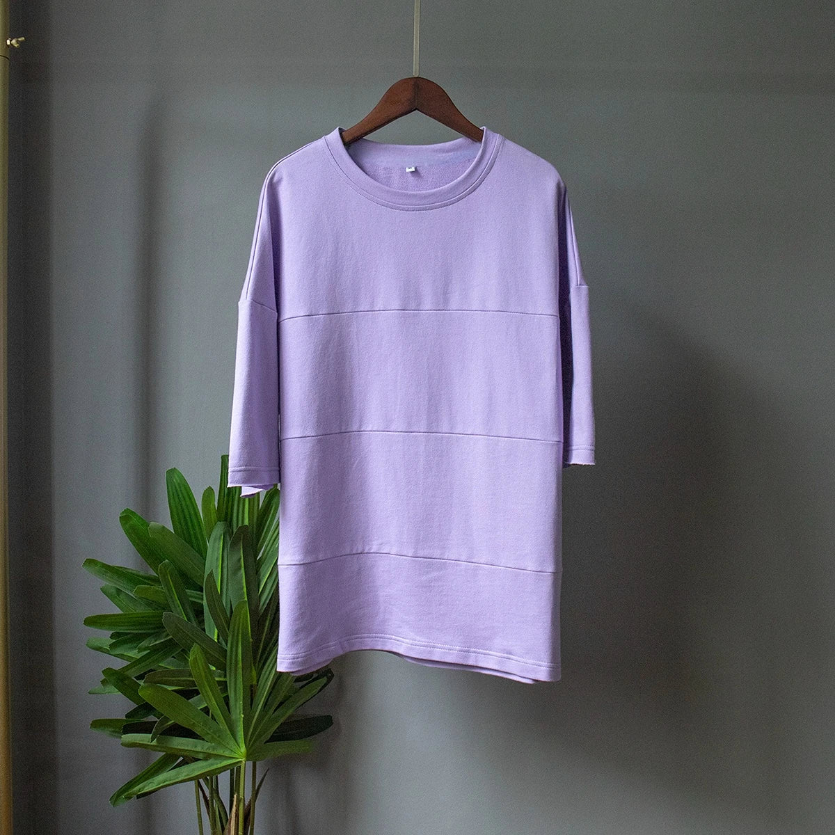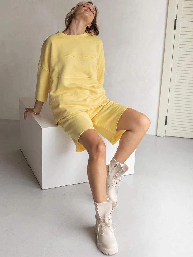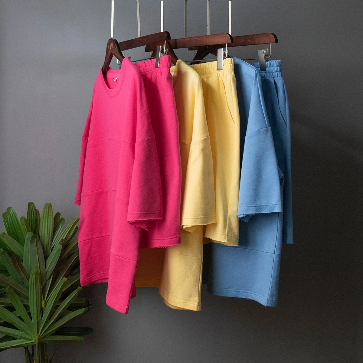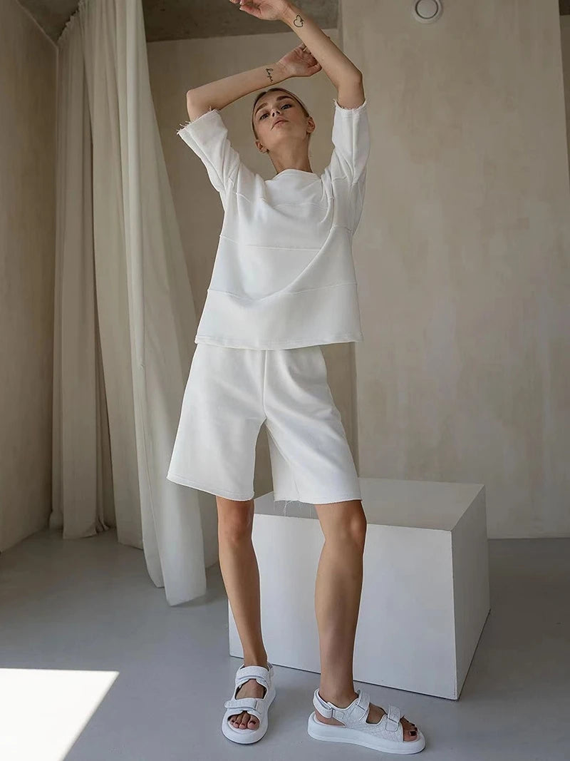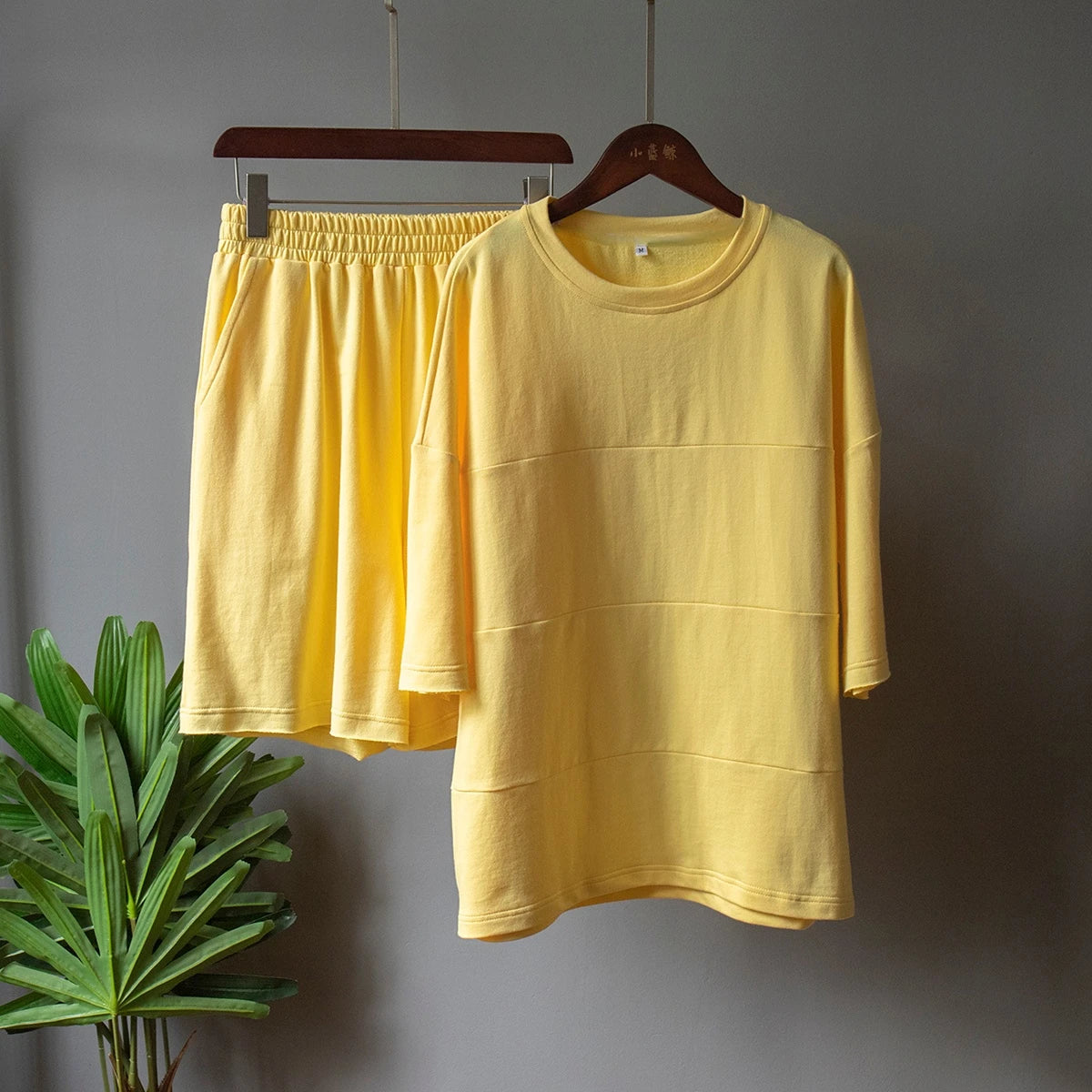 Women's 100% Cotton Shorts Set Half Sleeve Patchwork T Shirts & High Waist Shorts Two Pieces Set