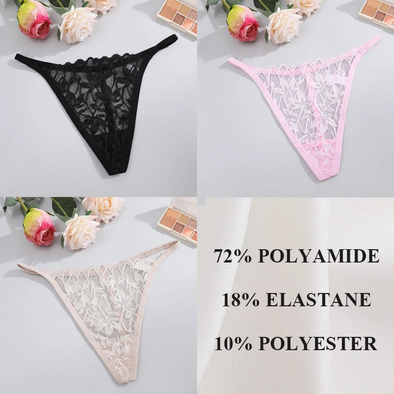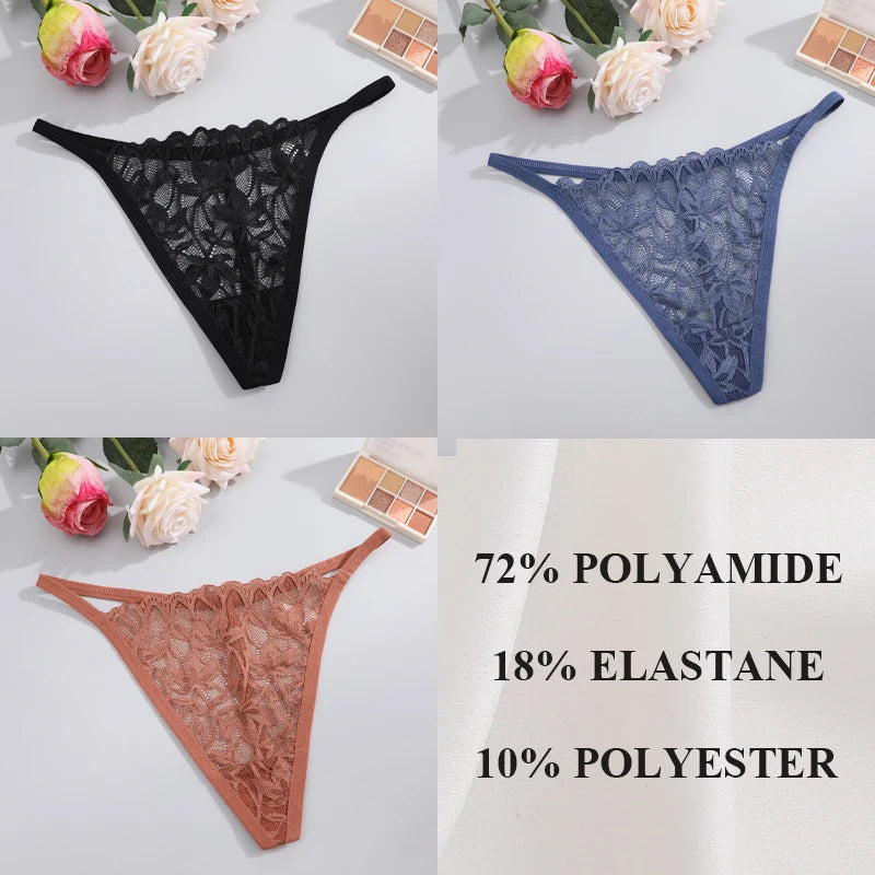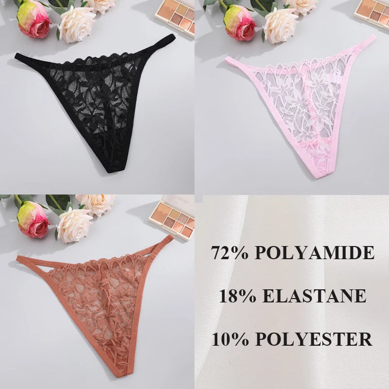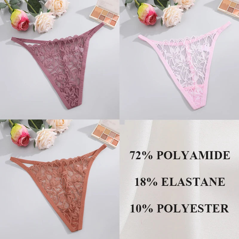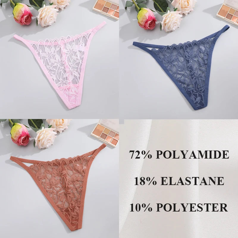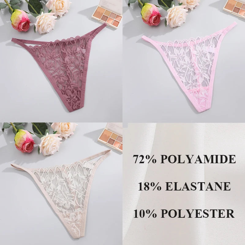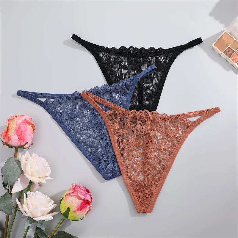 Women's 3Pcs/Set Lace Floral Thongs Hollow Out Underwear Low-Waist Perspective G-string Breathable Lingerie