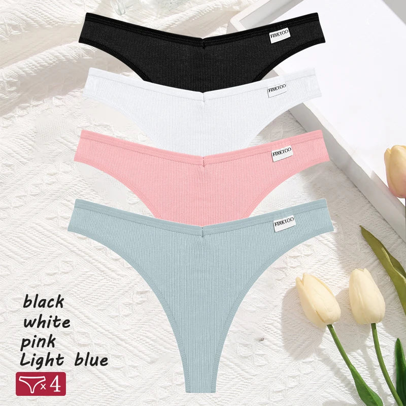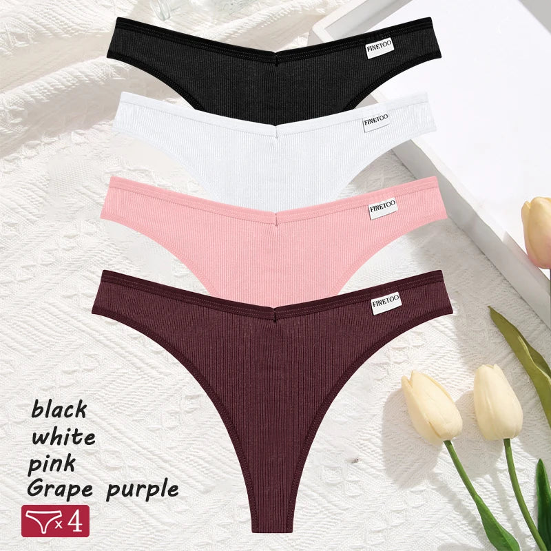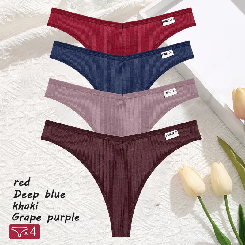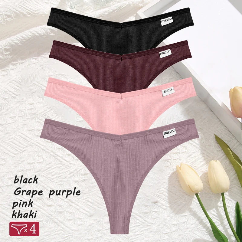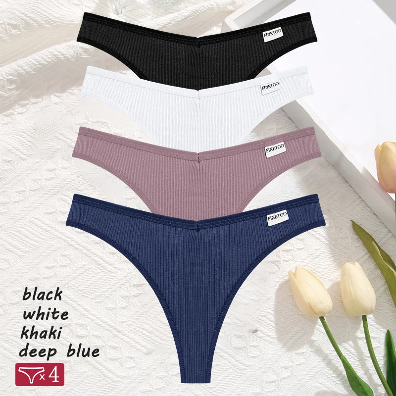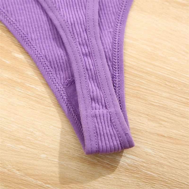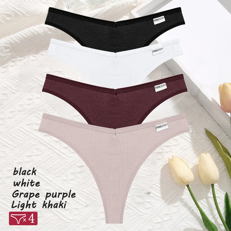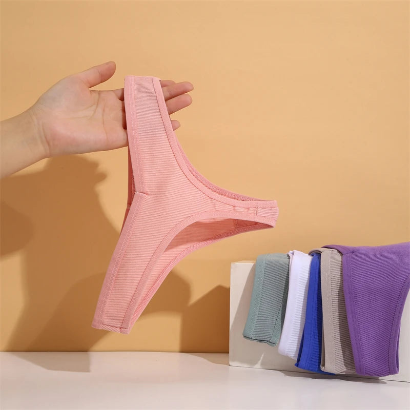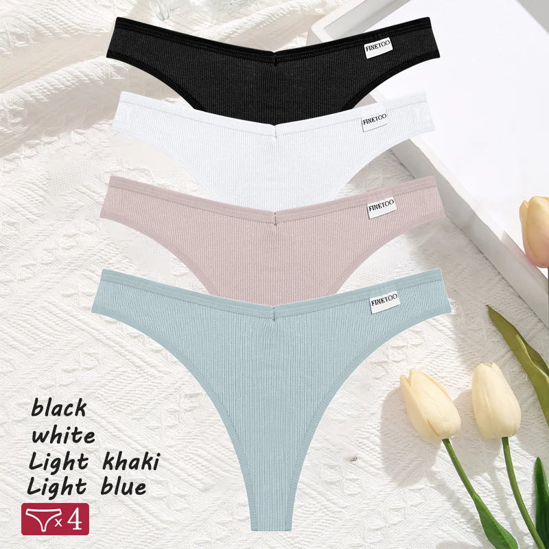Women's 4Pcs Cotton Striped Solid Underwear V Waist G-string Panties Comfortable Soft T-back Bikini