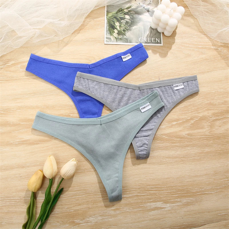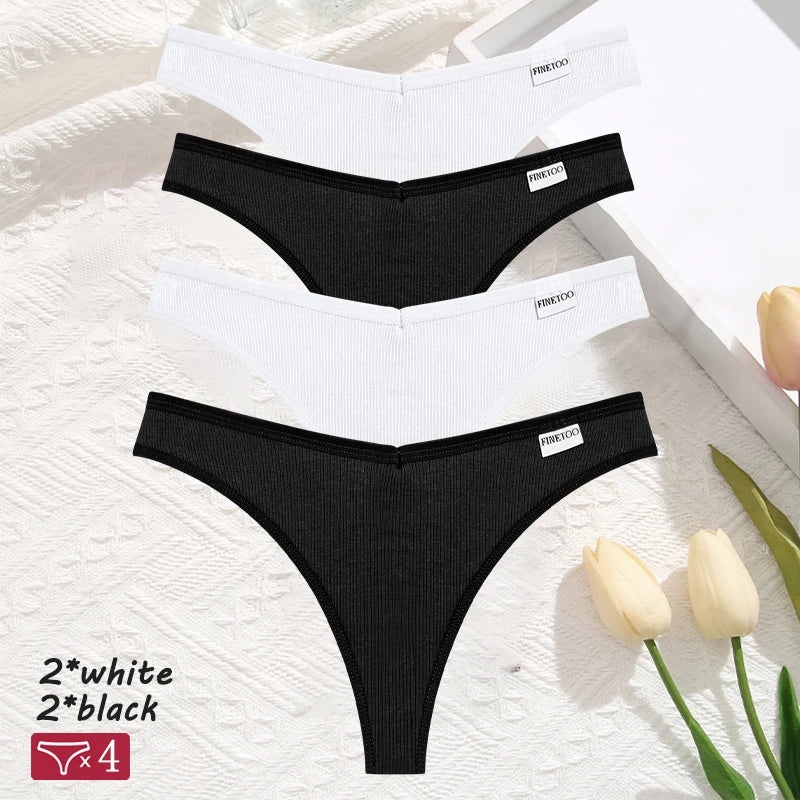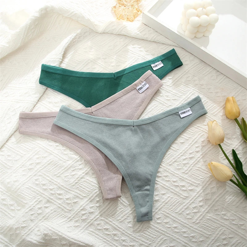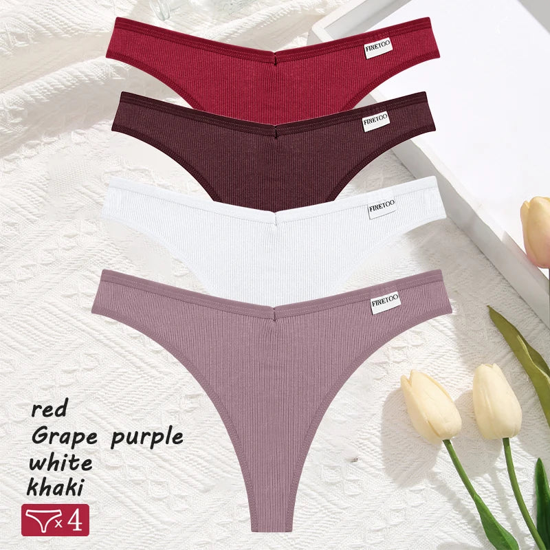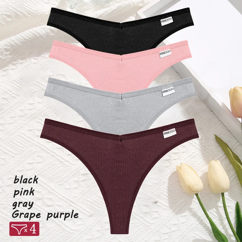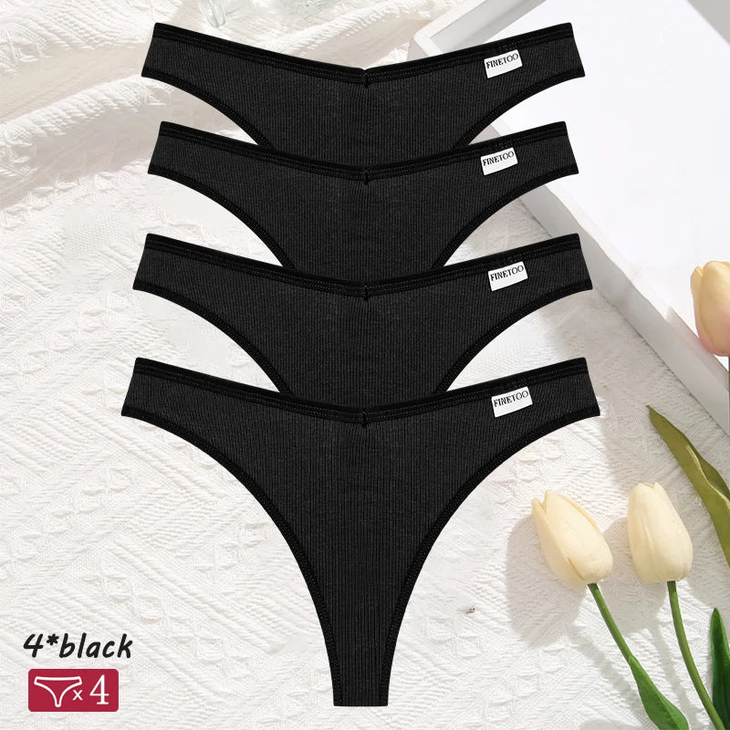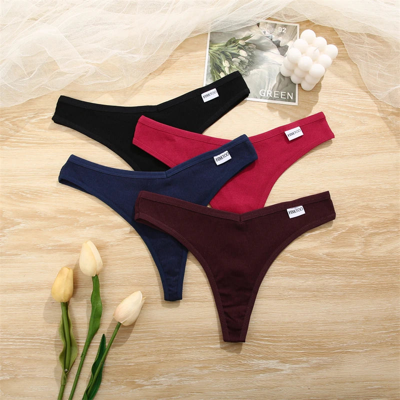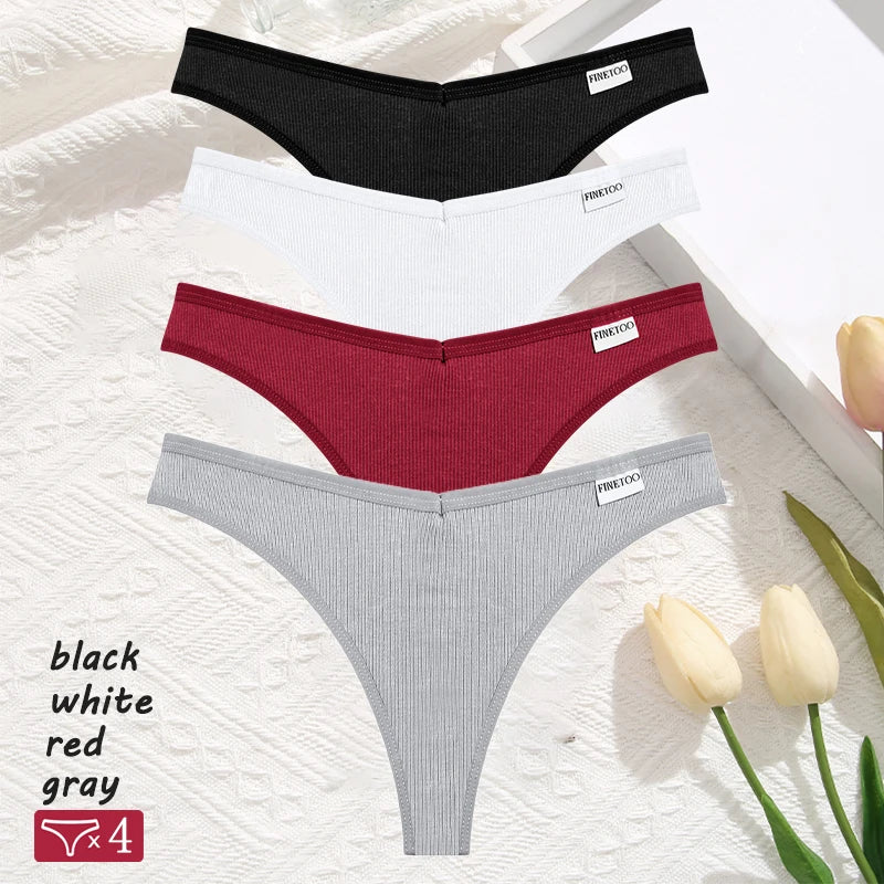 Women's 4Pcs Cotton Striped Solid Underwear V Waist G-string Panties Comfortable Soft T-back Bikini