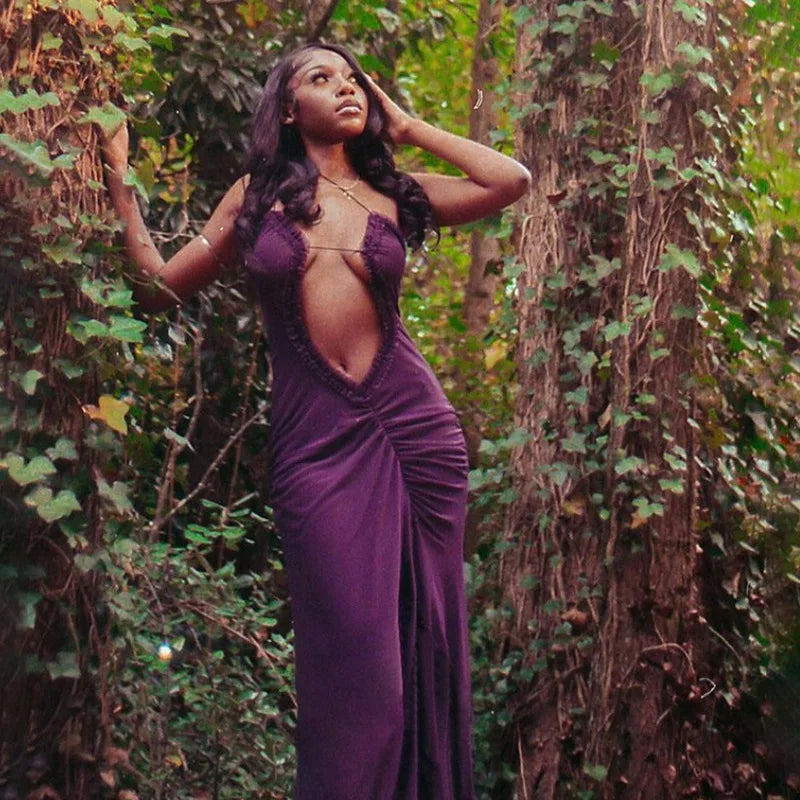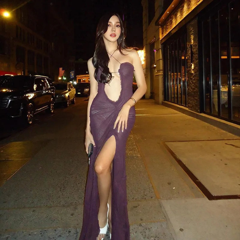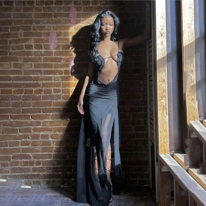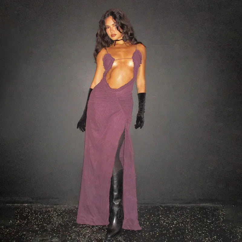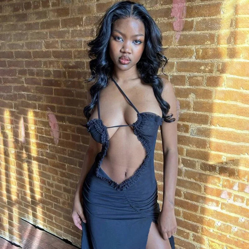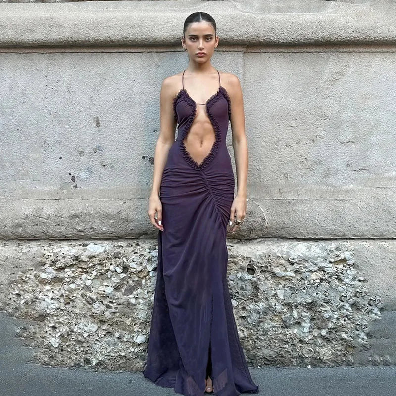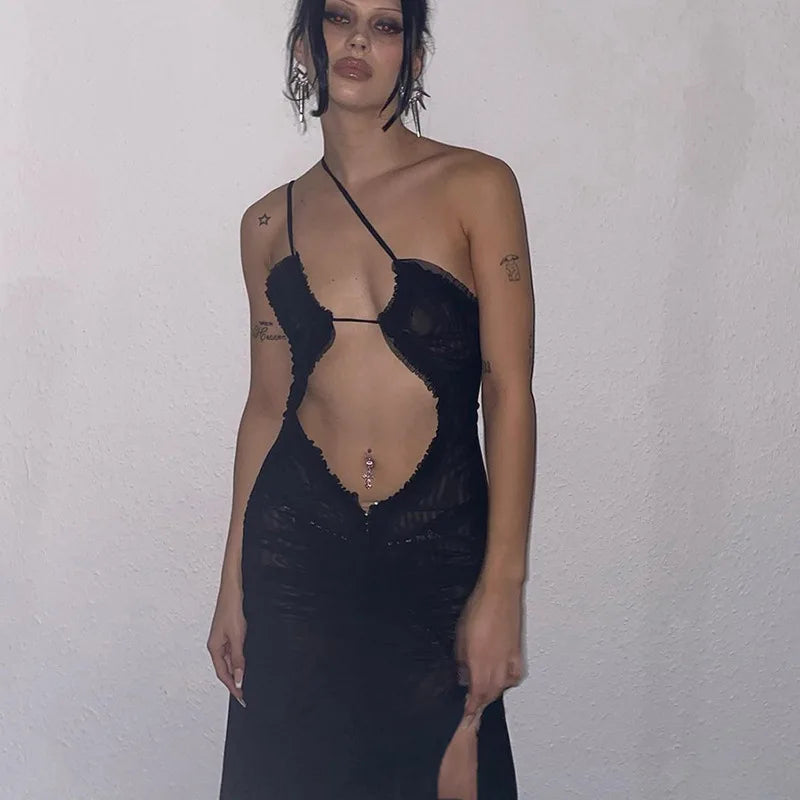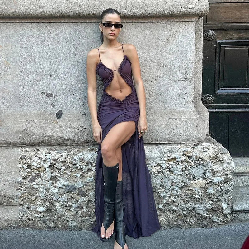 Women's Asymmetric Ruched Cut Out Sleeveless Maxi Party Slip Dress