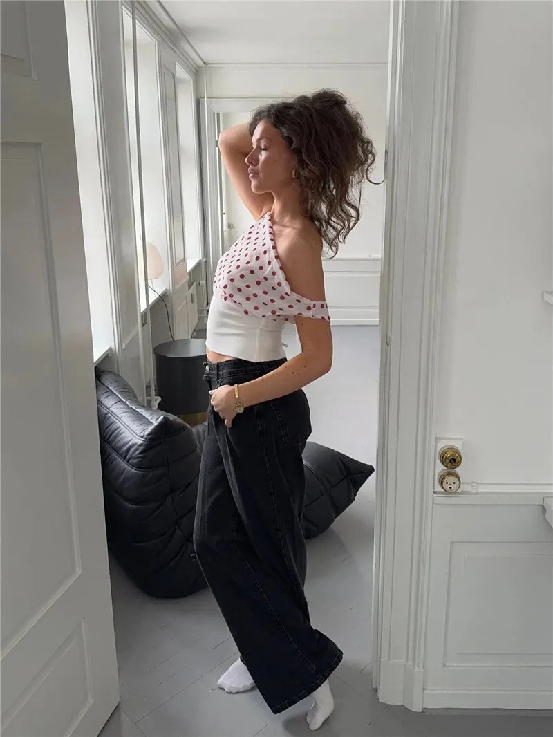 Women's Backless Polka Dot Crop Top Summer New Oblique Shoulder Sleeveless Tank Top