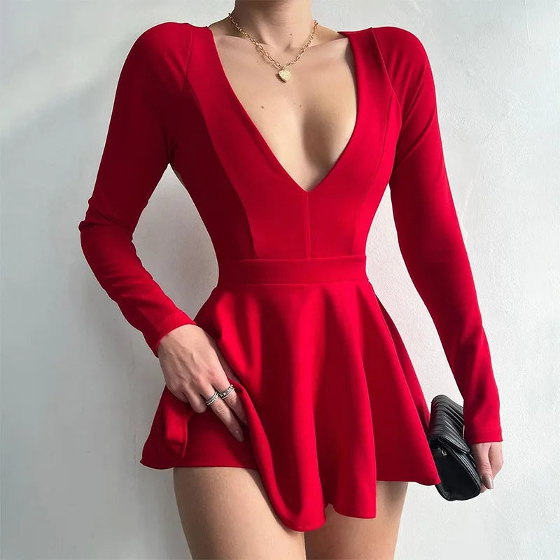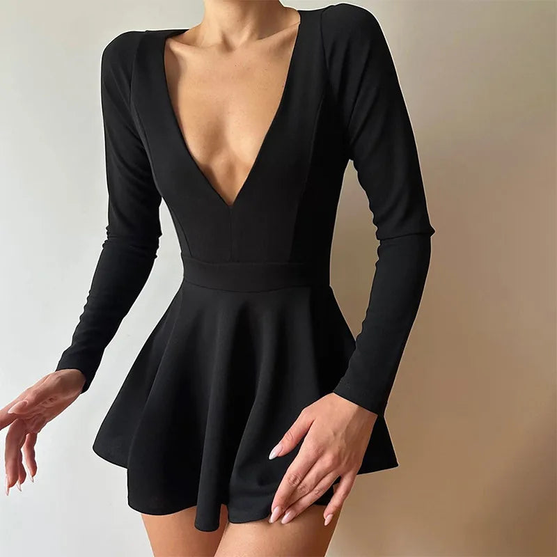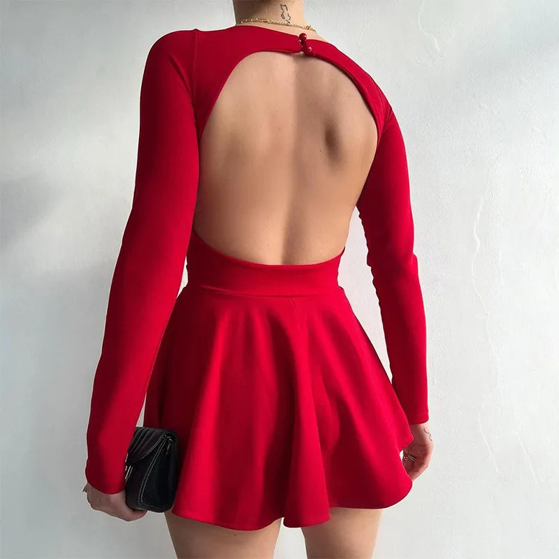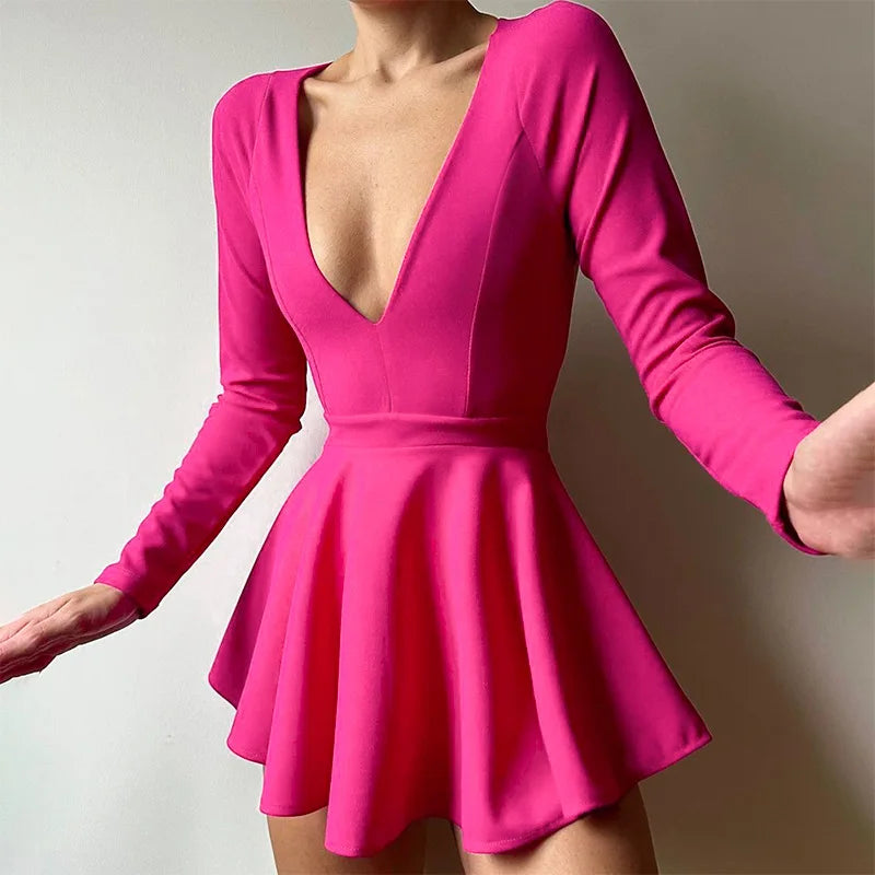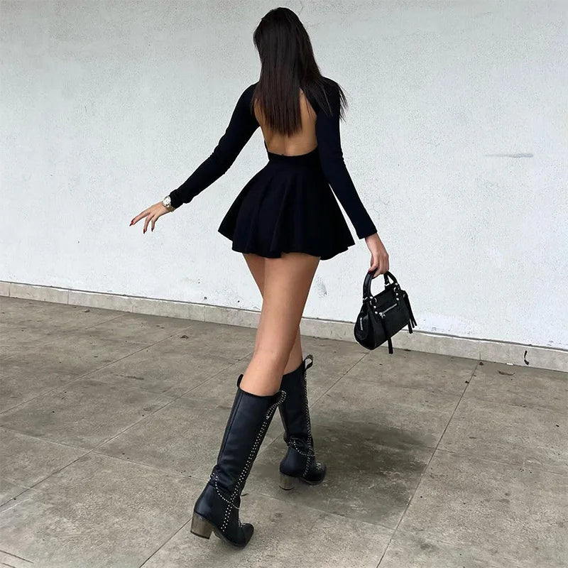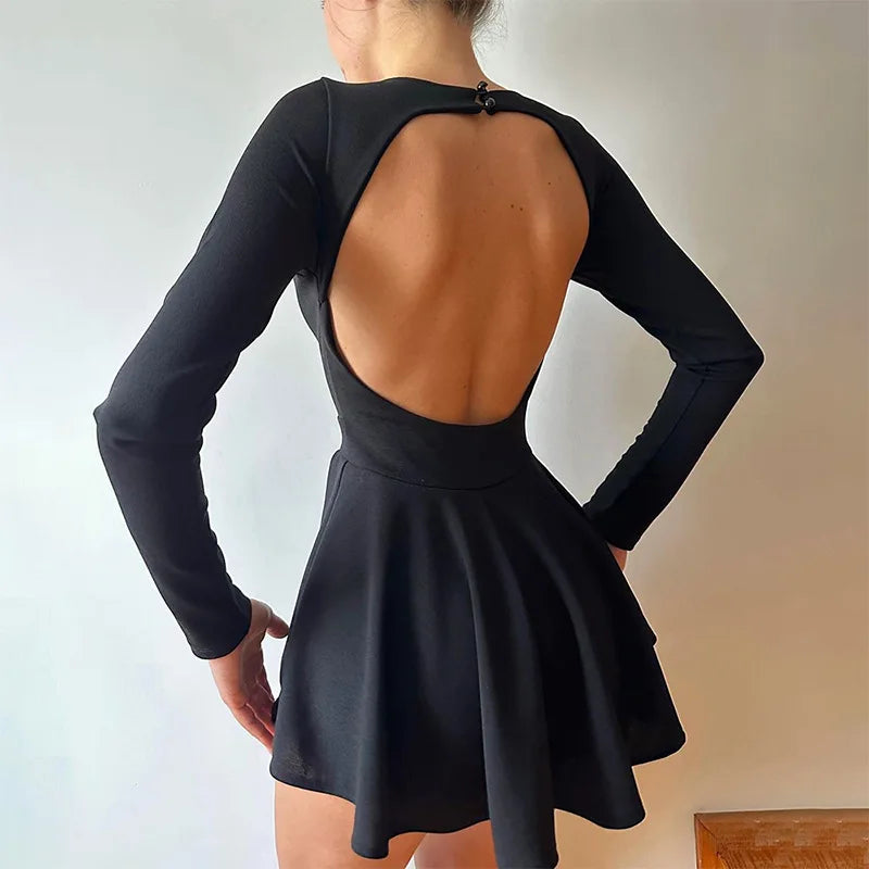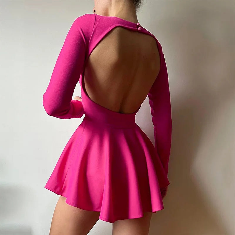 Women's Backless V Neck A-Line Mini Dress - Long Sleeve Pleated Dress