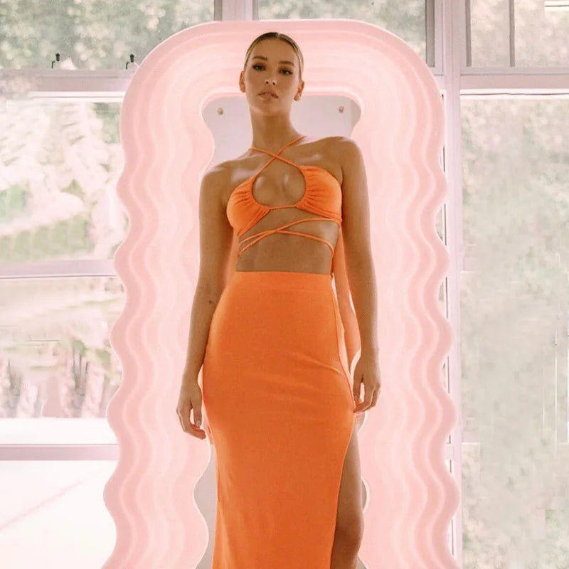 Women's Bandage Cut Out Halter Neck Top and Skirt Set Gathered Split Two Piece Set