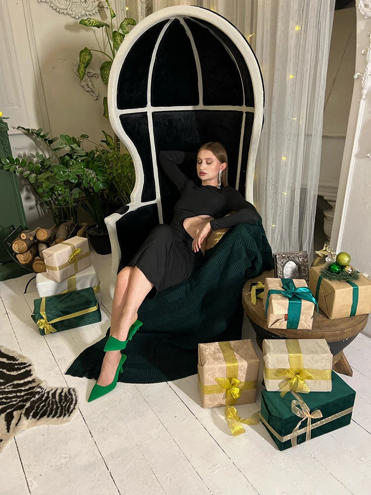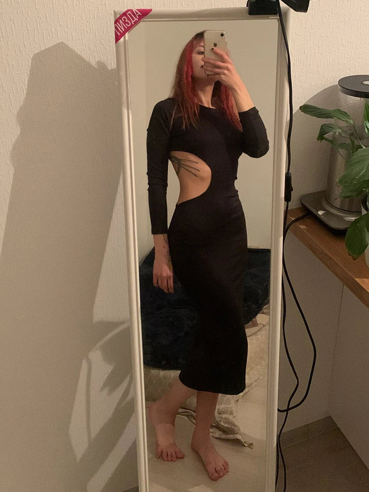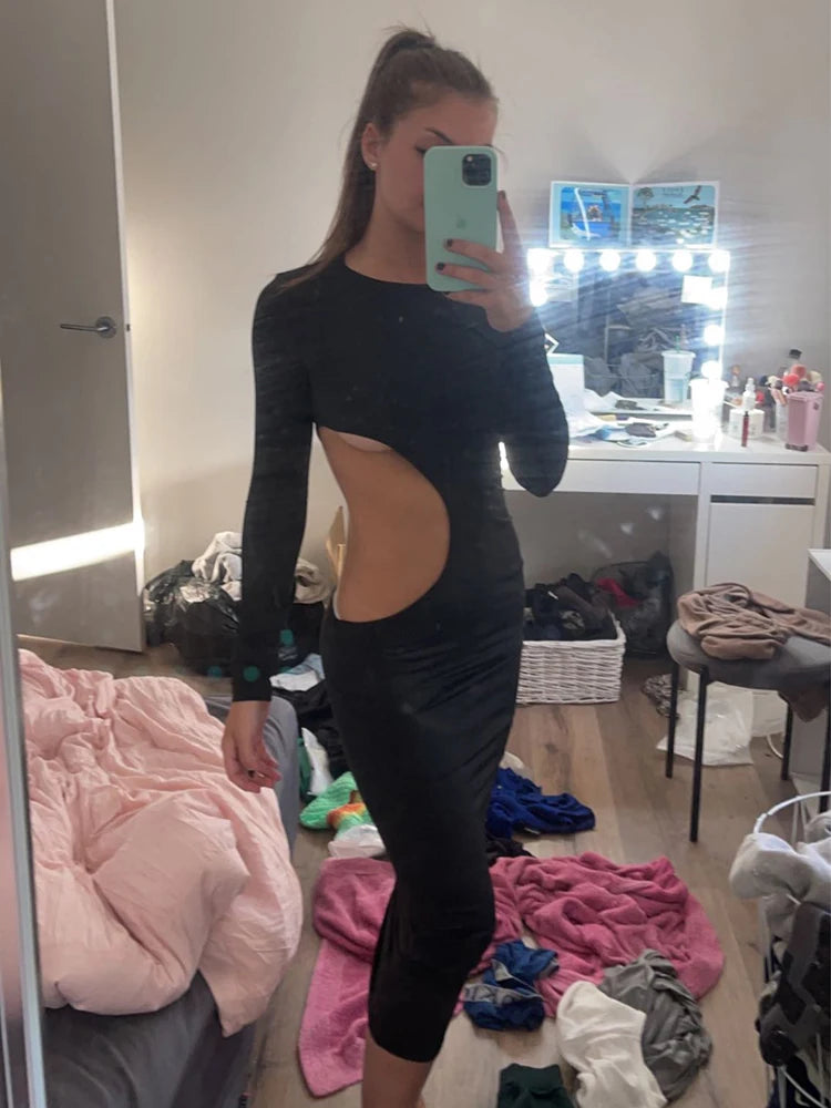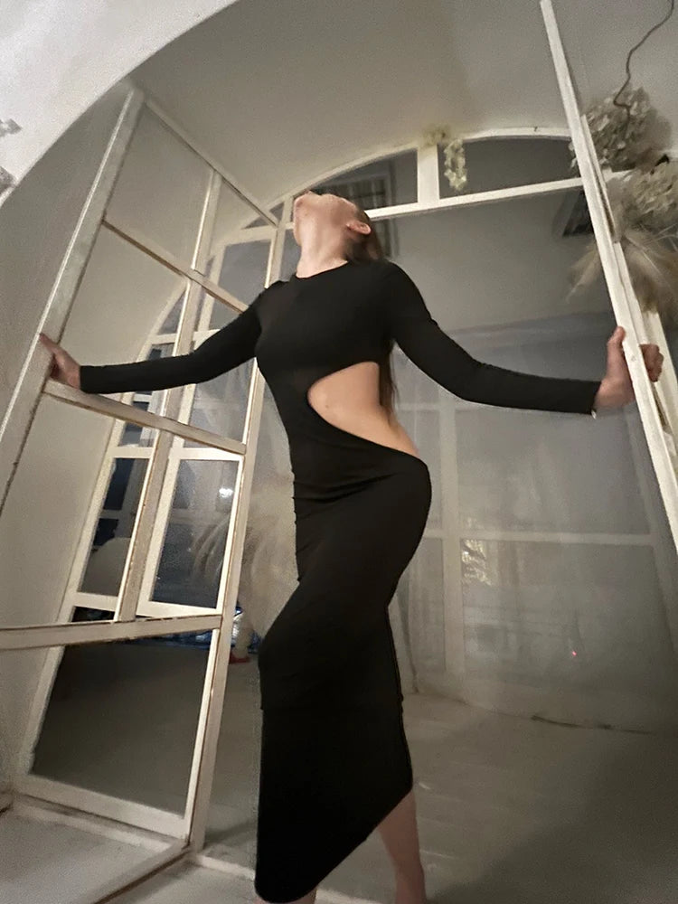 Women's Black Cut Out Round Neck Long Dress - Long Sleeve Dress
