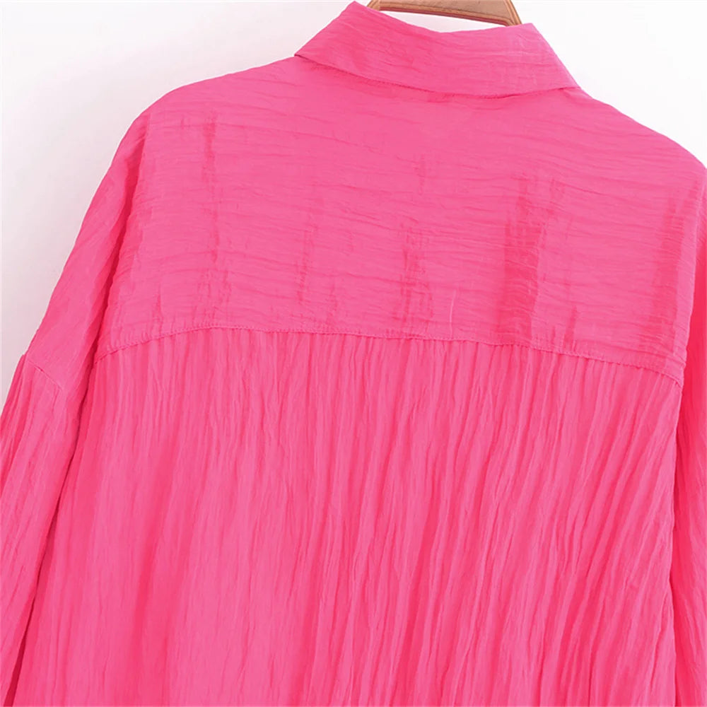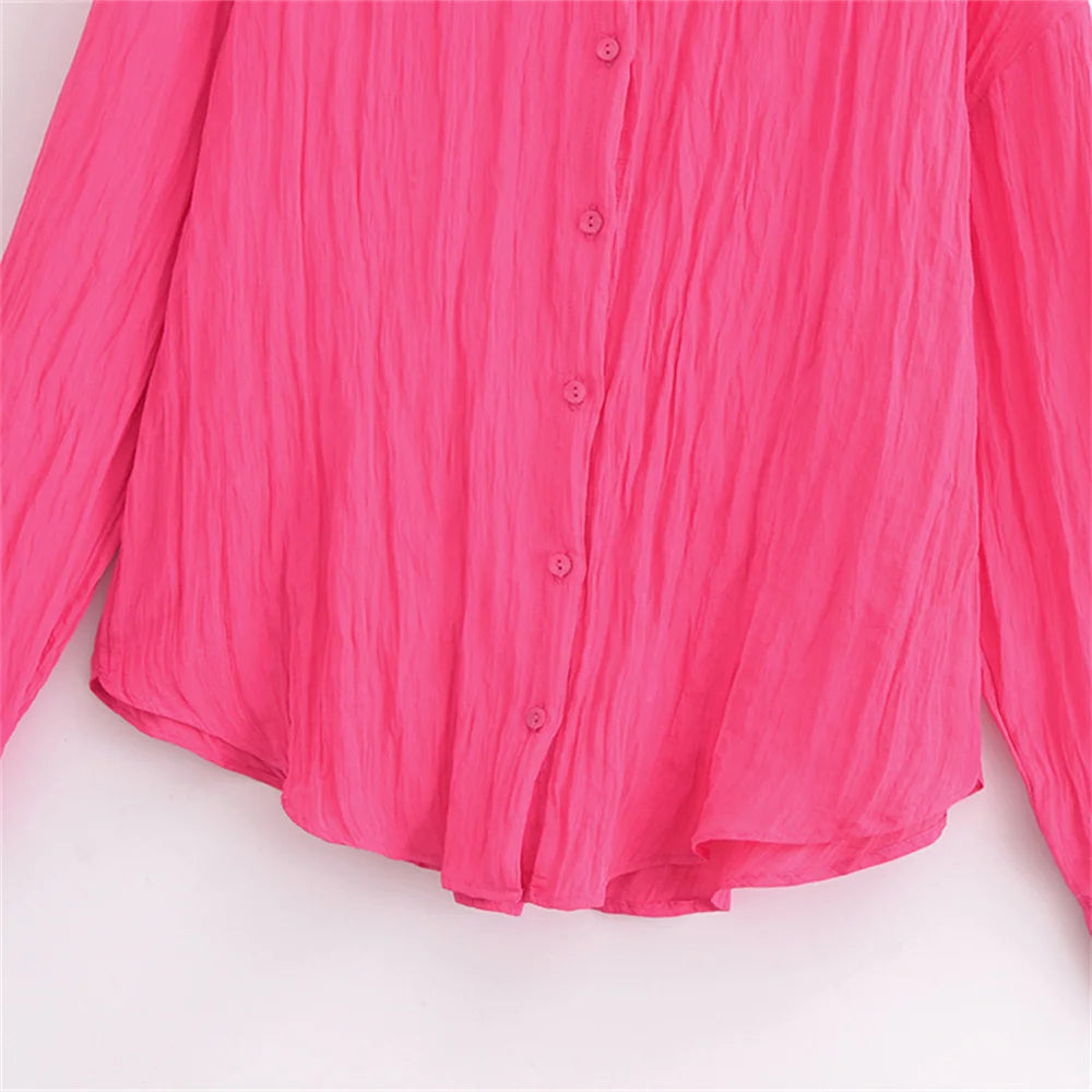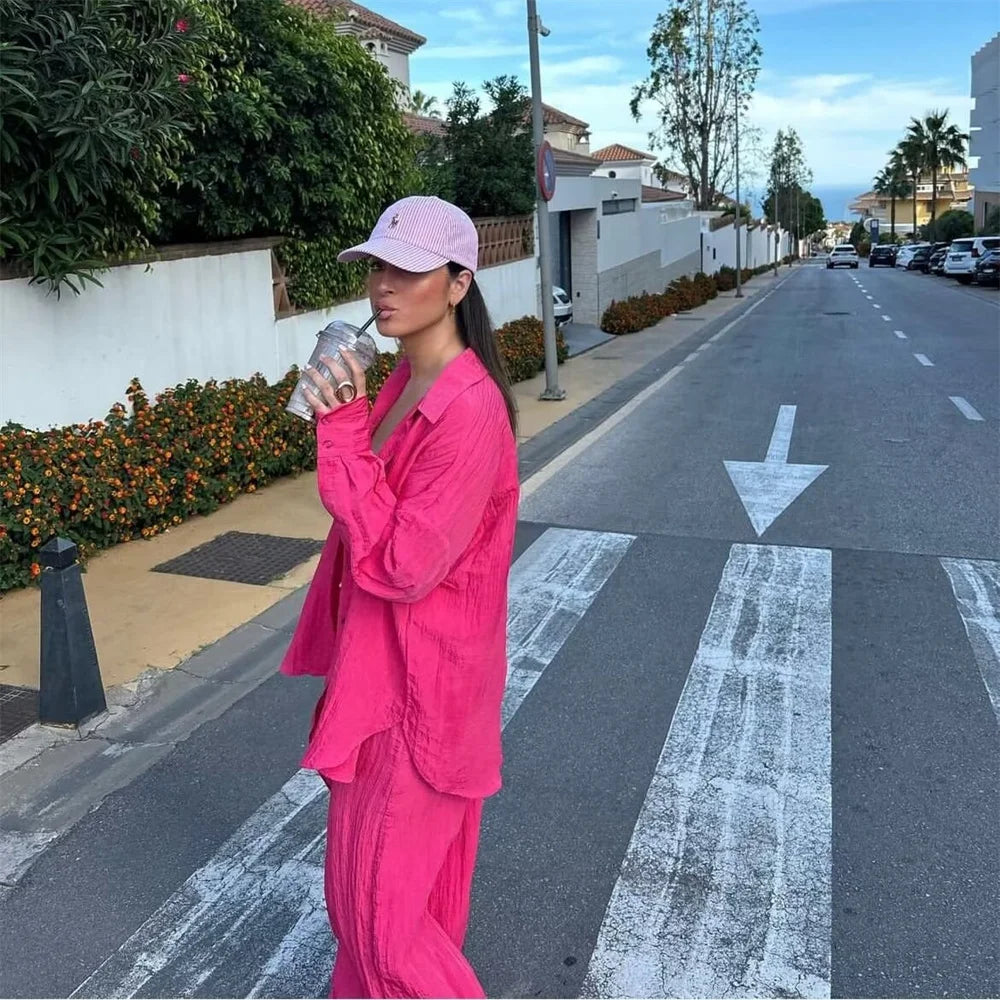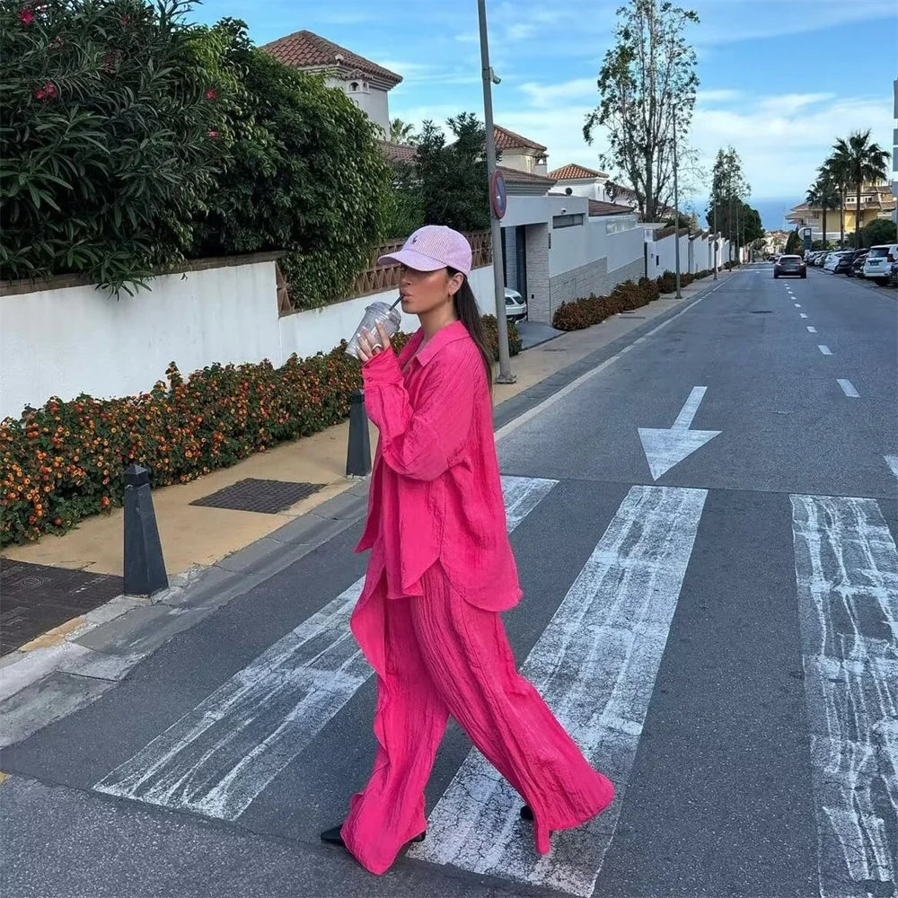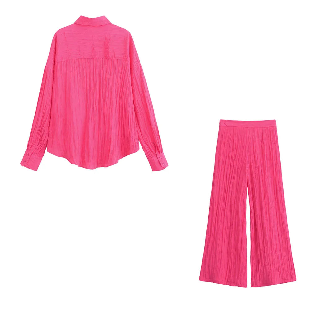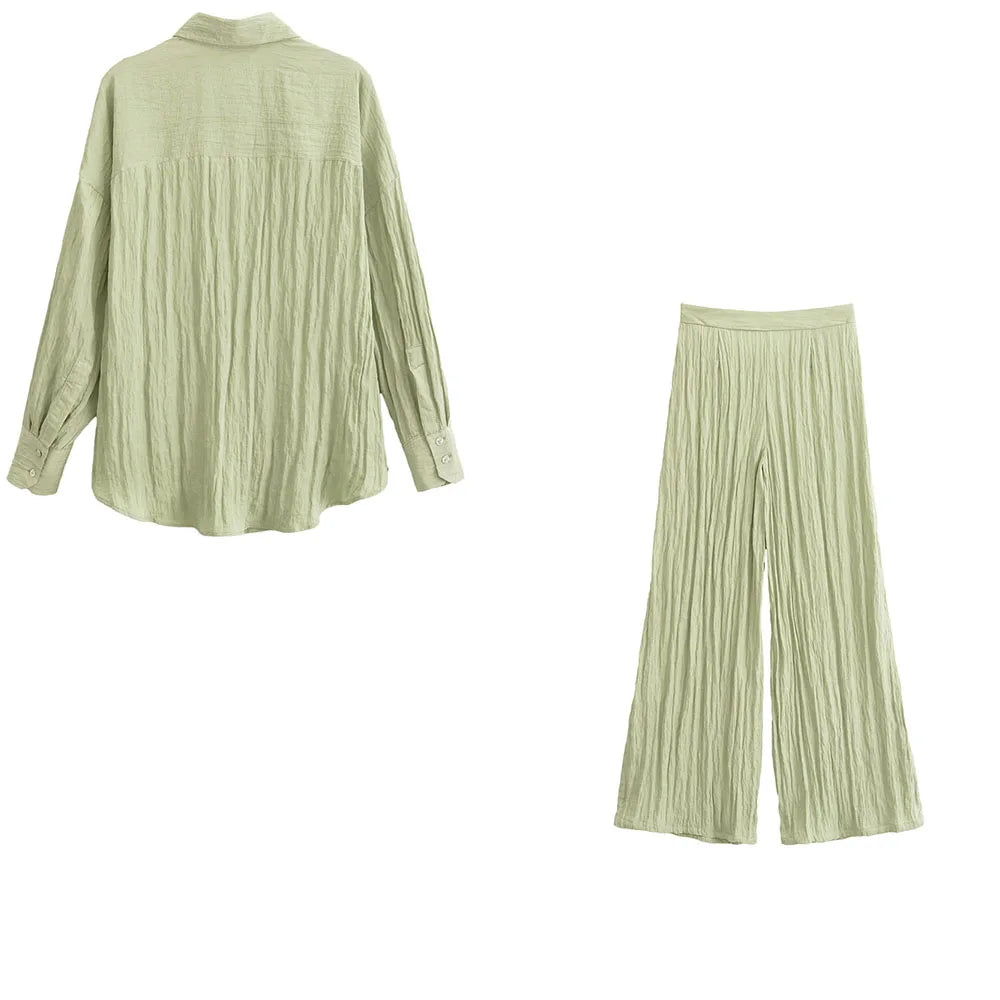 Women's Casual Solid Colour Lapel Wrinkle Effect Shirt And Trousers Set