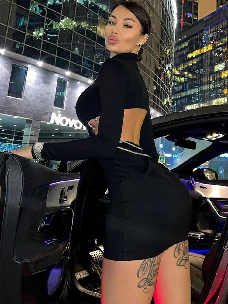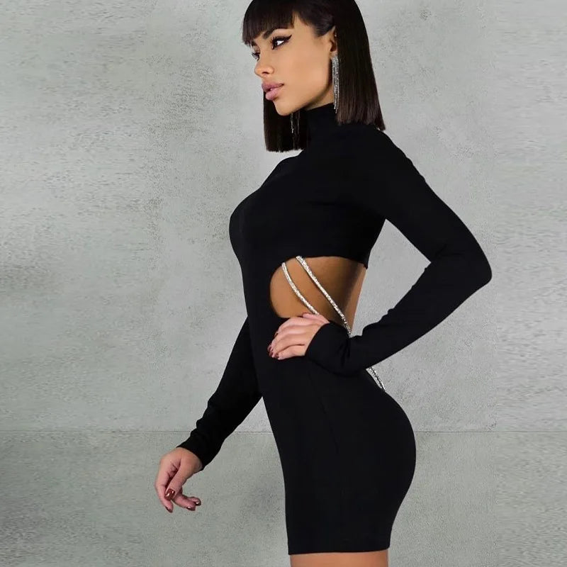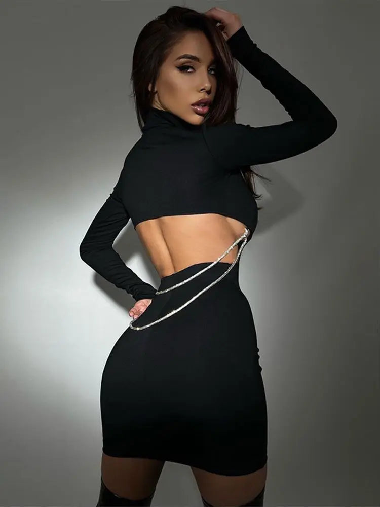 Women's Chain Backless Cut Out Bodycon Dress - Elegant Long Sleeve Mini Dress