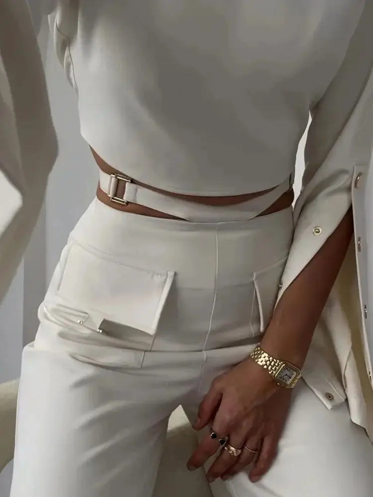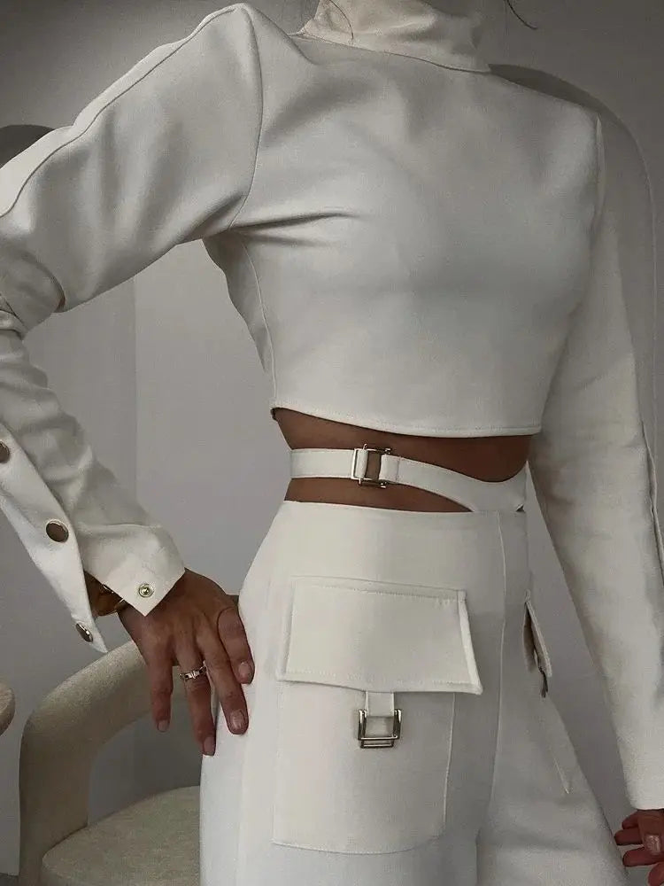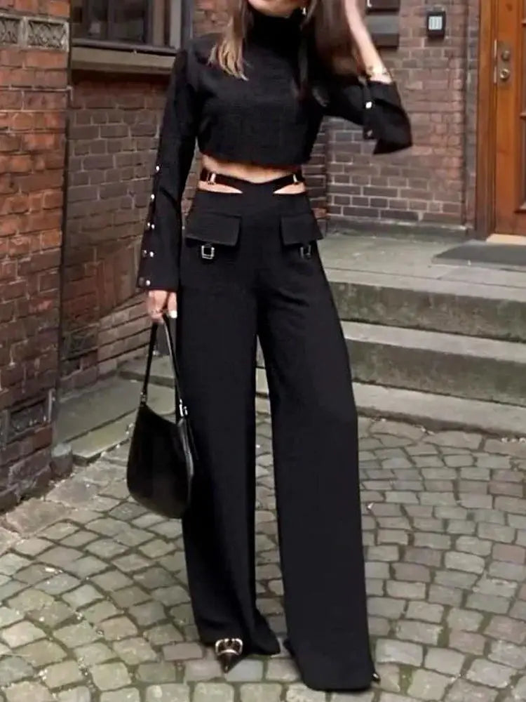 Women's Crossover Two Piece Set with High Collar Long sleeves Wide Leg Pants Set