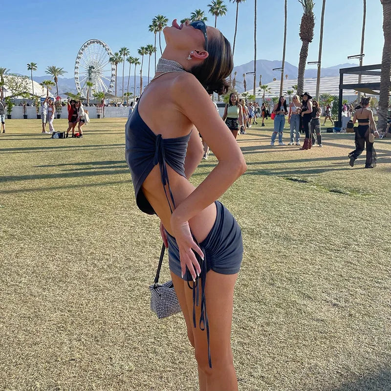 Women's Cut Out Top and Skirt 2 Piece Set Outfit Drawstring Co-ord Sets Matching Set