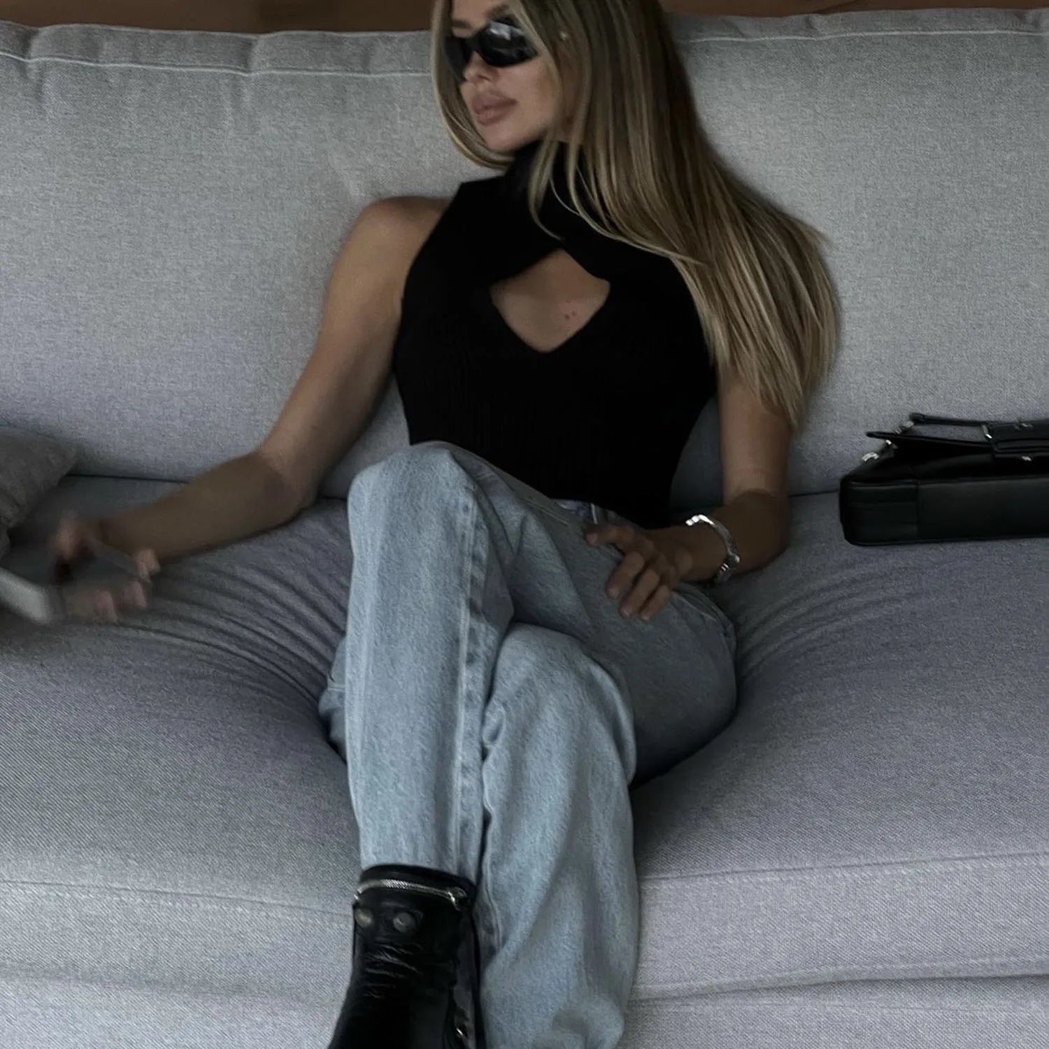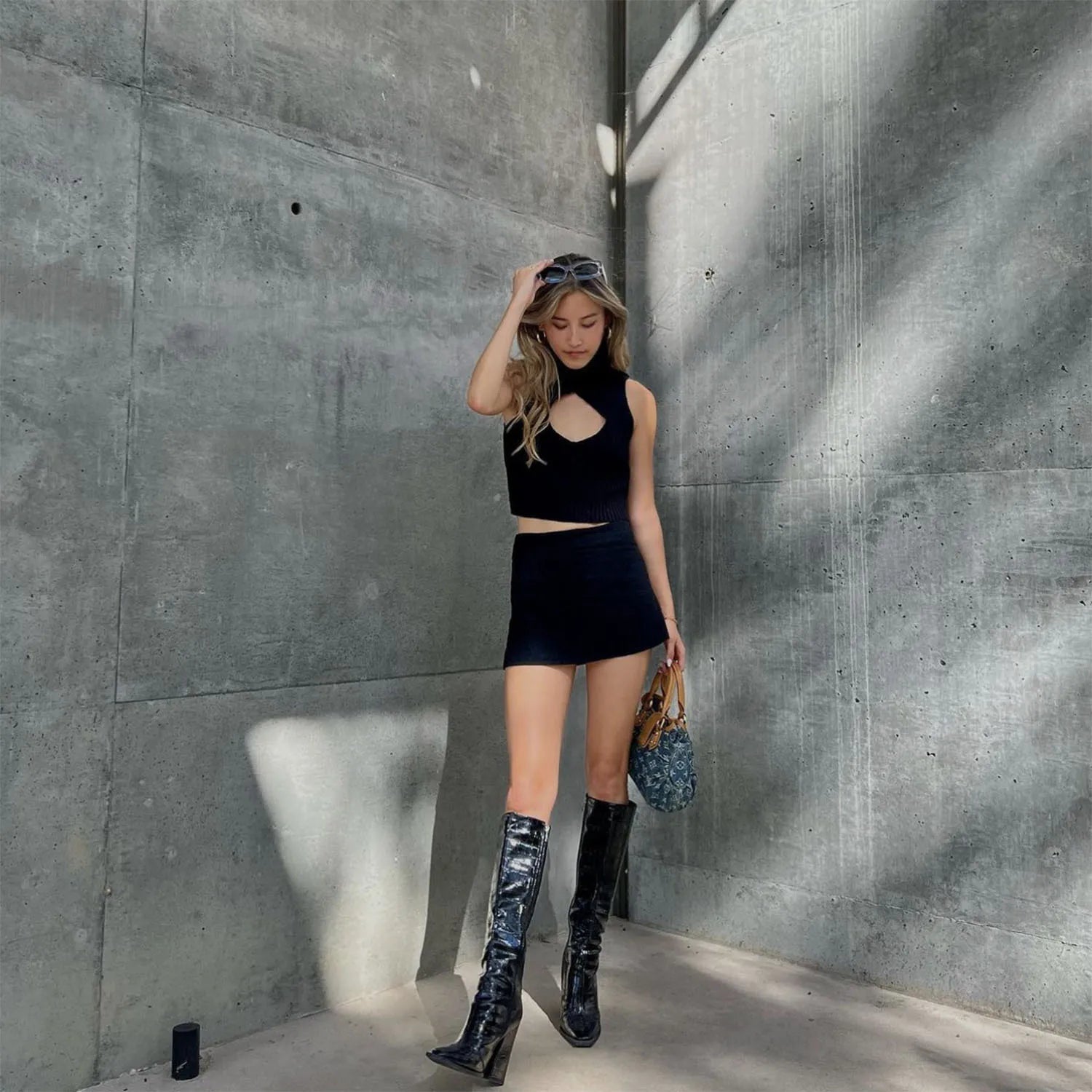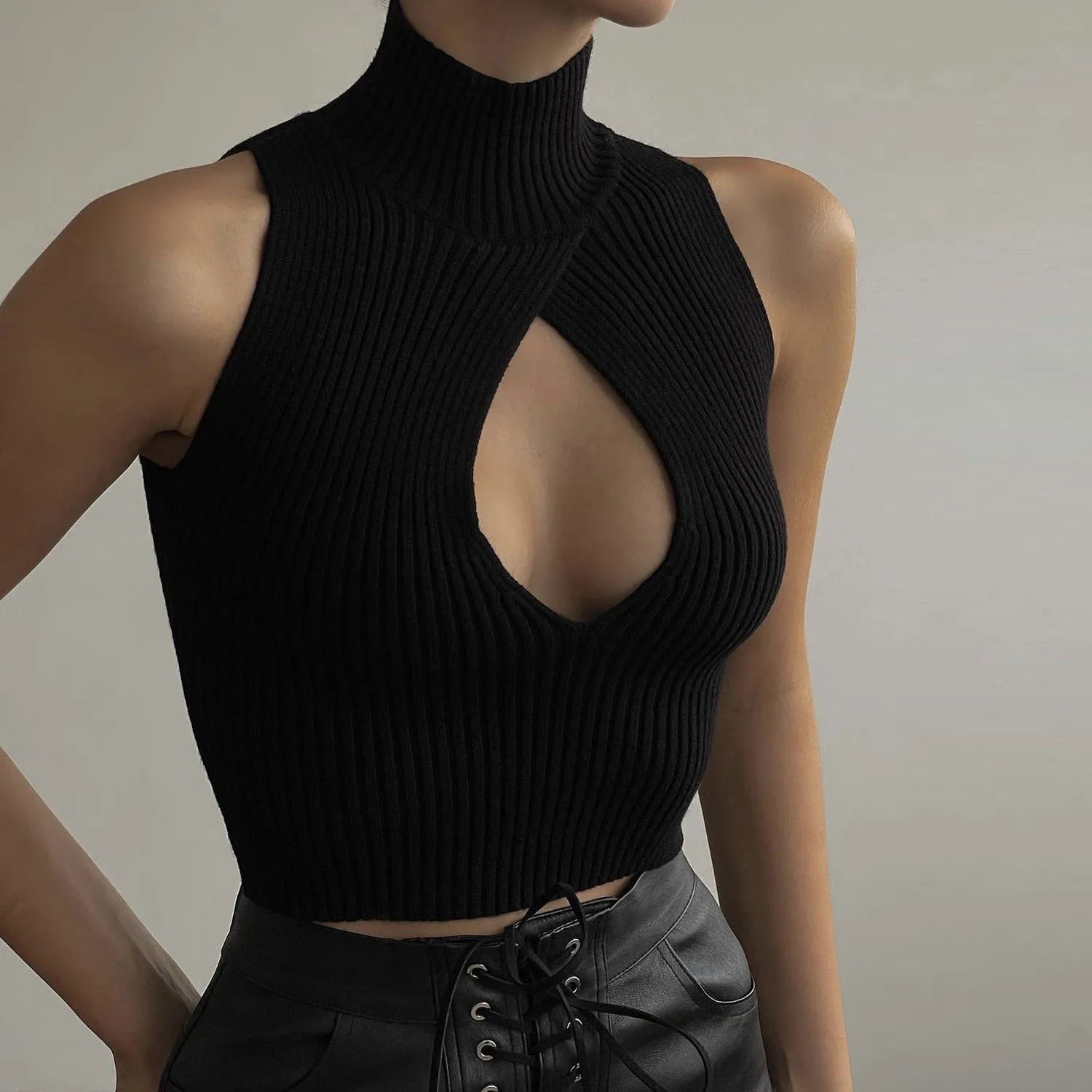 Women's Cut Out Top - Sleeveless Knitted Short Tank Top Turtleneck