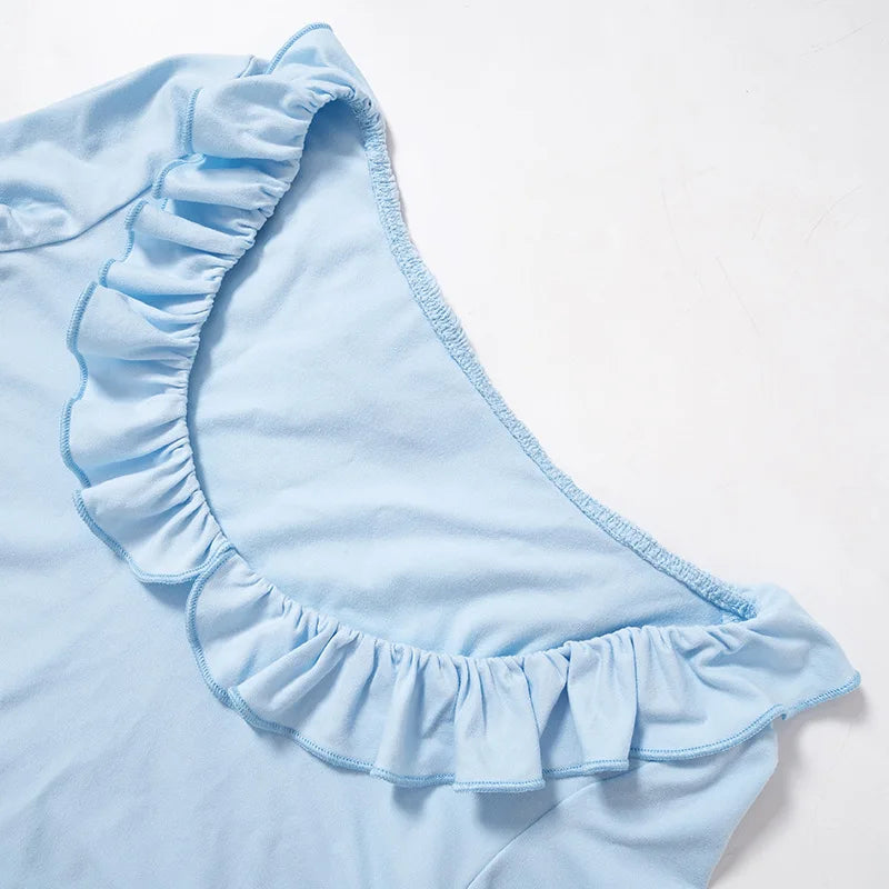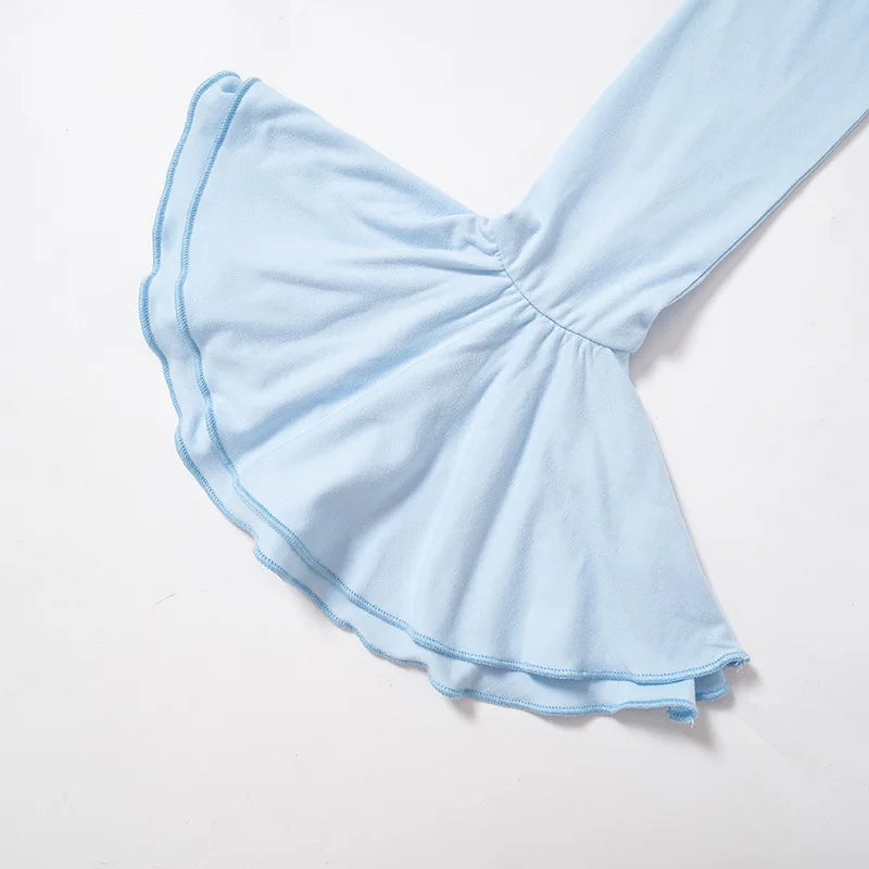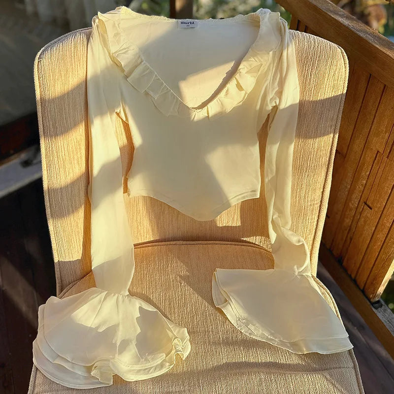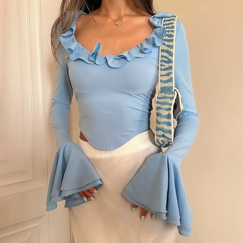 Women's Elegant Frill Ruffle Detail Flare Sleeve Tops Low Plunge Neck Slim Tie Back Cropped Top