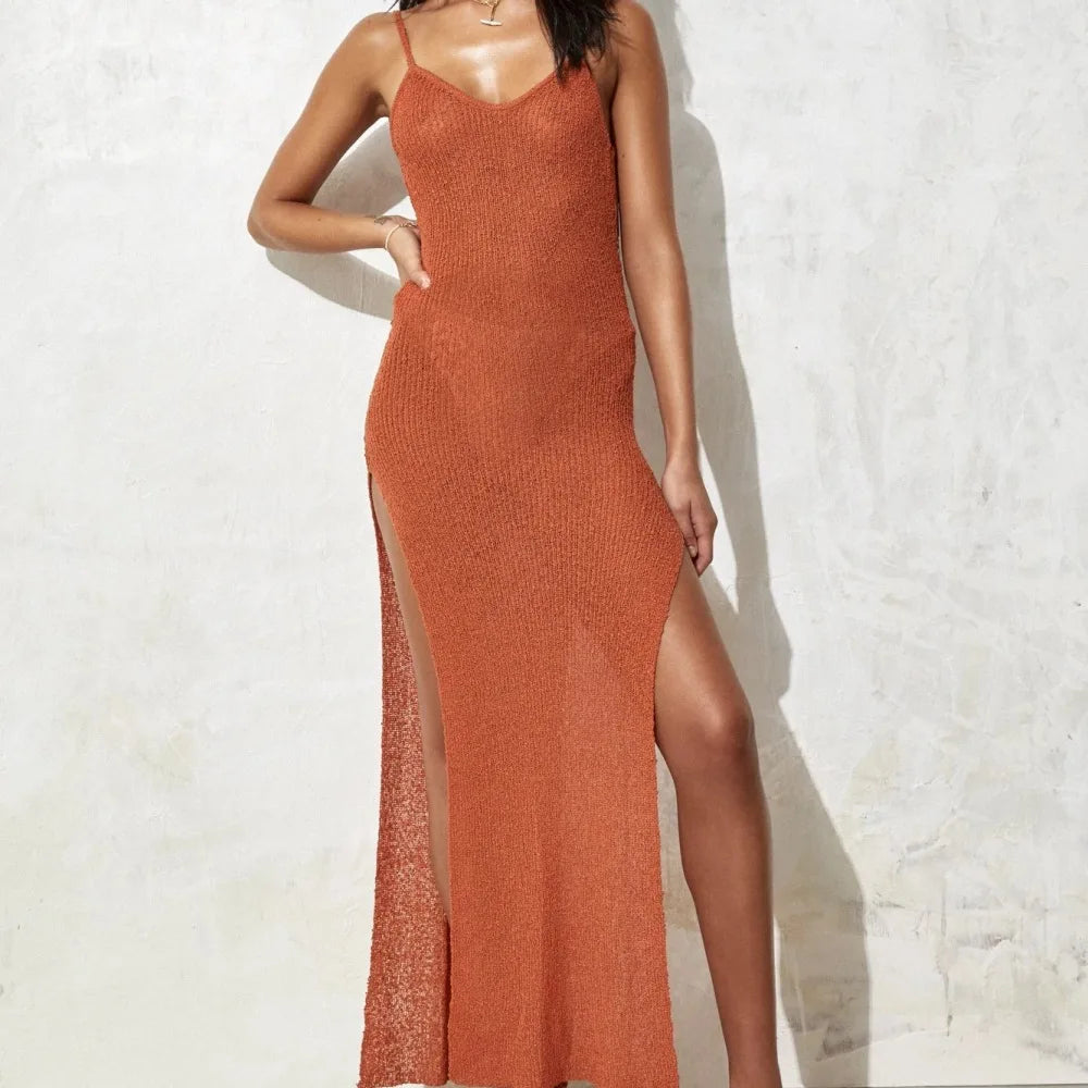 Women's Elegant Knitted Slit Long Dress Outfit - Sleeveless Backless See Through Dress