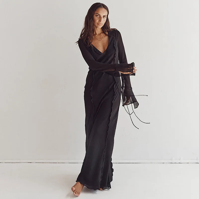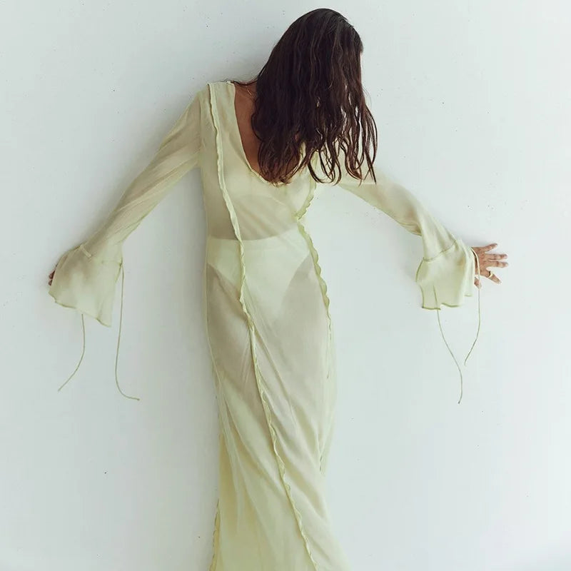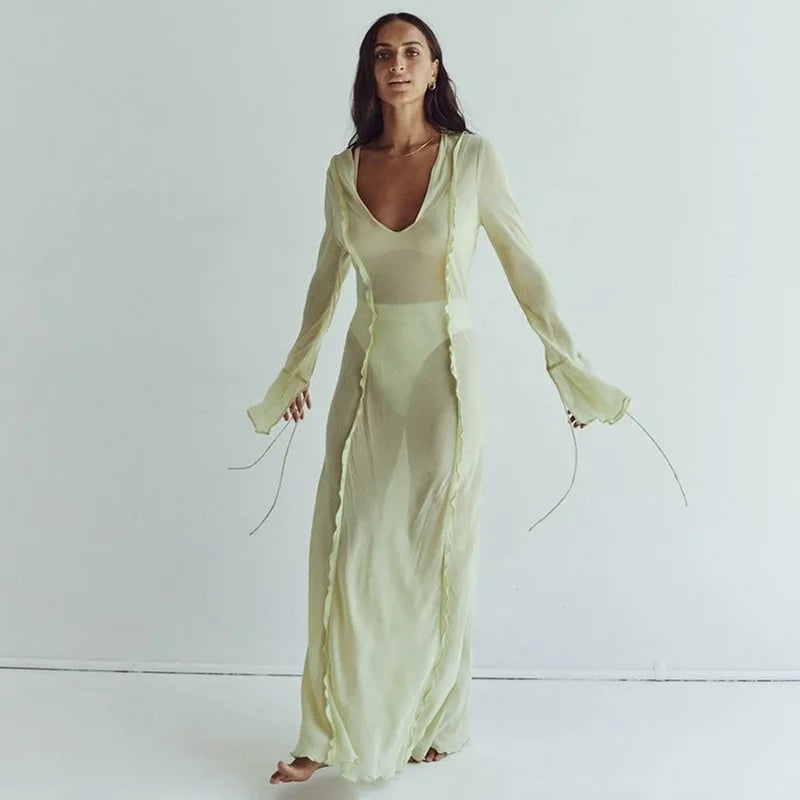 Women's Elegant Mesh Transparent Maxi Flare Sleeve Cover-Ups Loose Beach Dress