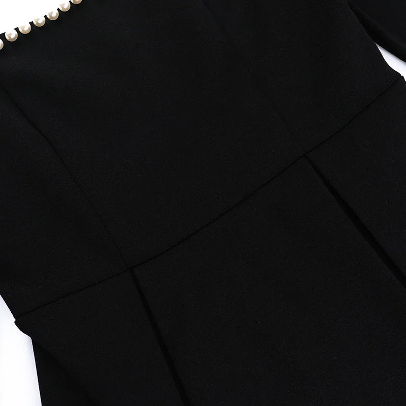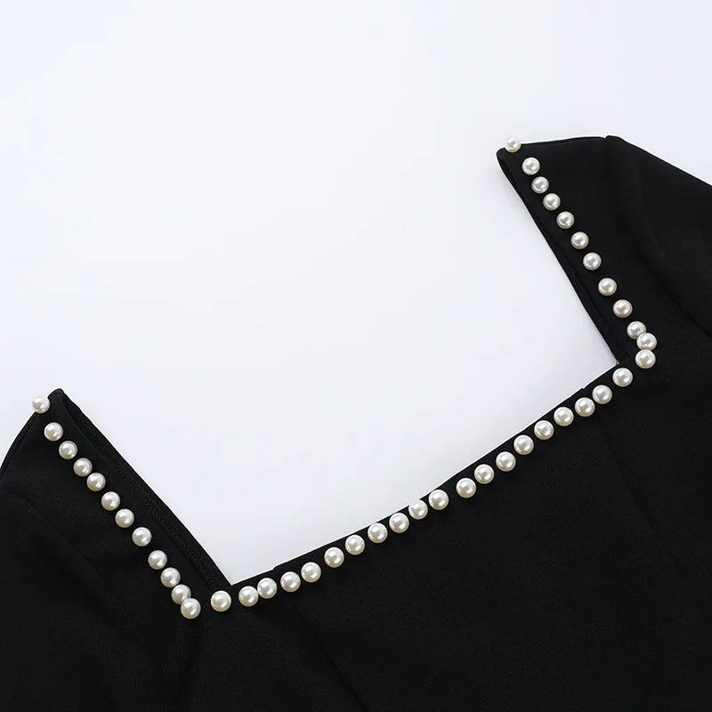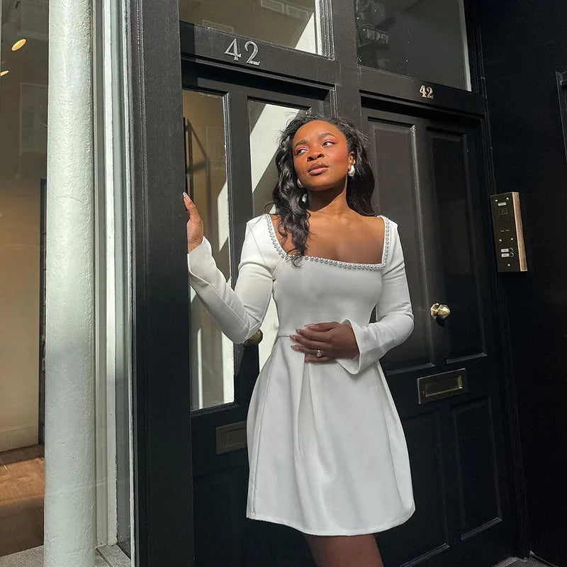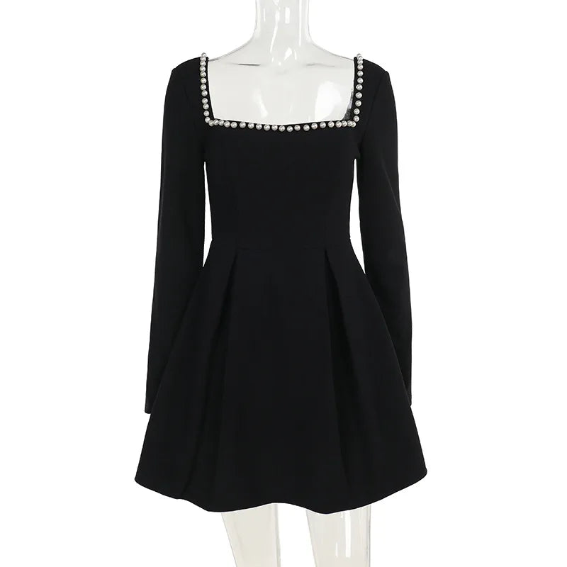 Women's Elegant Pearl Square Neck Long Sleeve Mini High Waist Dress